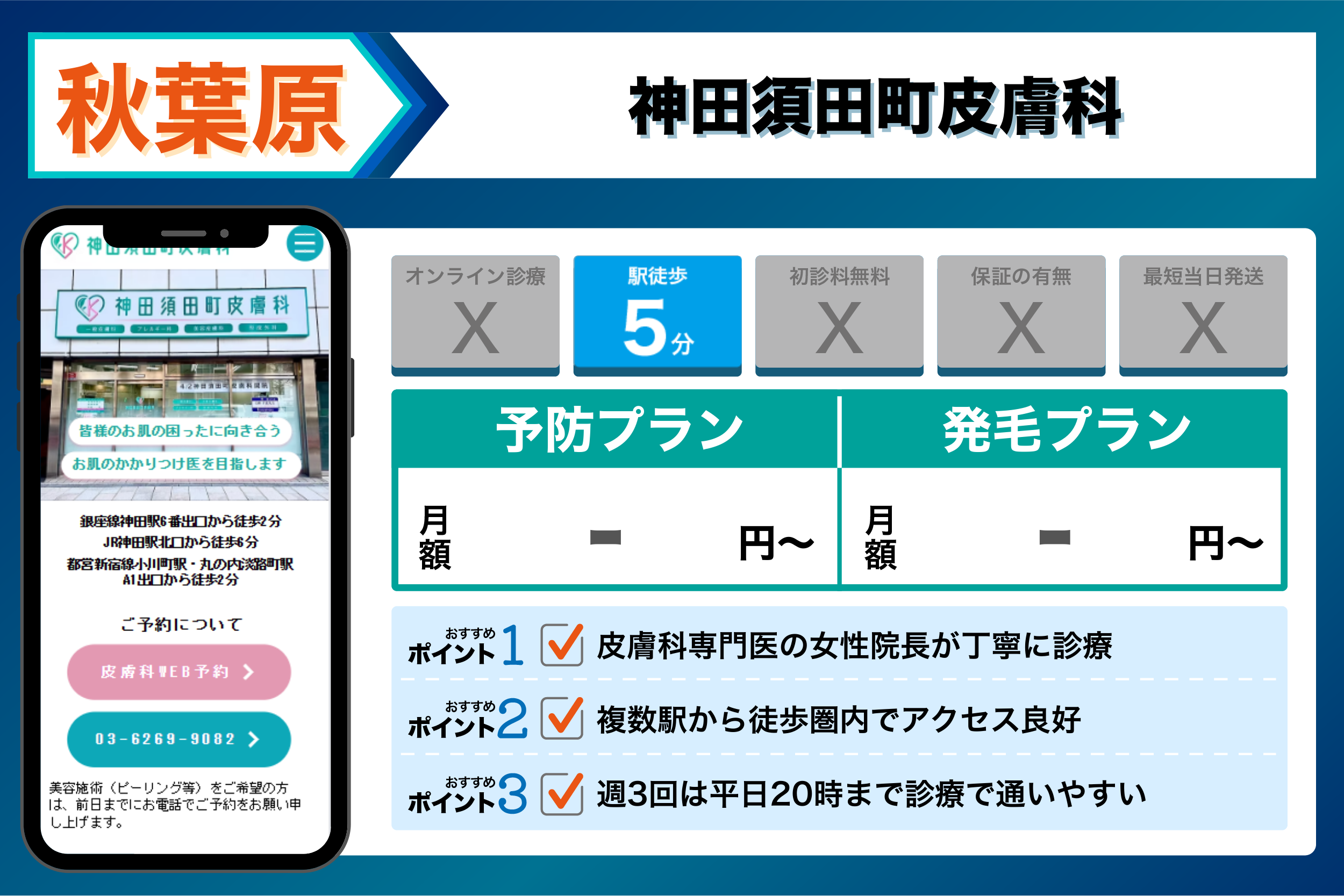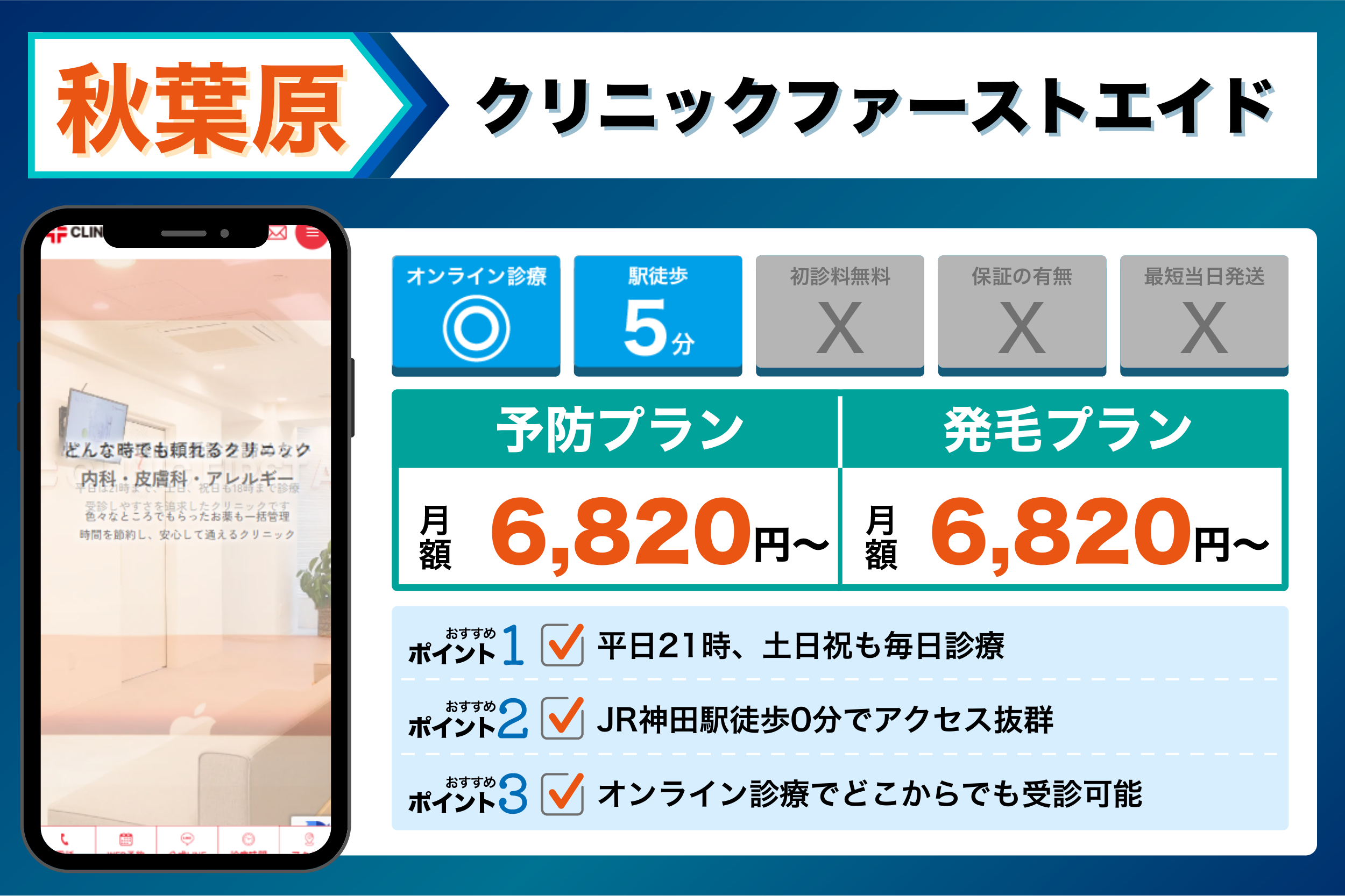 秋葉原のAGAクリニックを調査してことで、AGA治療の平均相場・駅からのアクセス・初心者でも始めやすいサポート体制が整っているクリニックが明らかになりました。