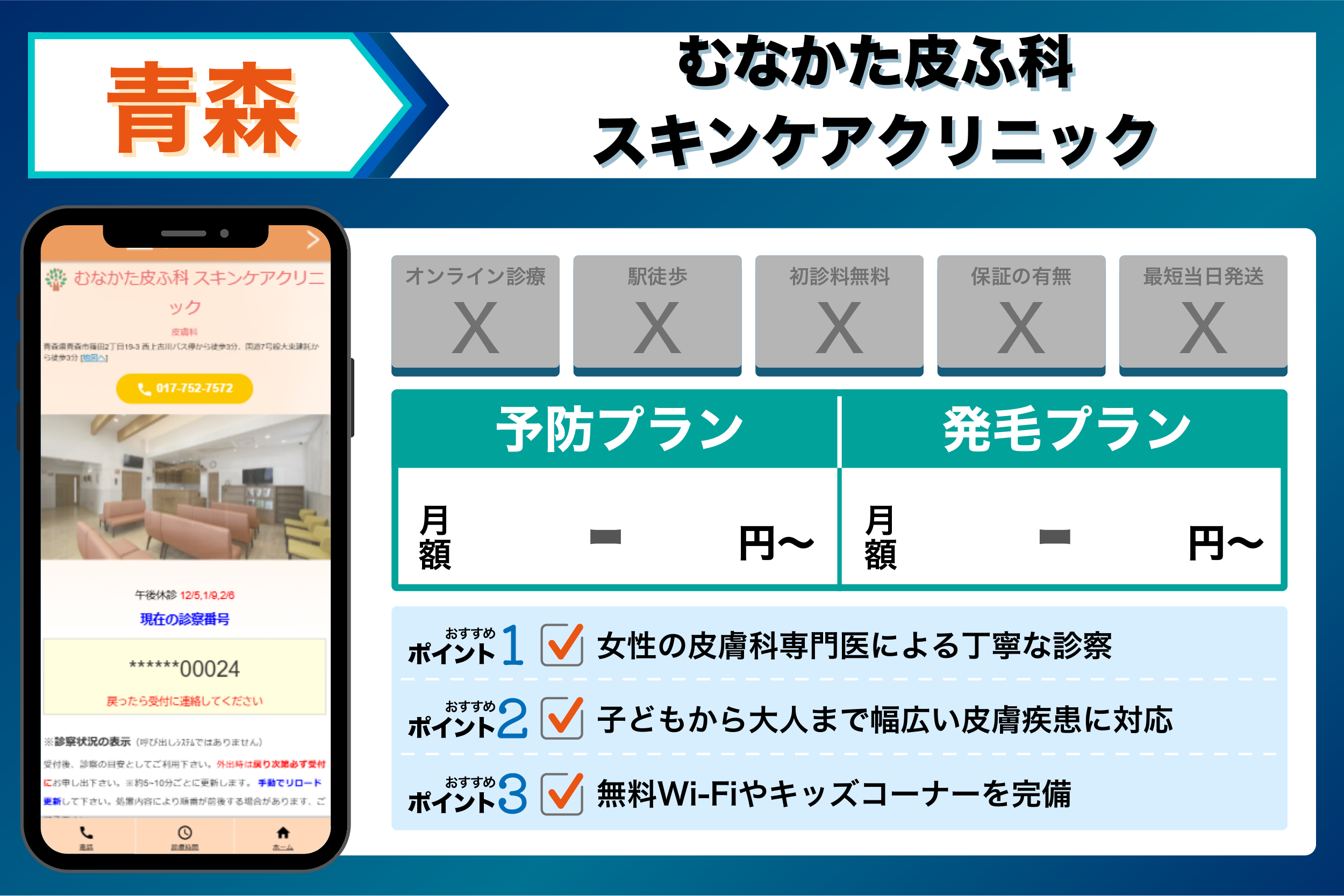 - 実際に通う利便性重視 → 青森駅徒歩圏内のタウン形成外科クリニックや、弘前学院大前駅から近いあいづ皮ふ科クリニックなど、現地の駅近クリニック