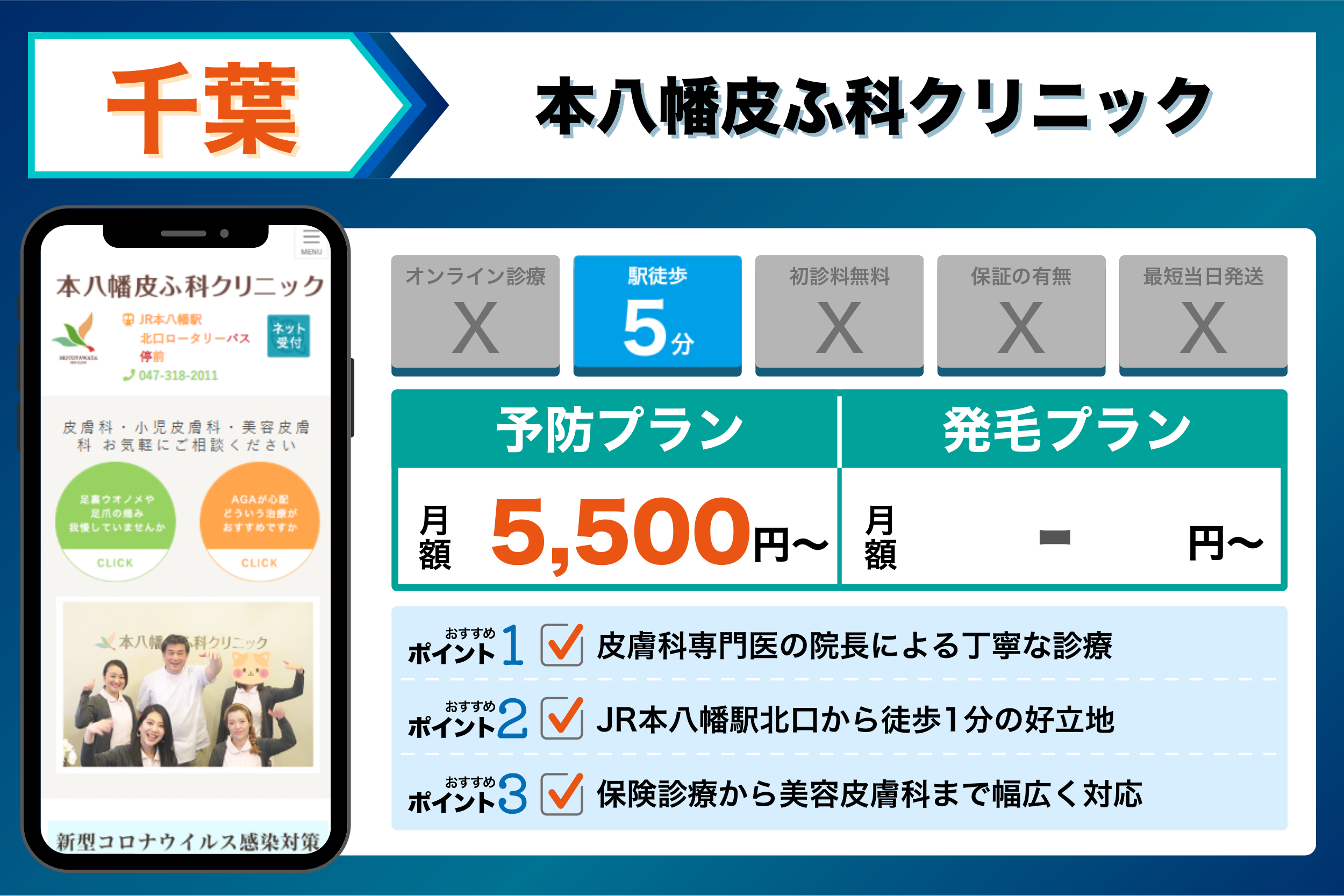 本八幡皮ふ科クリニック | 皮膚科専門医の院長による丁寧な診療 | 【予防】:フィナステリド(国内メーカー):¥5,500(税込み)から |