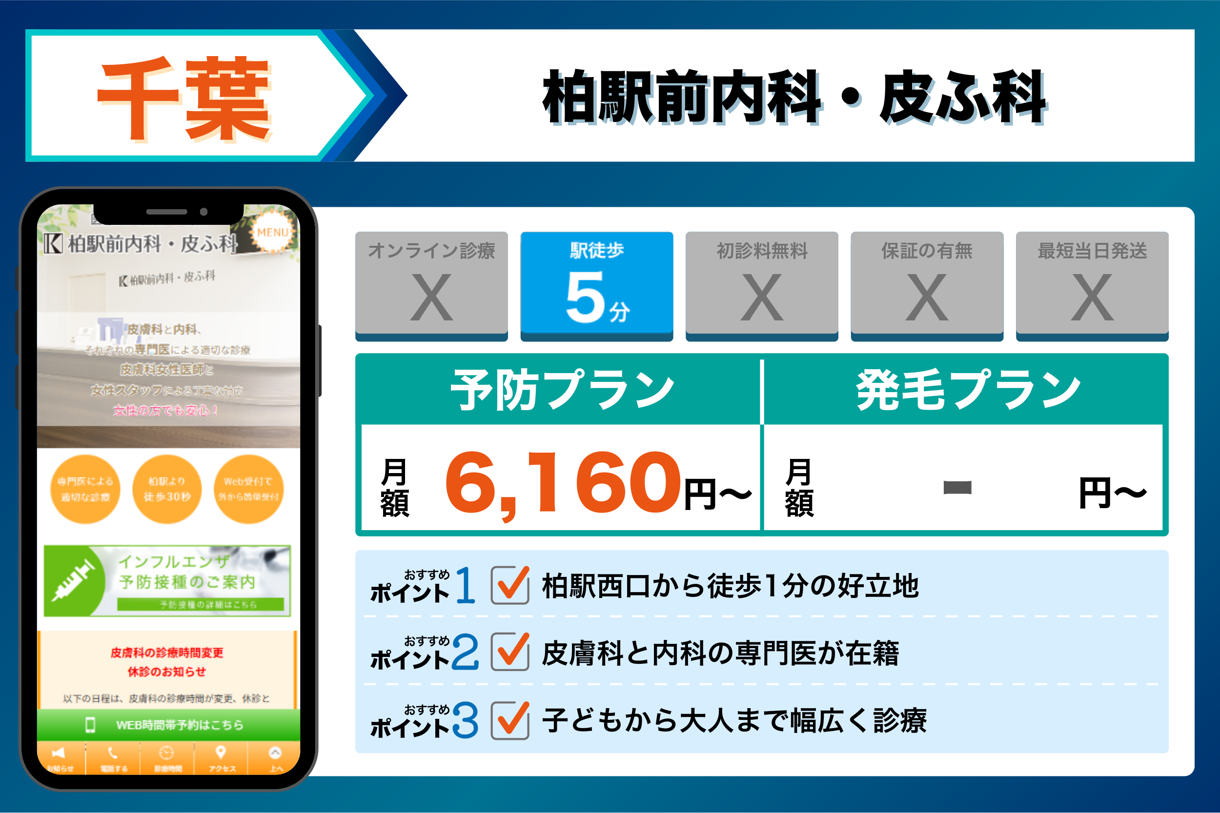 柏駅前内科・皮ふ科 | 柏駅西口から徒歩1分の好立地 | 【予防】:フィナステリド(プロペシアのジェネリック):6,160円(税込)から |