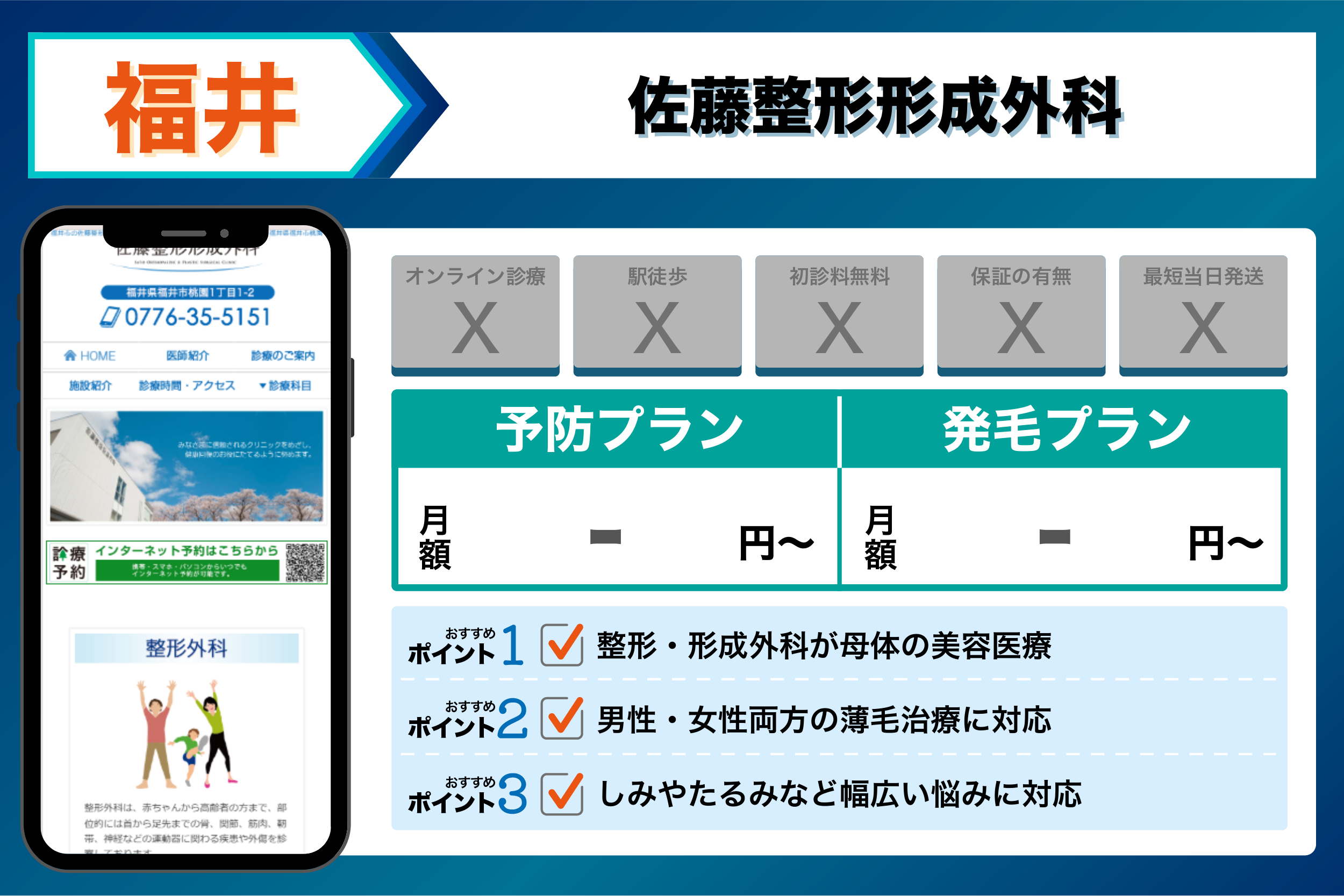 - 実際に通う利便性重視 → 福井駅徒歩圏内の佐藤整形形成外科や、花堂駅から近い竹内医院など、現地の駅近クリニック