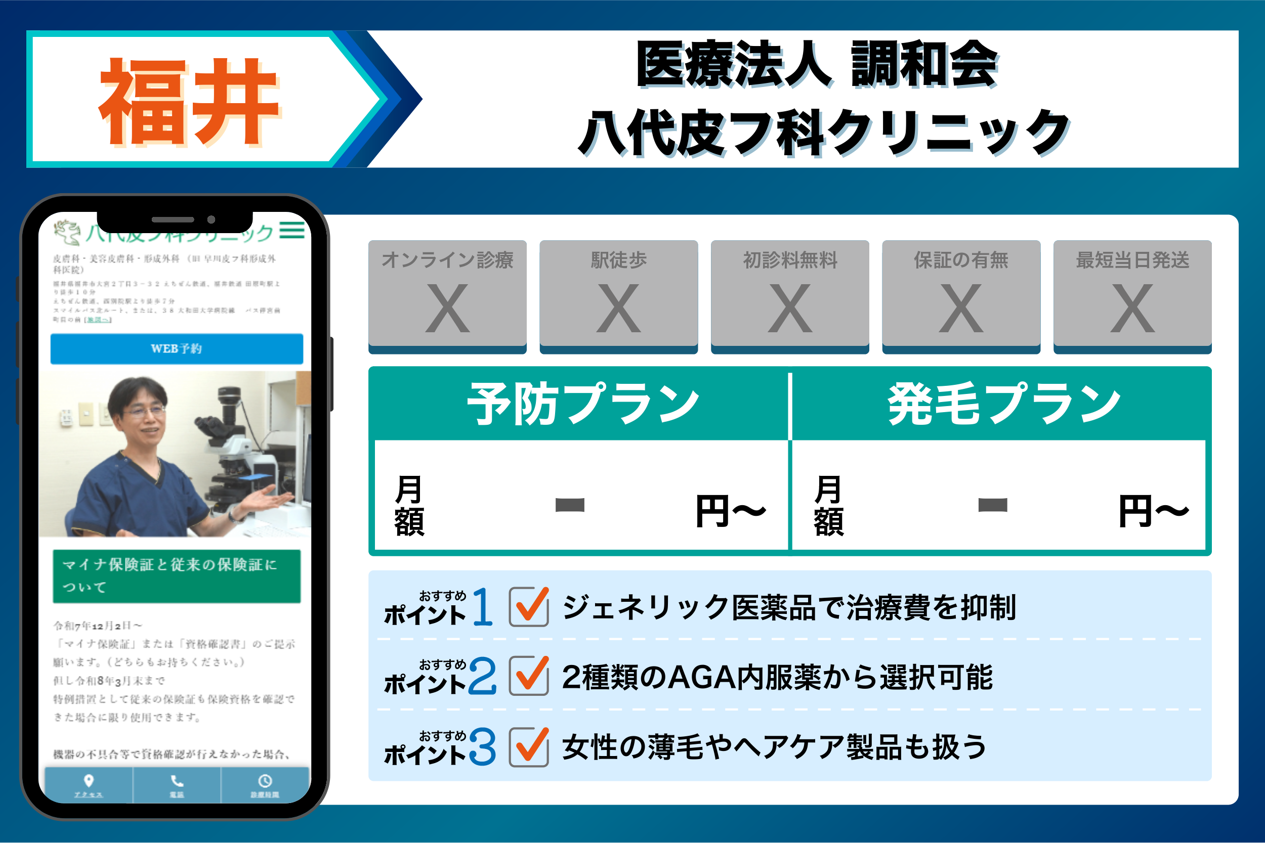 今回福井のAGAクリニックを厳選するにあたり重視した選定基準は以下の4点になっています。福井にあるAGAクリニック合計8院を調査しました。