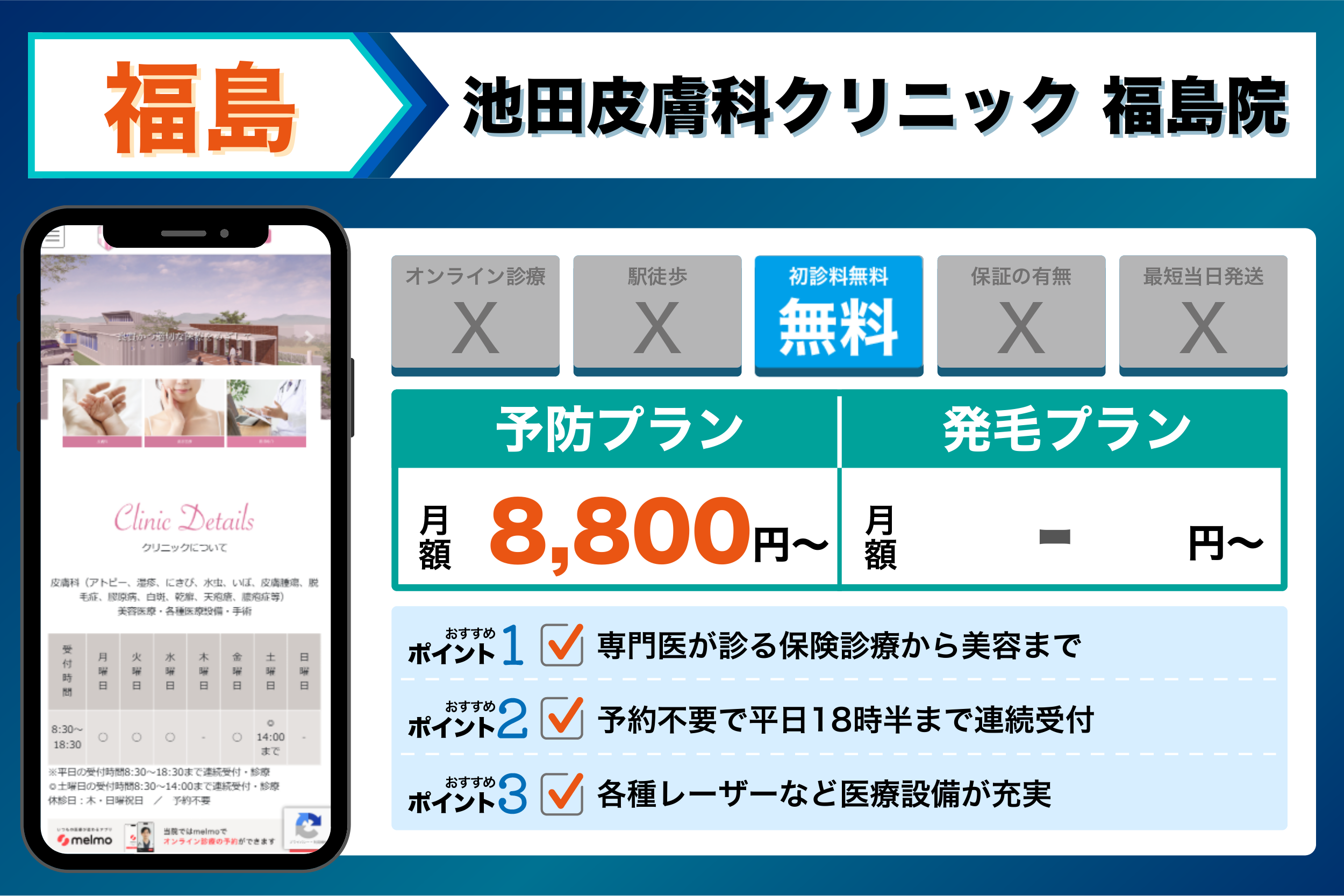 池田皮膚科クリニック 福島院 | 専門医が診る保険診療から美容まで | 【予防】:フィナステリド:8,800~9,900円から |