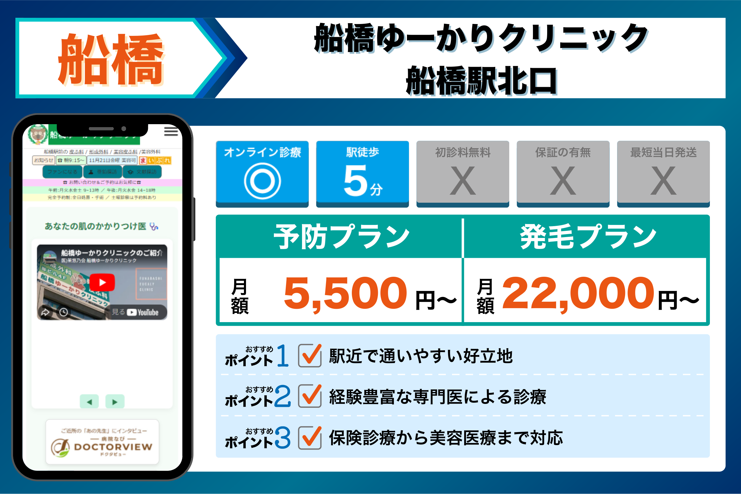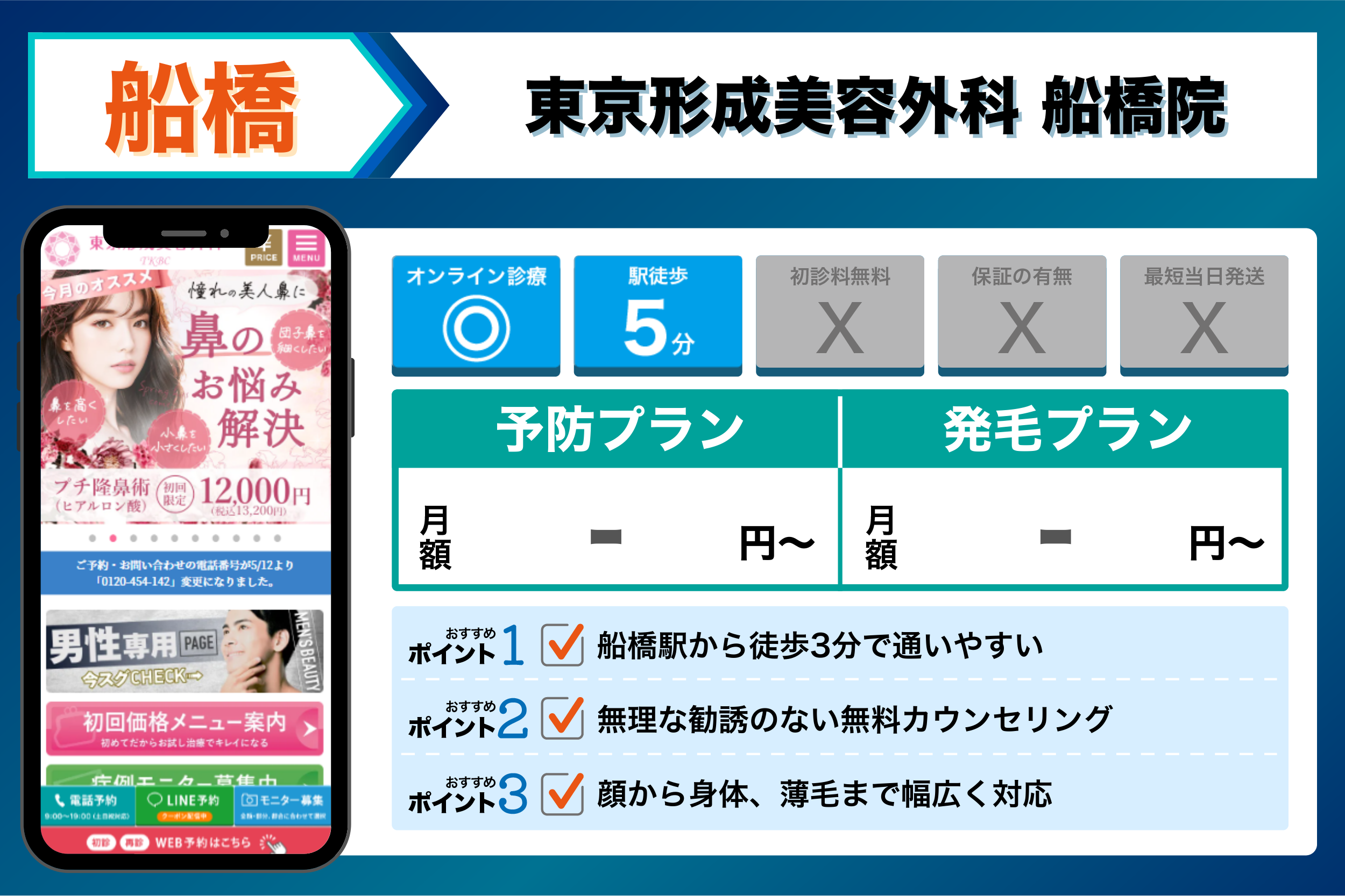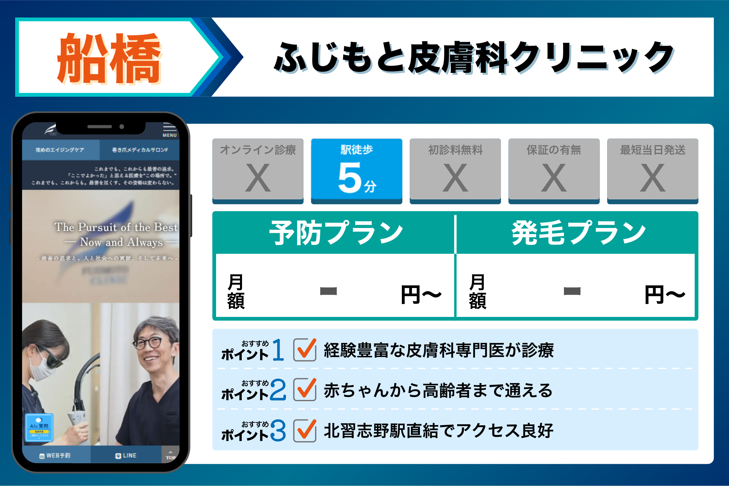 これらを踏まえて、4つの観点から選ぶ船橋でおすすめのクリニックは以下のようになりました。