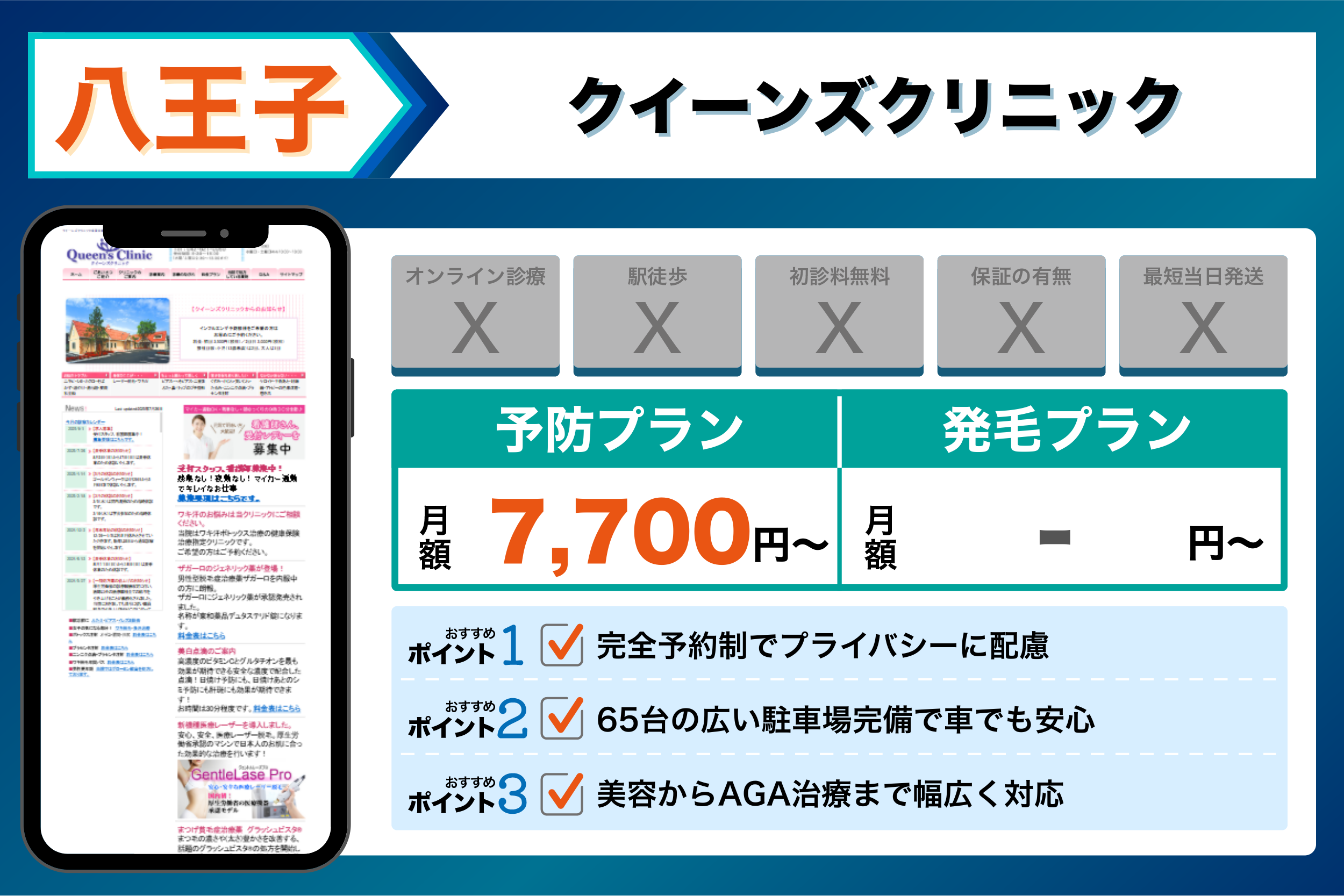 クイーンズクリニック | 完全予約制でプライバシーに配慮 | 【予防】:AGA内服薬(フィナステリド錠):7,700円 (税抜7,000円)から |