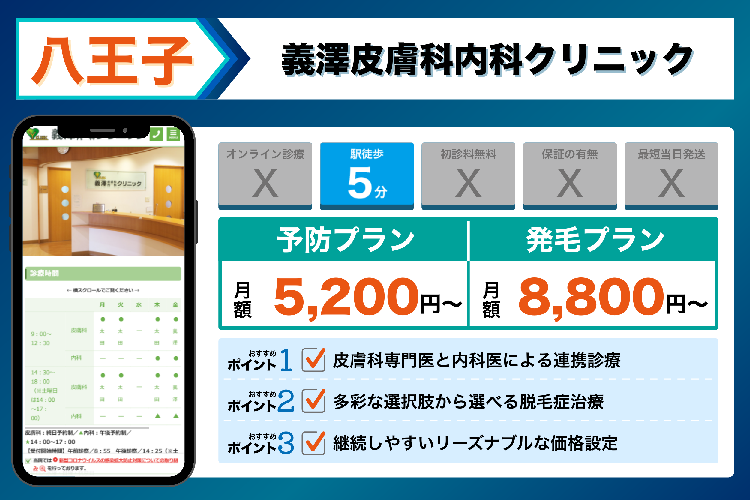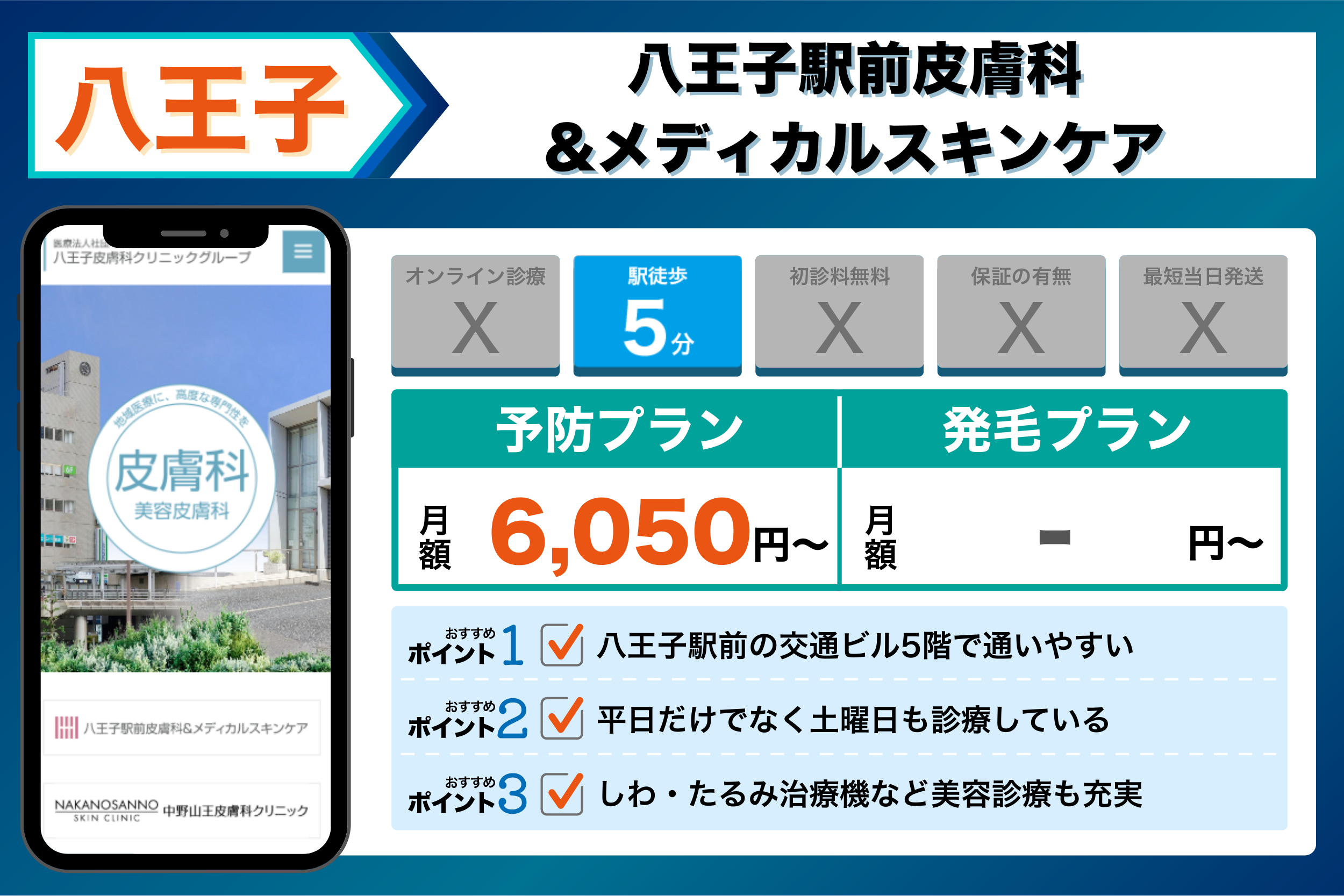 八王子駅前皮膚科&メディカルスキンケア | 八王子駅前の交通ビル5階で通いやすい | 【予防】:フィナステリド:6,050円から |