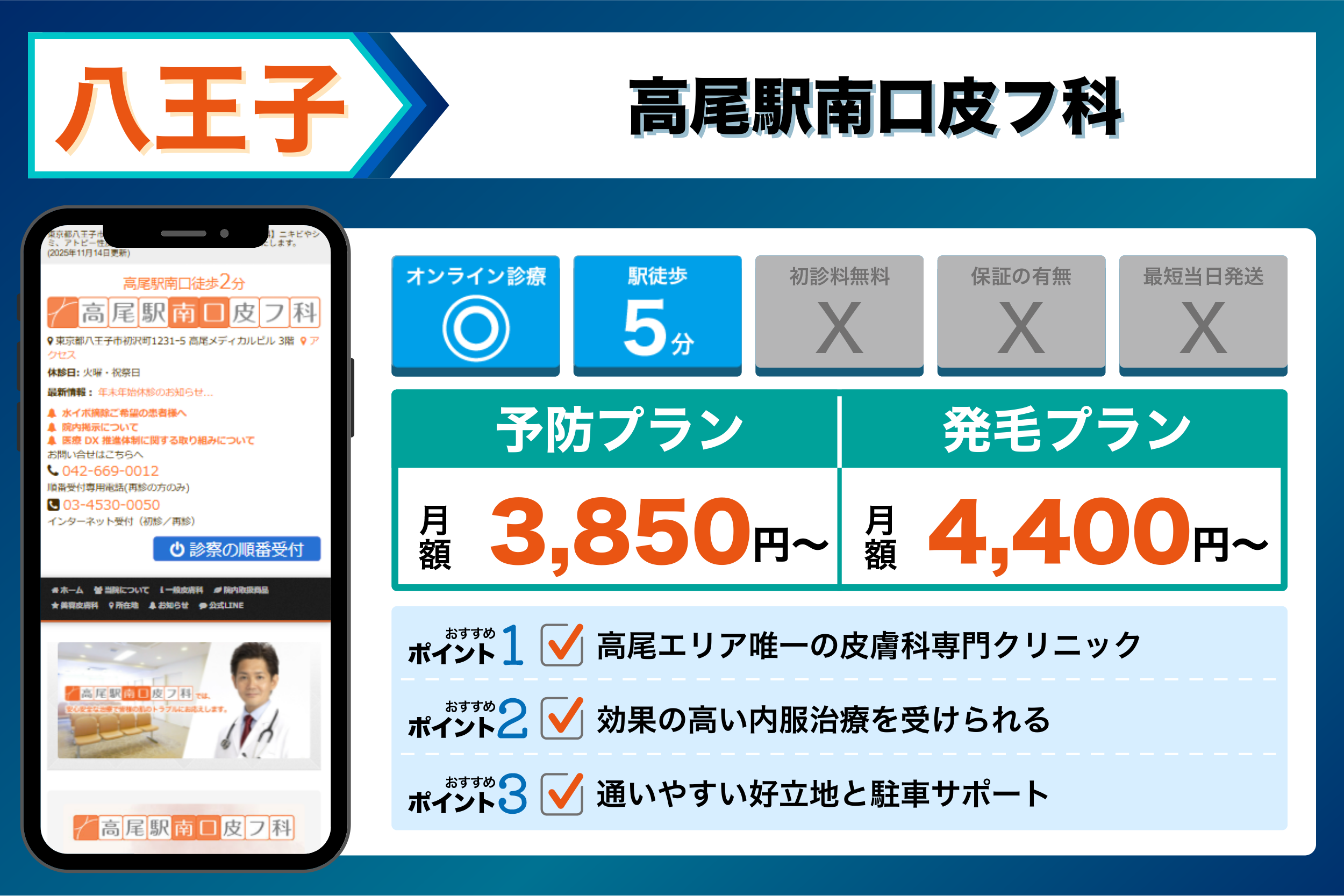 - 実際に通う利便性重視 → 八王子駅徒歩圏内の八王子駅前皮膚科&メディカルスキンケアや、高尾駅から近い高尾駅南口皮フ科など、現地の駅近クリニック