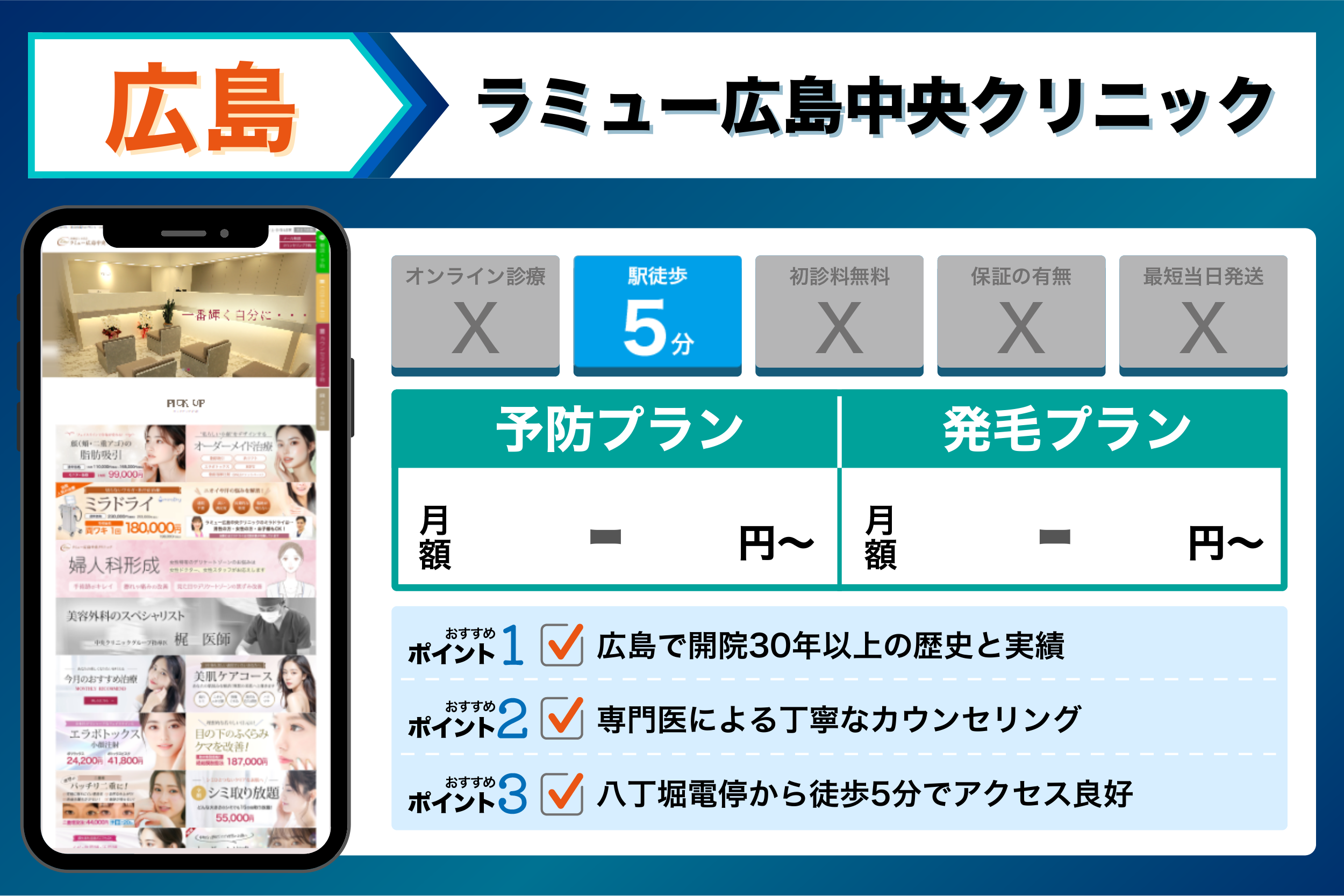 ラミュー広島中央クリニック | 広島で開院30年以上の歴史と実績 | 公式サイトに記載なし |