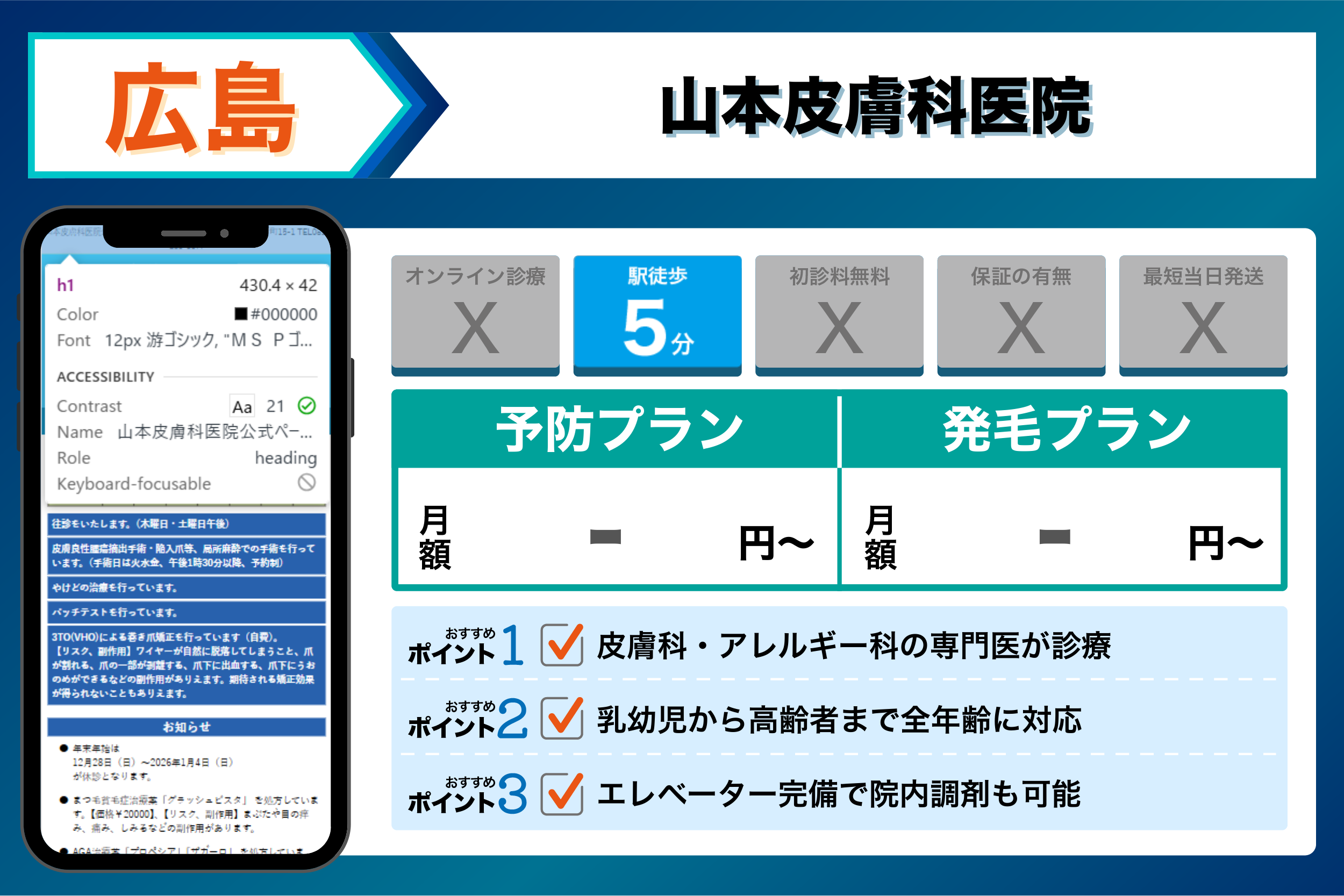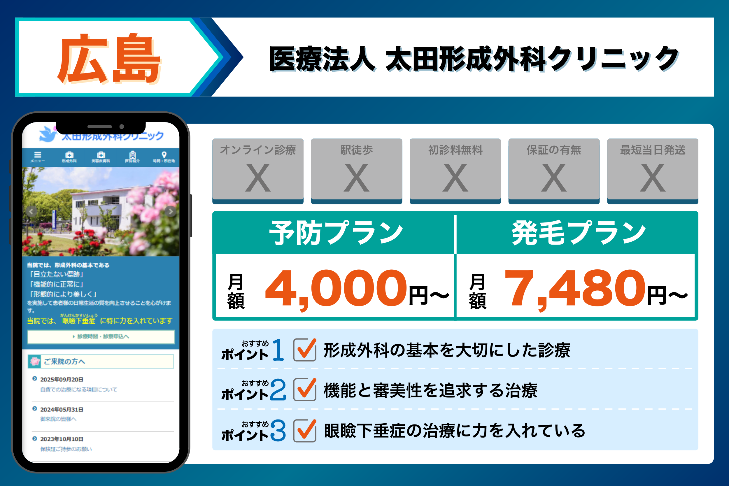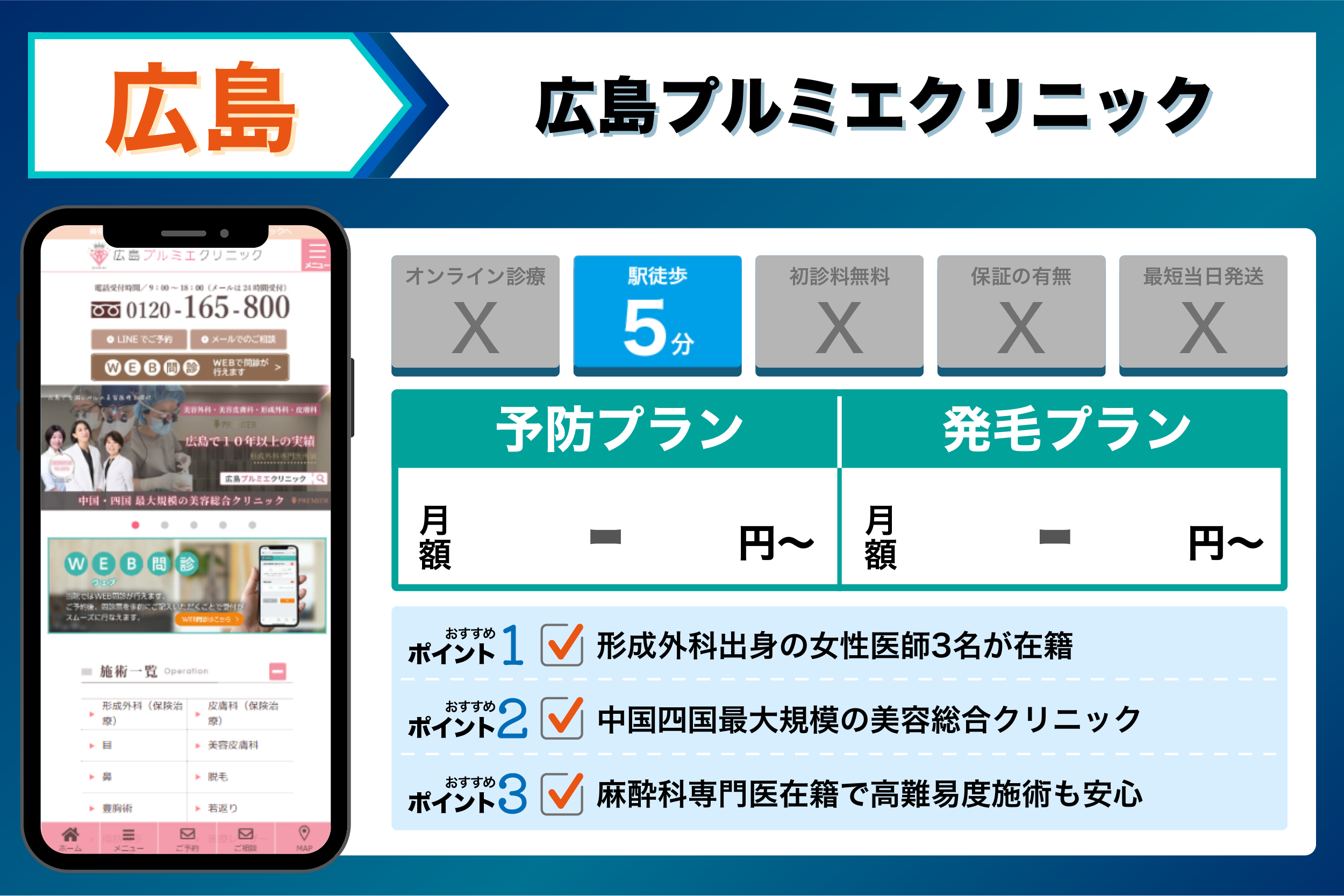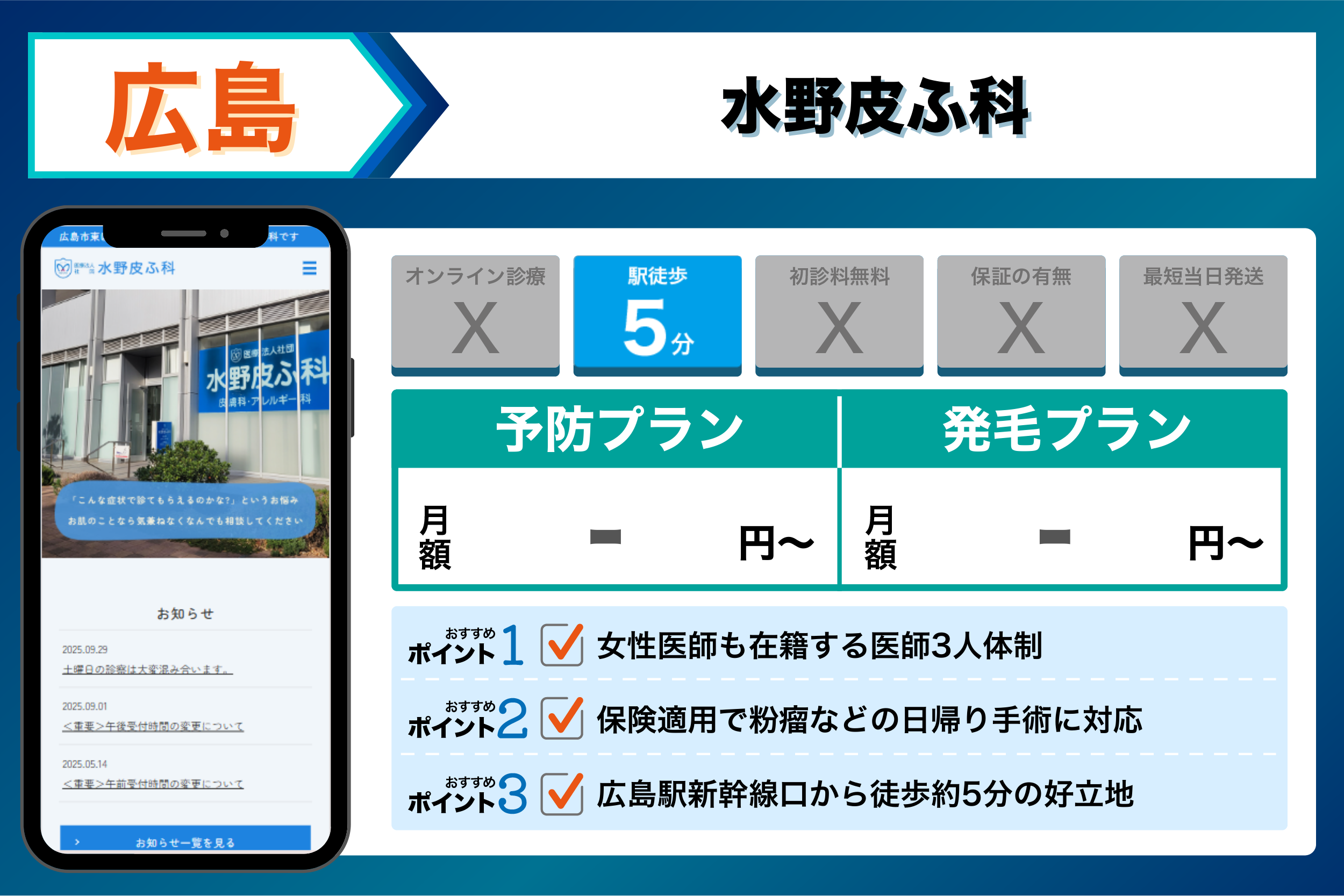 - 実際に通う利便性重視 → 広島駅徒歩圏内の水野皮ふ科や、八丁堀駅から近い男たちの美容外科 広島院など、現地の駅近クリニック