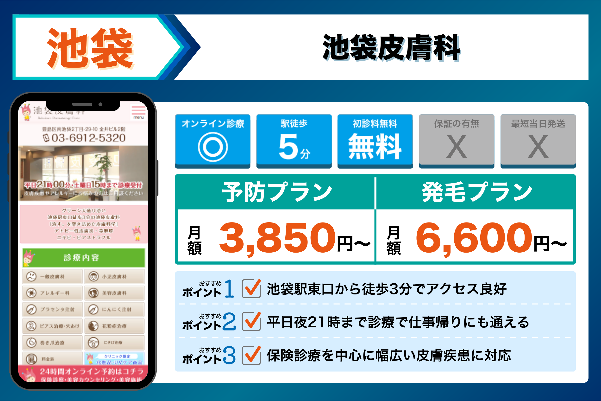 - 実際に通う利便性重視 → 池袋駅徒歩圏内の池袋スカイクリニックや、池袋駅から近い池袋駅前のだ皮膚科など、現地の駅近クリニック