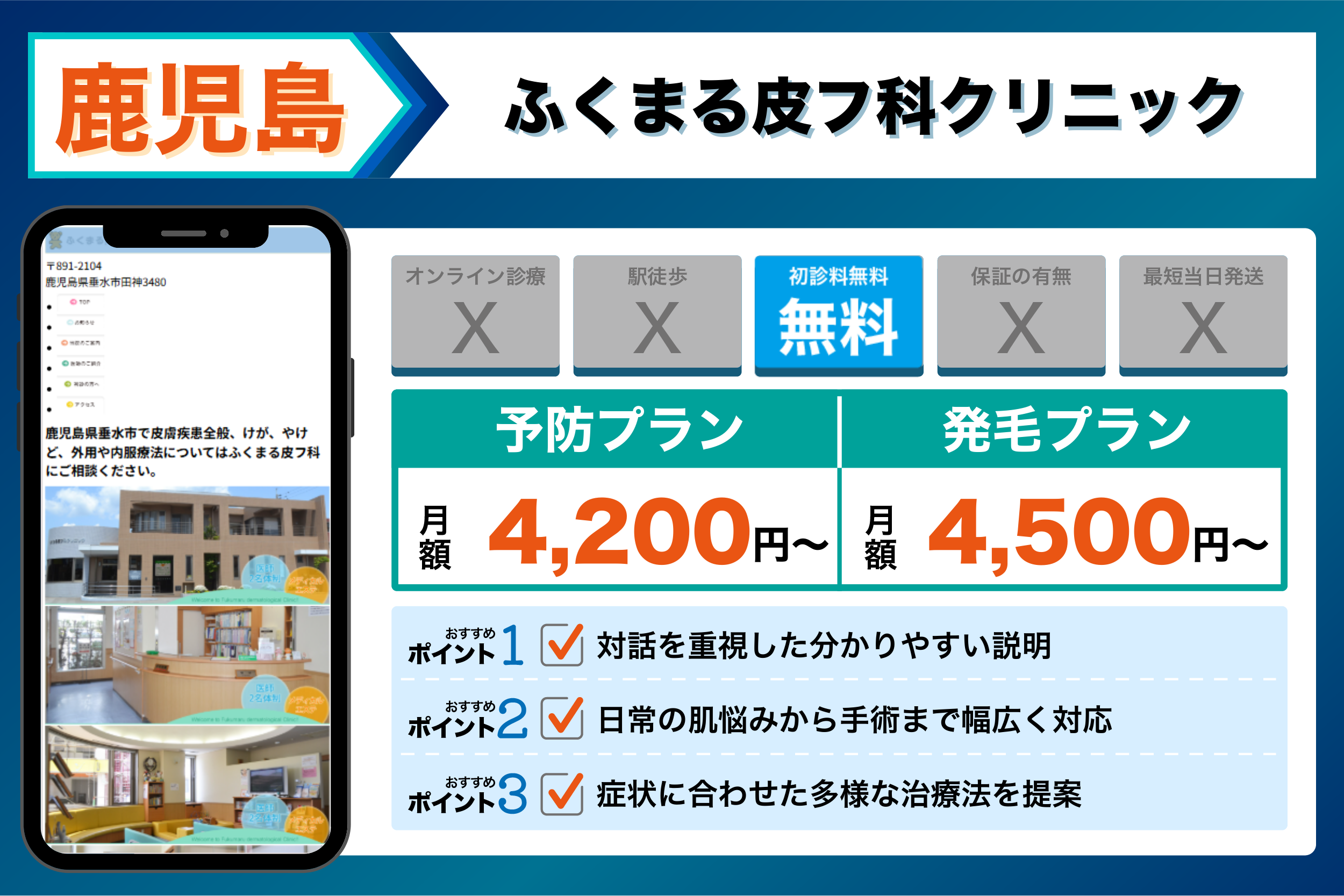 - 実際に通う利便性重視 → 鹿児島中央駅徒歩圏内のアトールクリニック 鹿児島院や、JR垂水駅から近いふくまる皮フ科クリニックなど、現地の駅近クリニック
