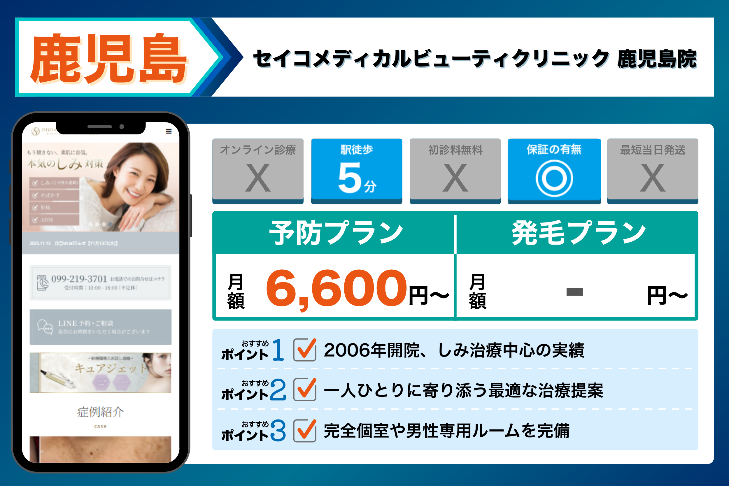 セイコメディカルビューティクリニック 鹿児島院 | 2006年開院、しみ治療中心の実績 | 【予防】:フィナステリド 男性用(発毛治療をされた方):6,600円から |