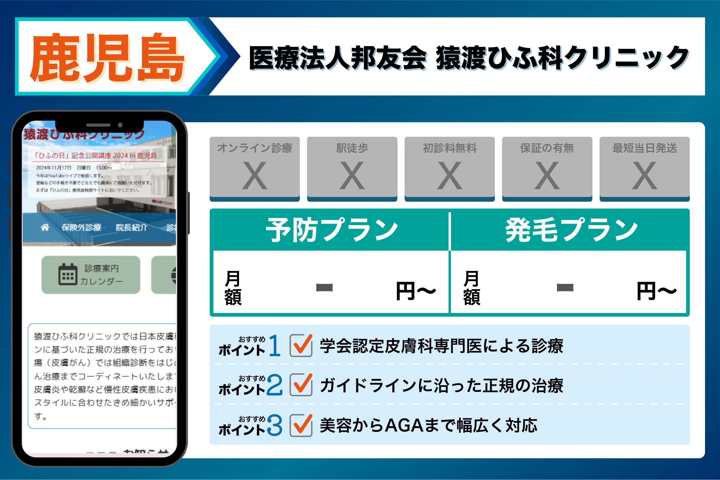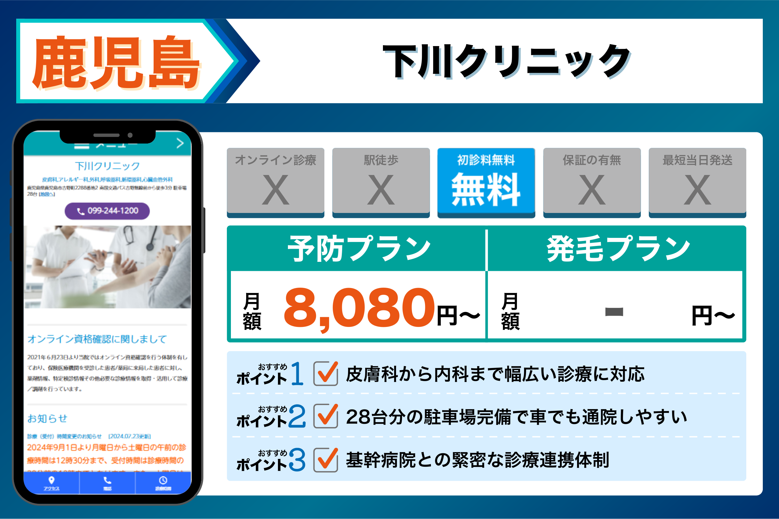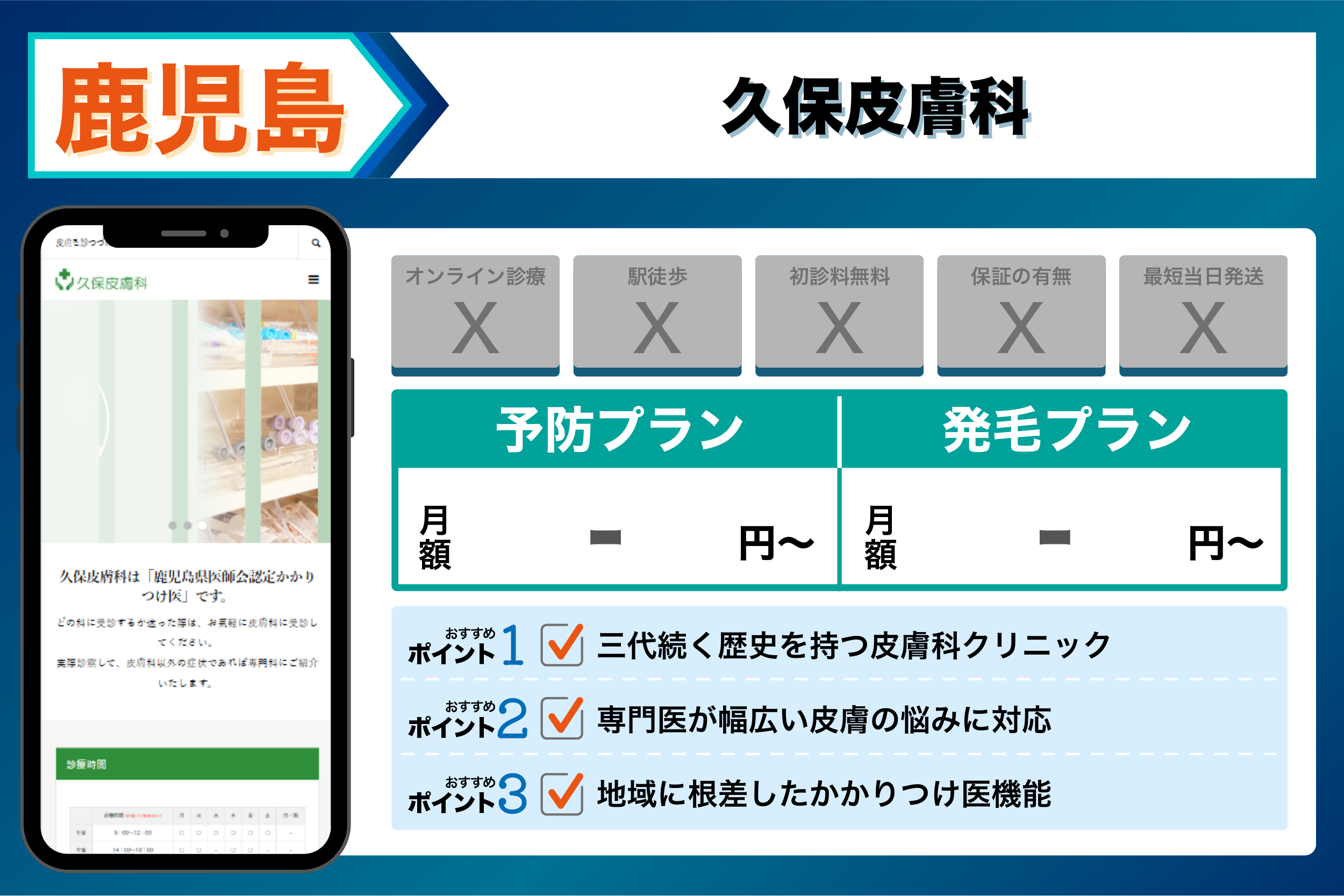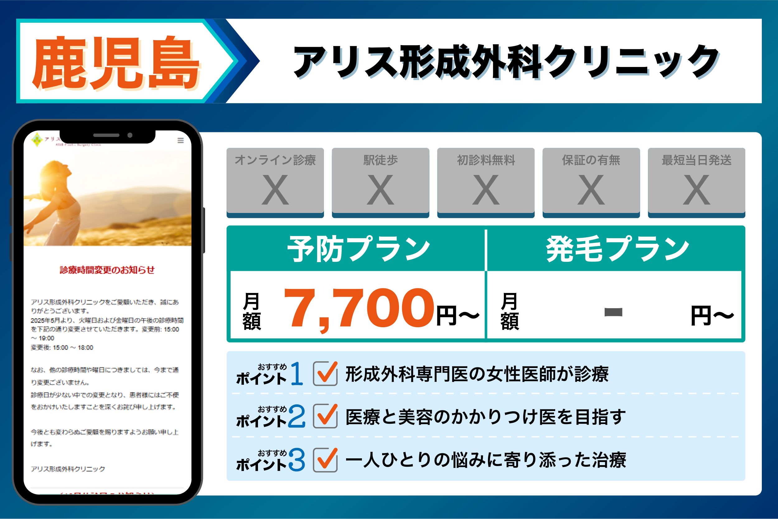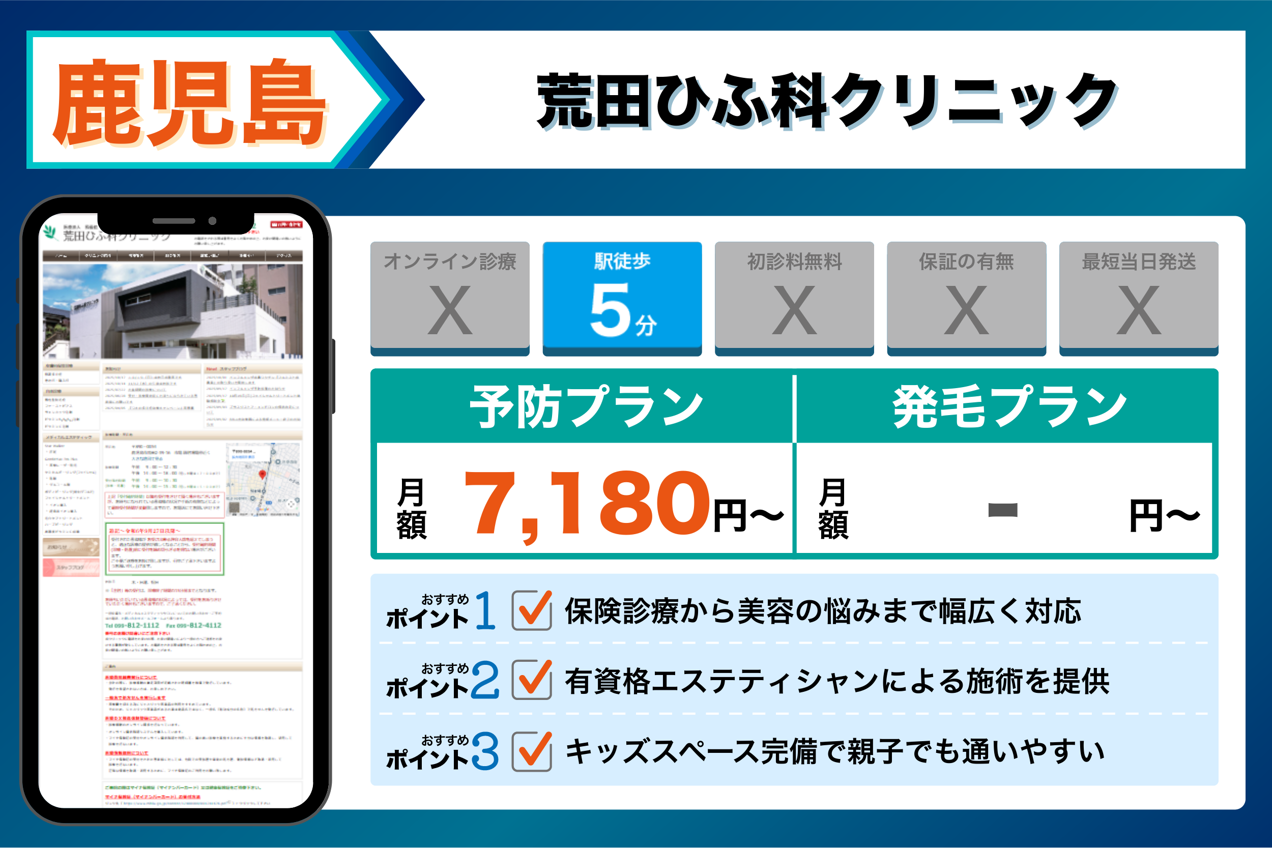 当編集部が鹿児島の主要クリニックを調査した結果、重視するポイントごとに以下のような傾向が見られました。