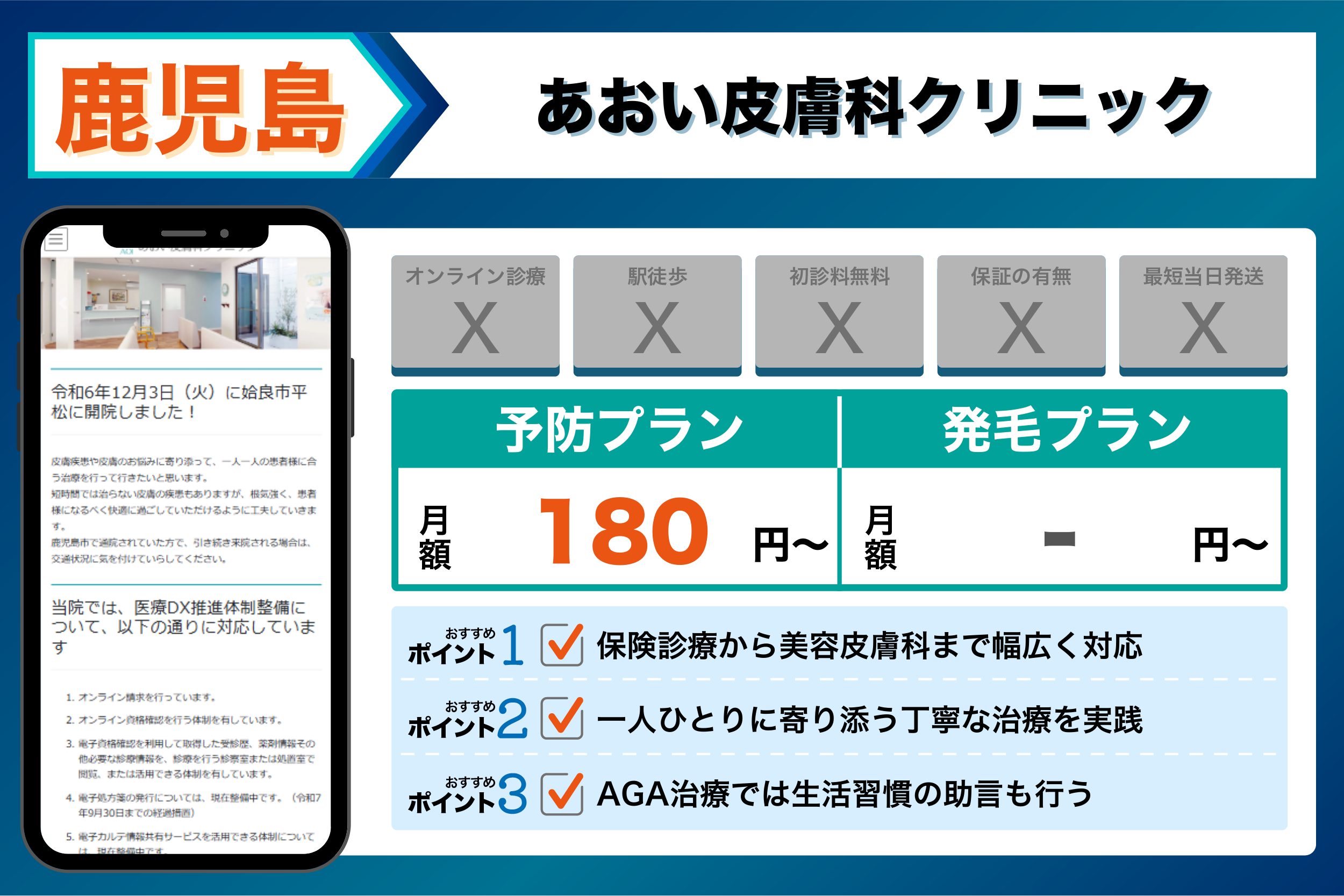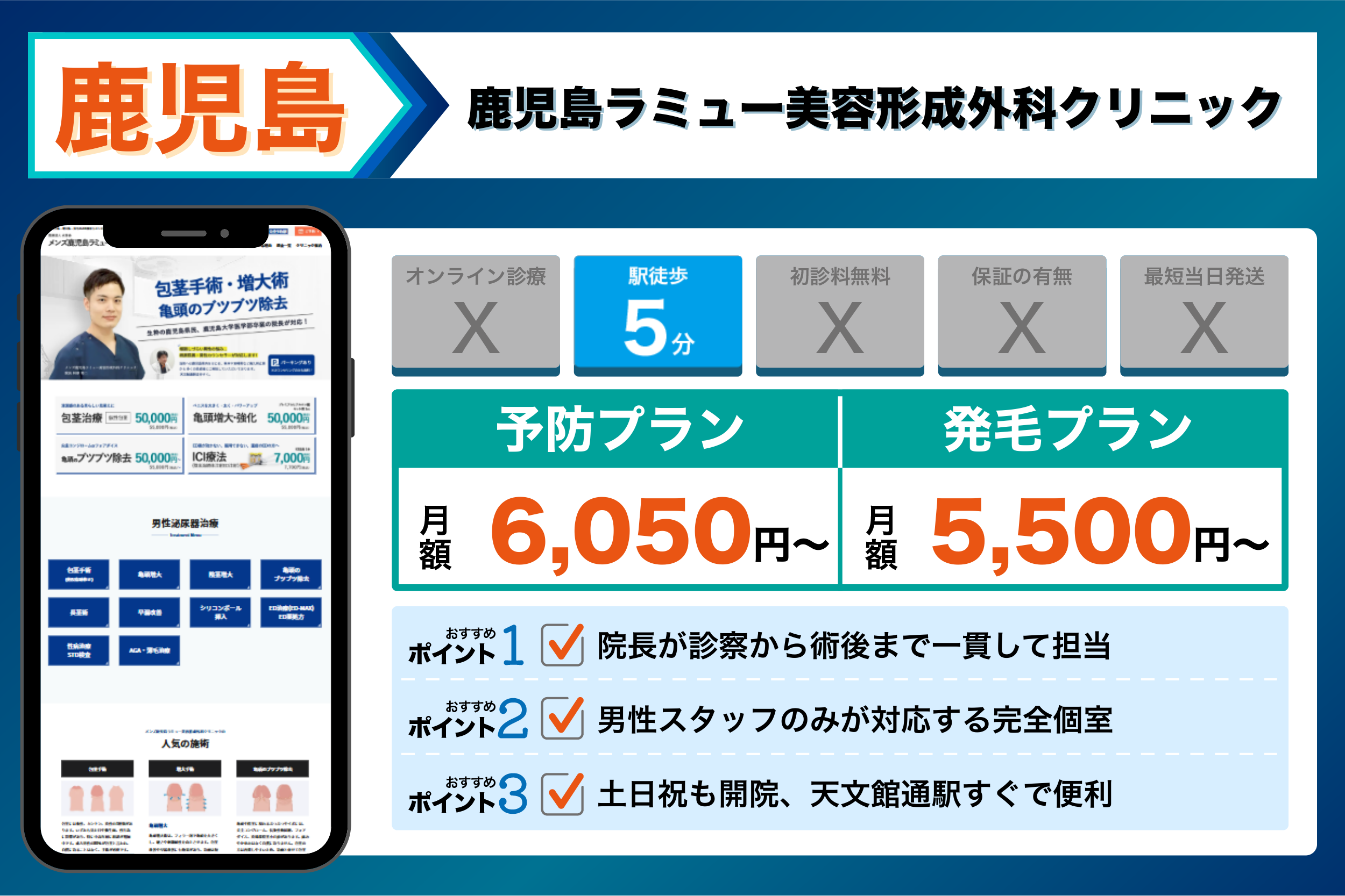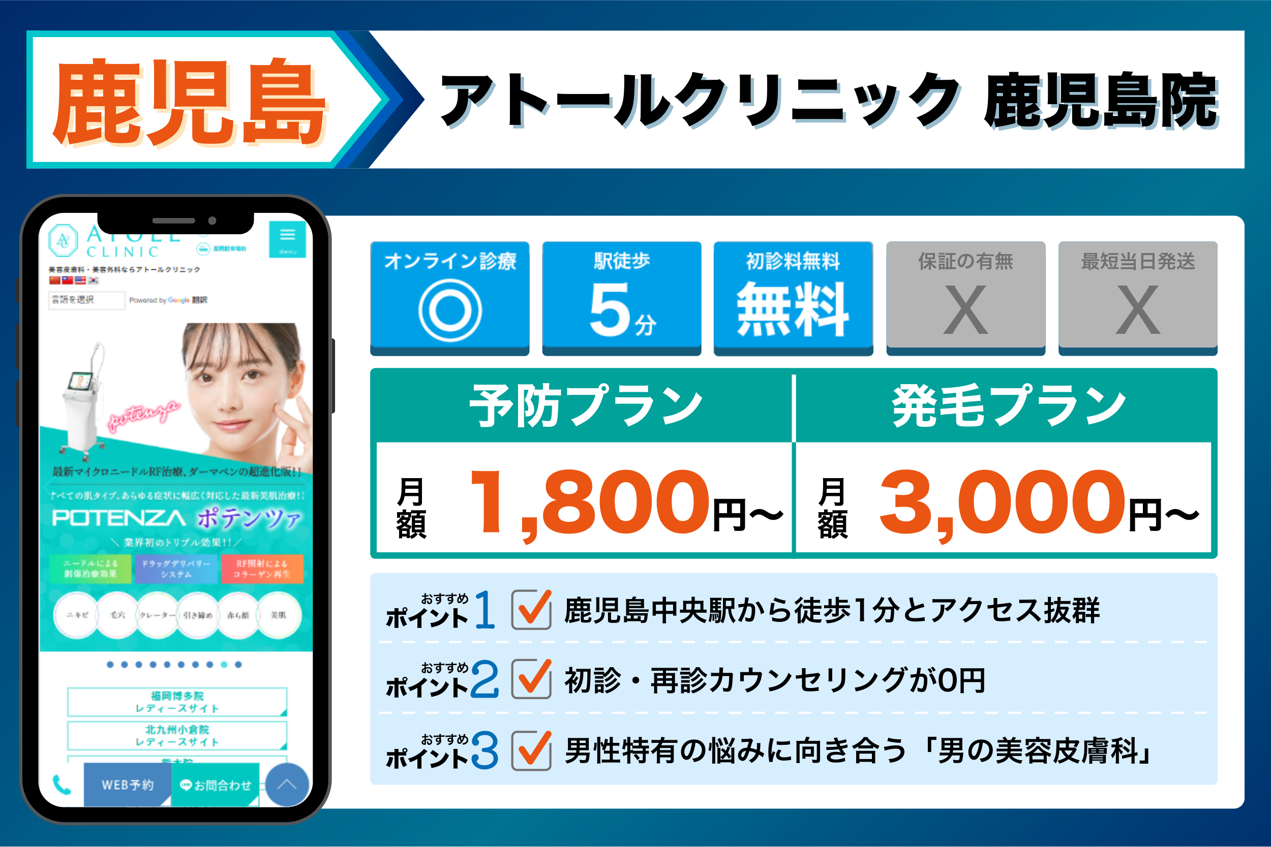 アトールクリニック 鹿児島院 | 鹿児島中央駅から徒歩1分とアクセス抜群 | 【発毛】:発毛ライトプラン(フィナステリド+ミノキシジル内服):初回1ヶ月 3,000円(税込)から| |