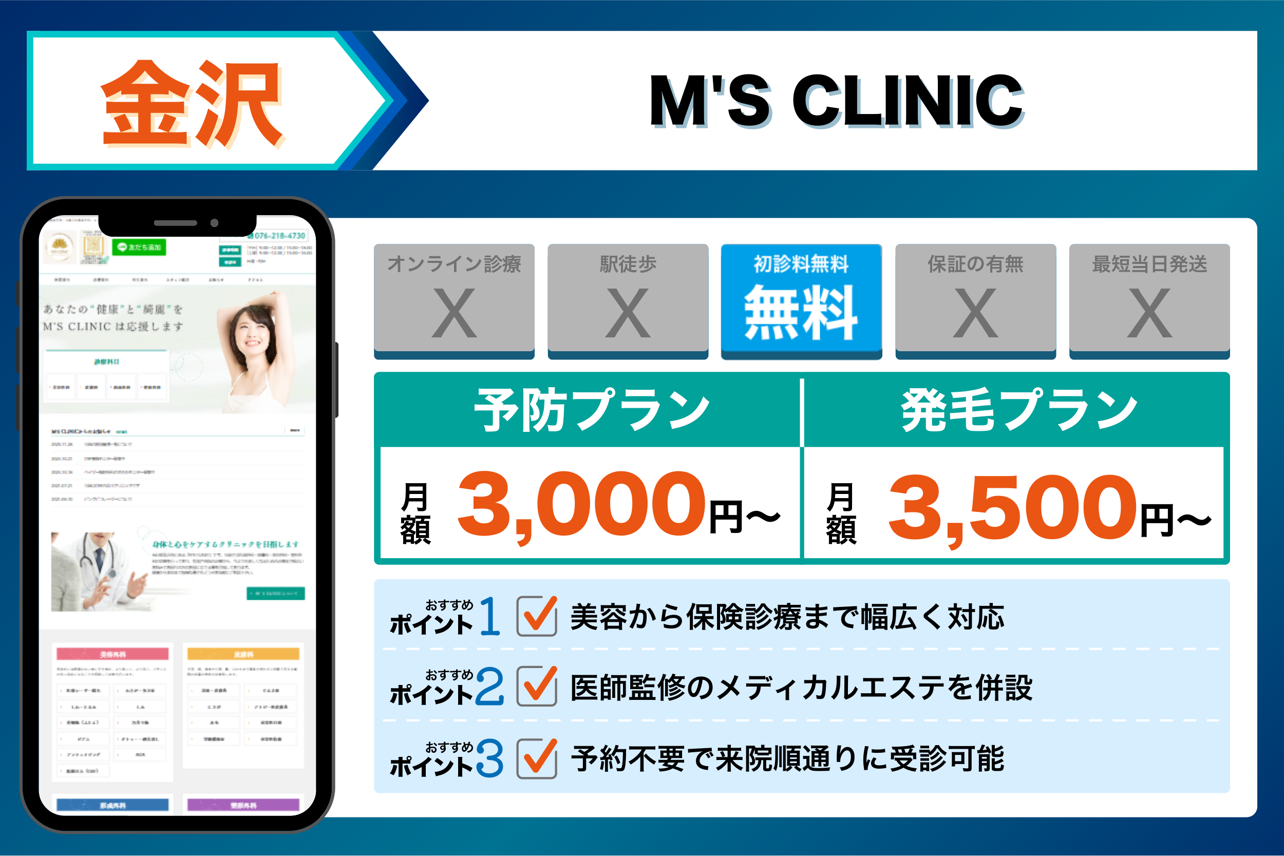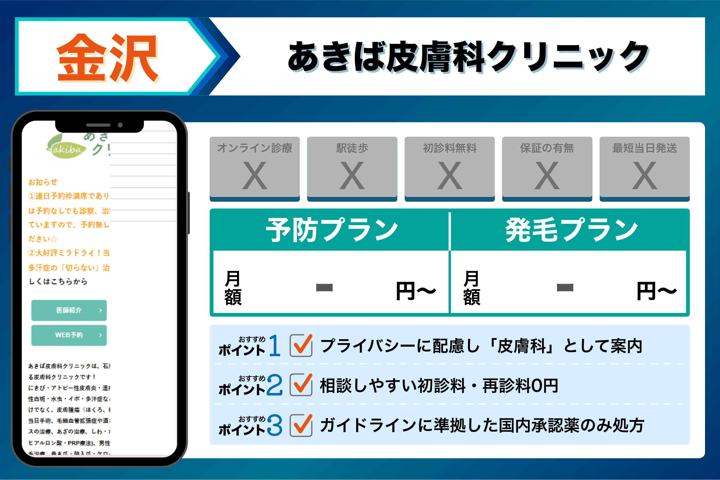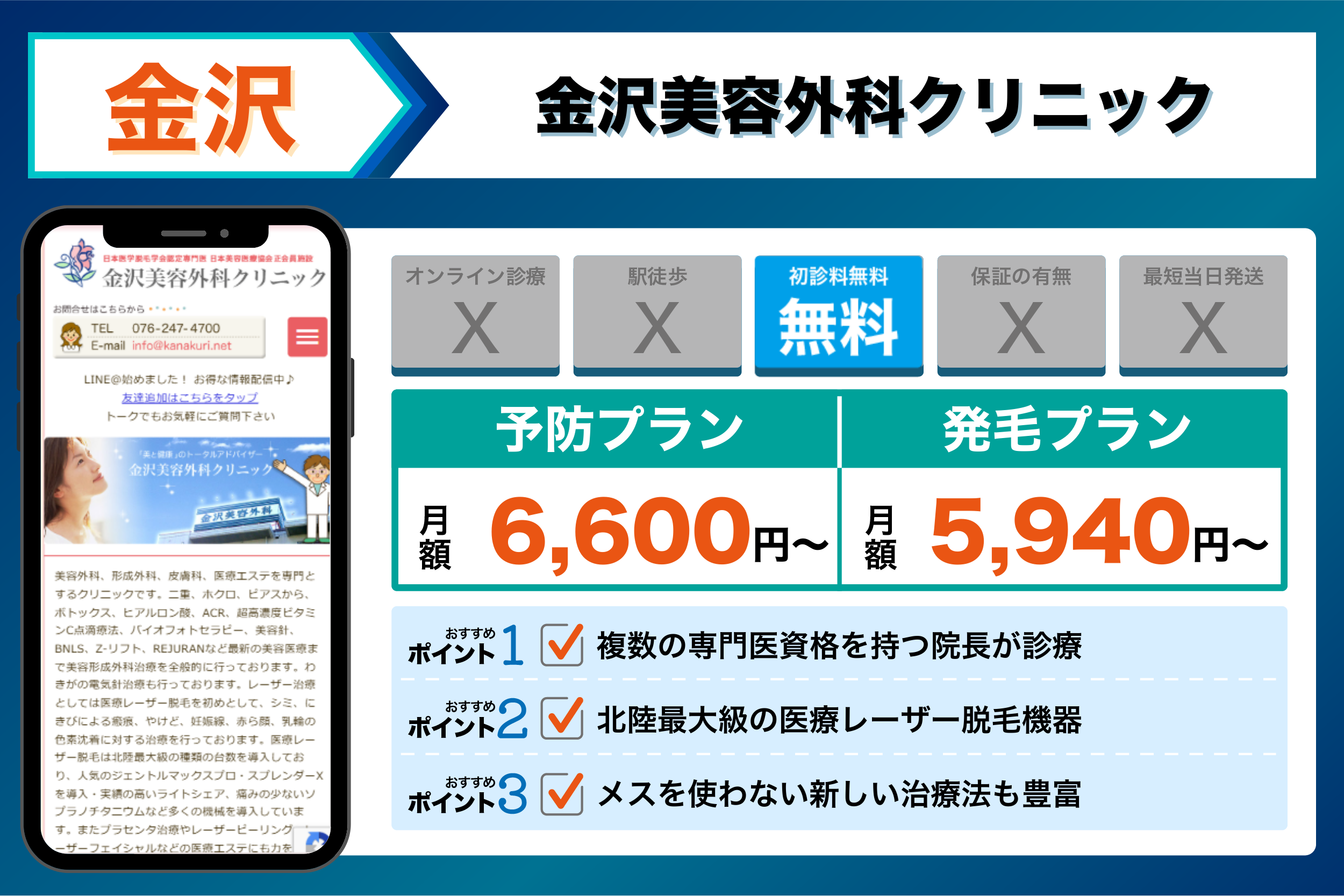 当編集部が金沢の主要クリニックを調査した結果、重視するポイントごとに以下のような傾向が見られました。
