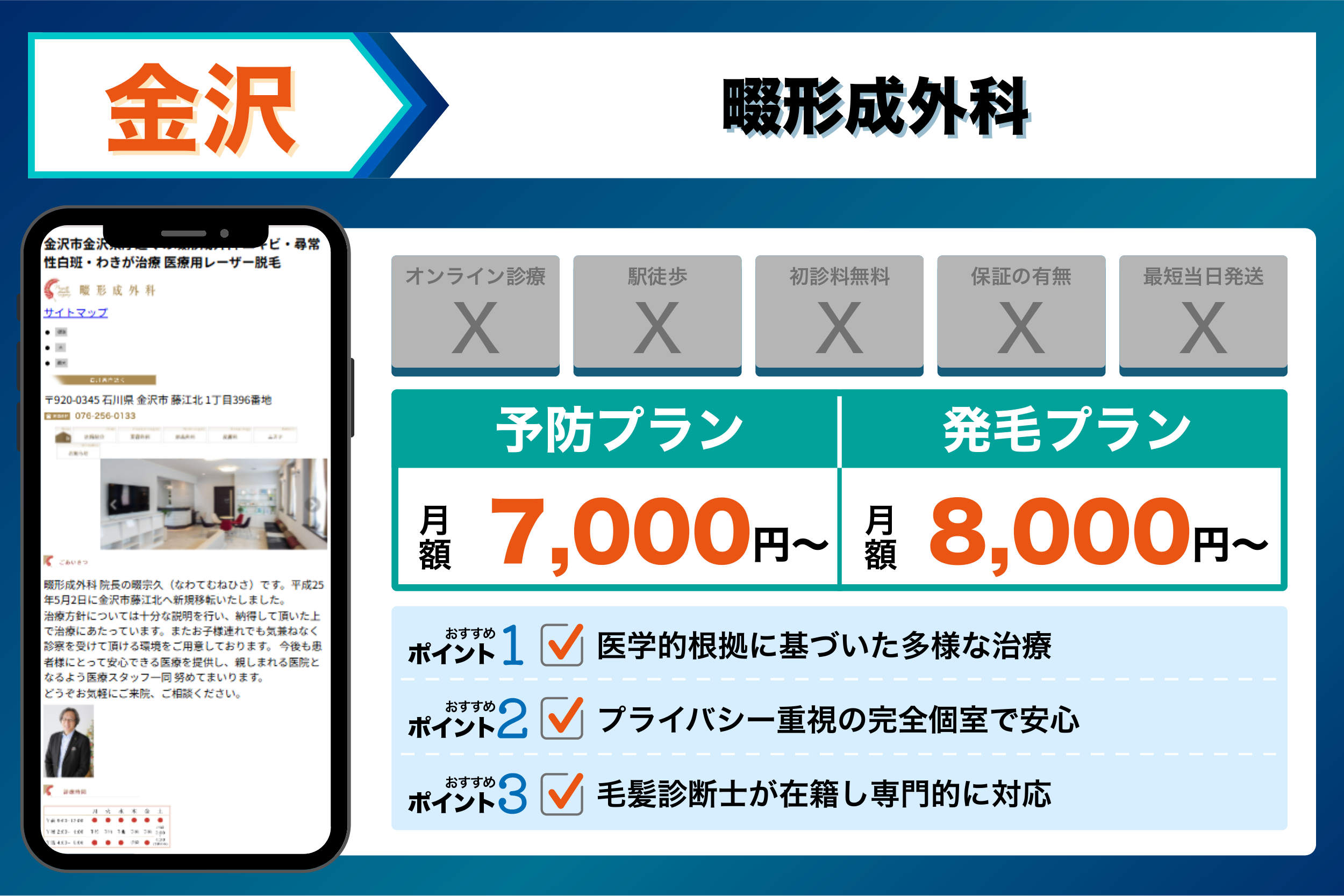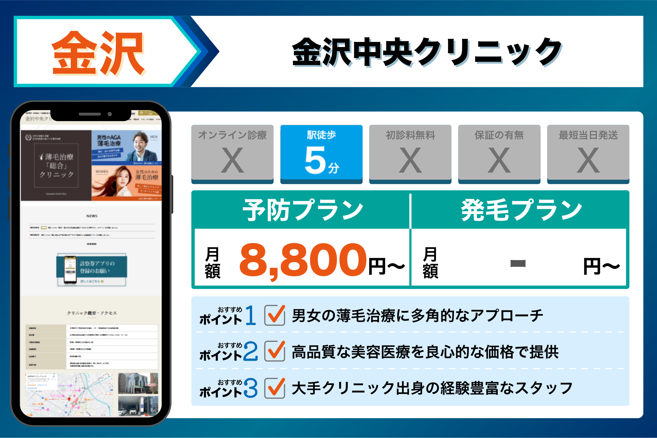 金沢中央クリニック | 大手クリニック出身の経験豊富なスタッフ | 【予防】:デュタステリド:8,800円から |