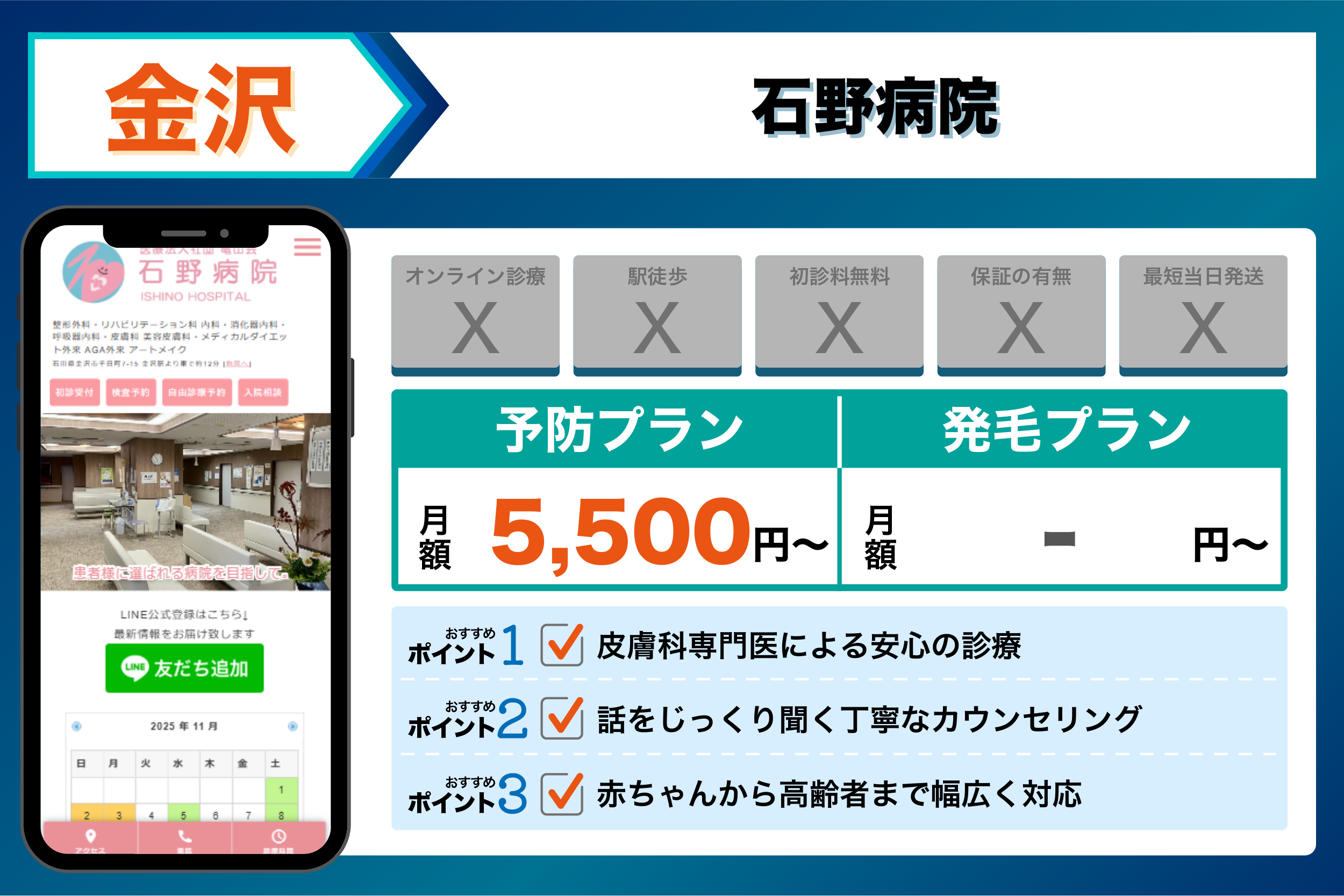 - 実際に通う利便性重視 → 石川県金沢市駅徒歩圏内の金沢中央クリニックや、野町駅から近い石野病院など、現地の駅近クリニック