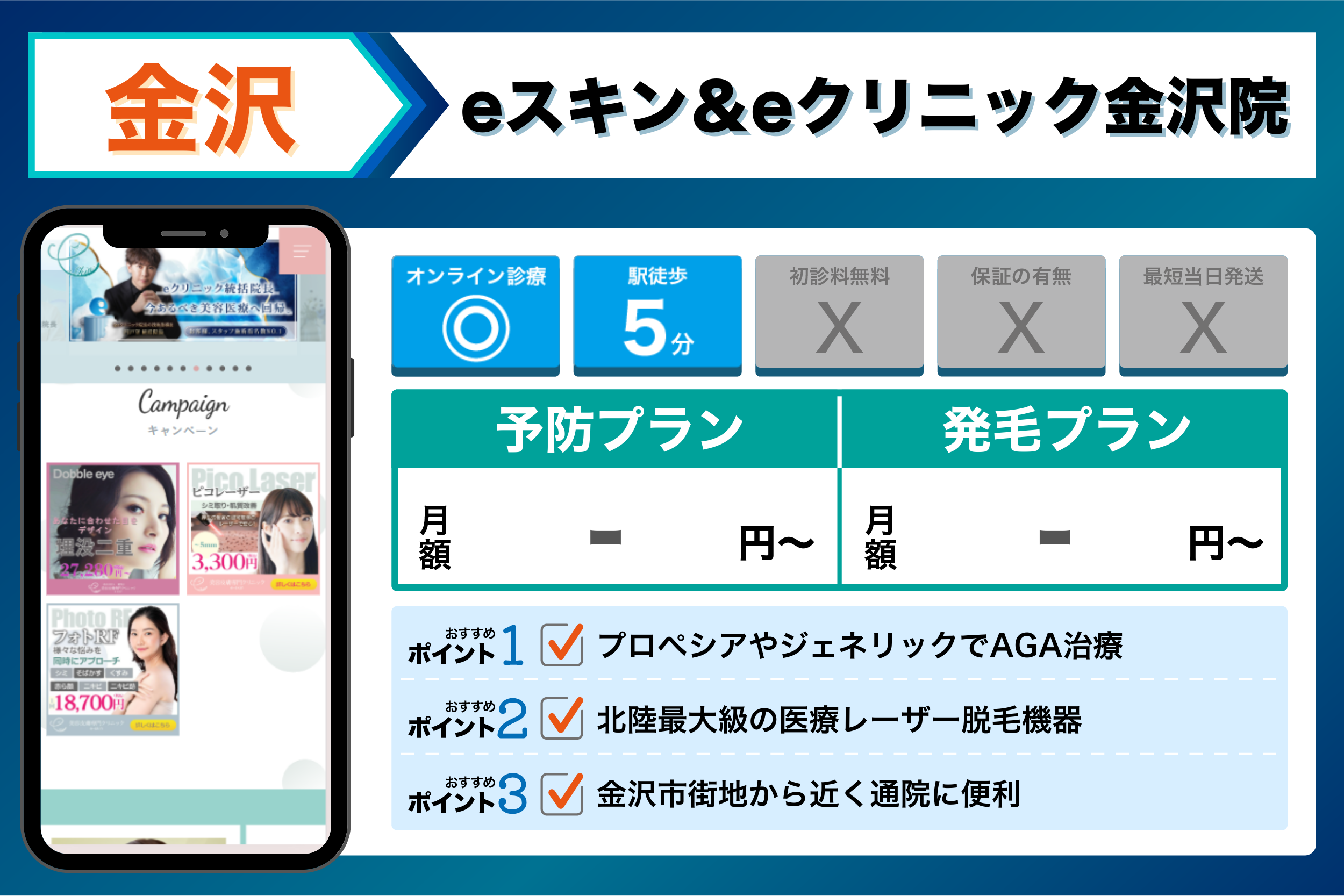 eスキン&eクリニック金沢院 | プロペシアやジェネリックでAGA治療 | 公式サイトに記載なし |
