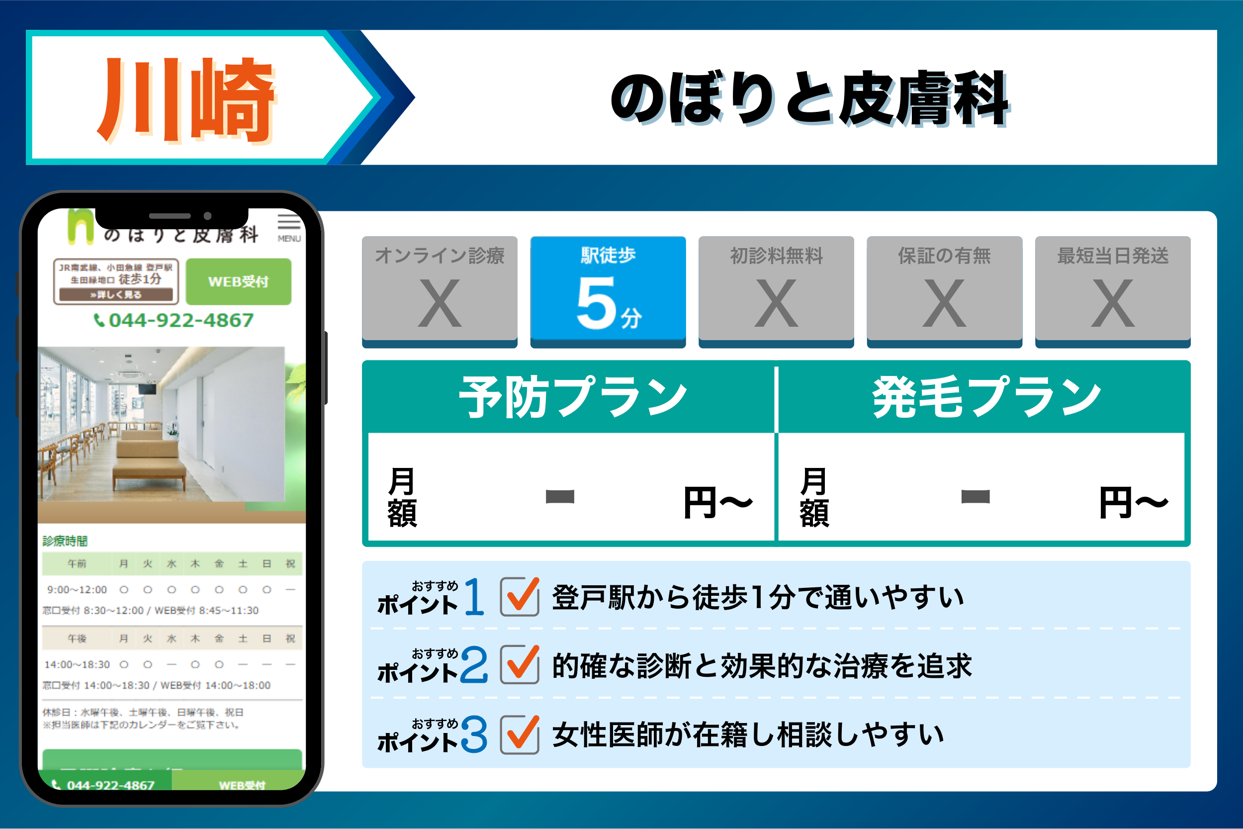 のぼりと皮膚科 | 登戸駅から徒歩1分で通いやすい | 公式サイトに記載なし |