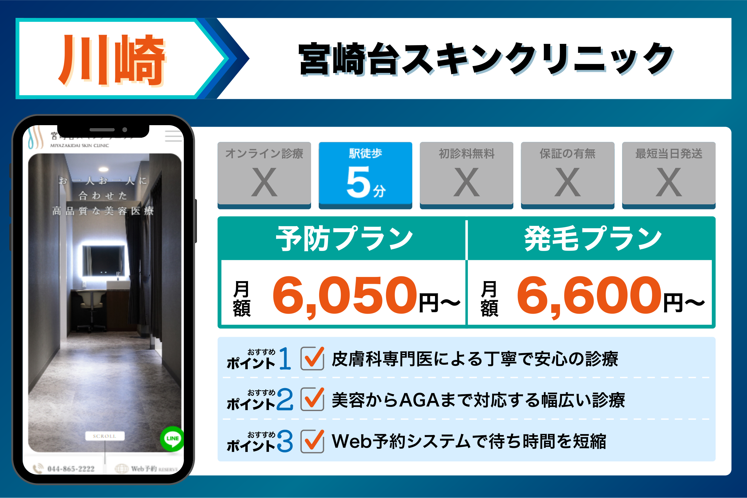 オンライン診療3院は「安さ・手軽さ・通院不要」を、川崎のクリニック9院は「専門医による診断・通いやすさ・治療の選択肢」を重視して選んでいます。まずはオンラインで手軽に治療を始めたいか、あるいは川崎のクリニックで一度しっかりと診察を受けてから判断したいか、ご自身の希望を基準に比較検討してみてください。