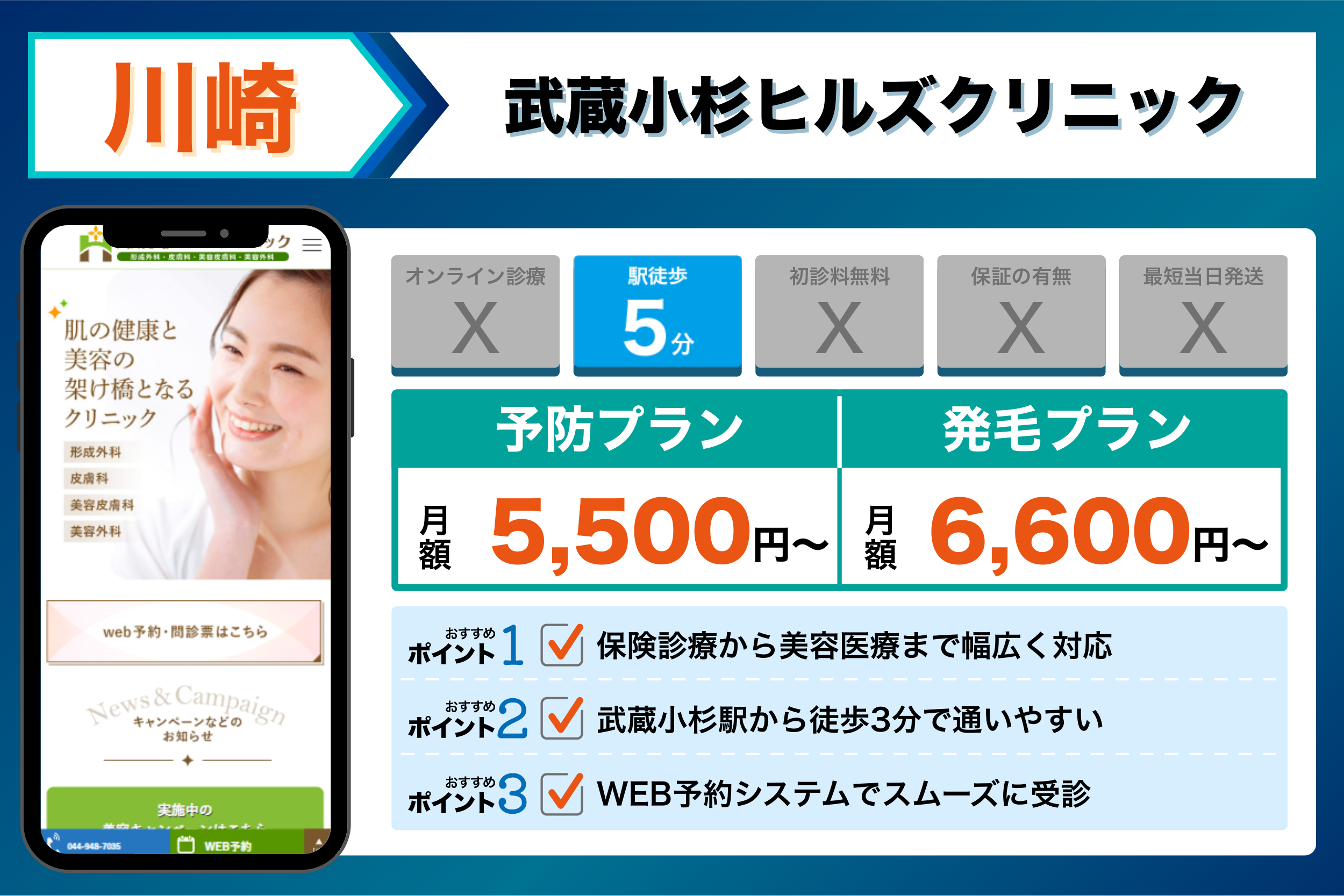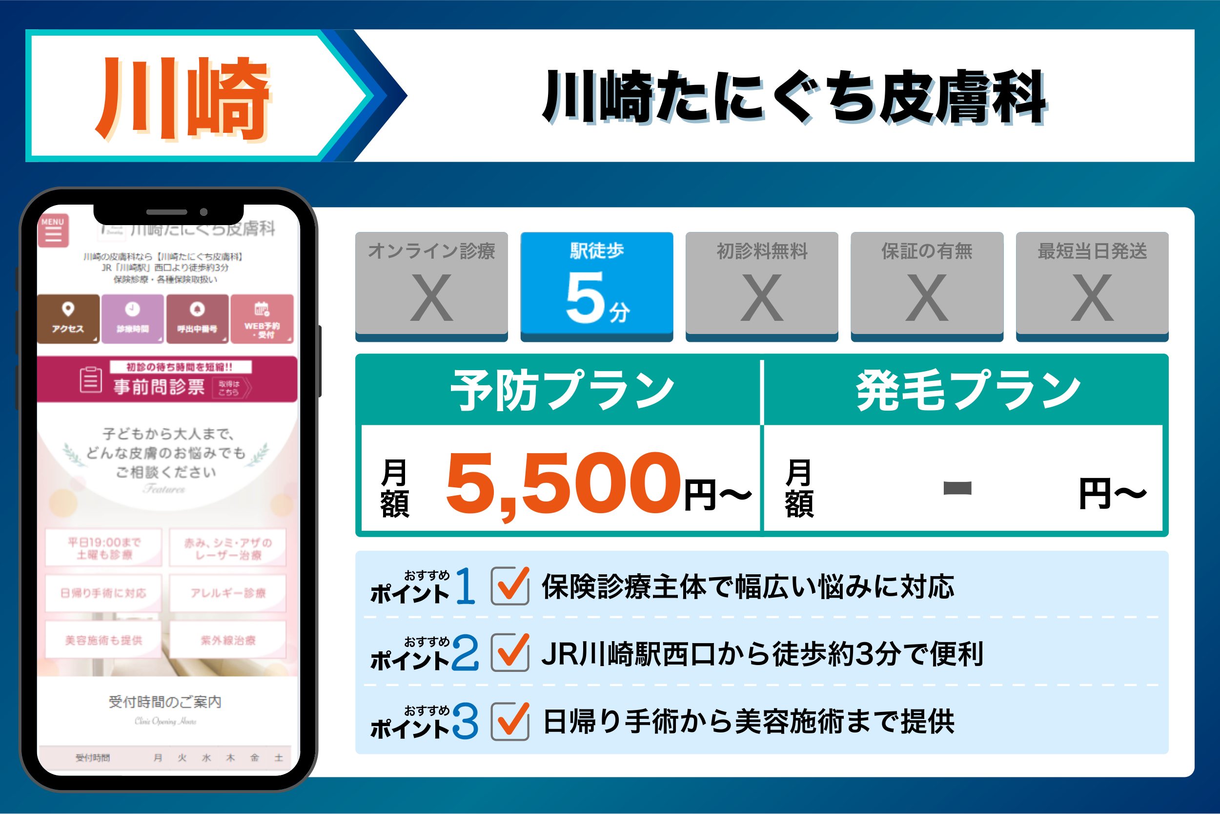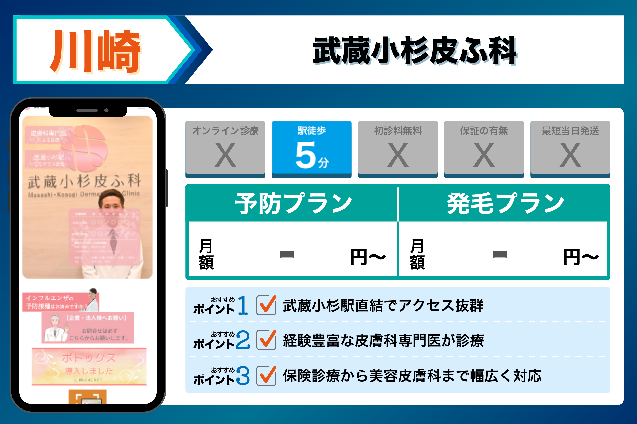 - 実際に通う利便性重視 → 川崎駅徒歩圏内の川崎たにぐち皮膚科や、武蔵小杉駅から近い武蔵小杉皮ふ科など、現地の駅近クリニック