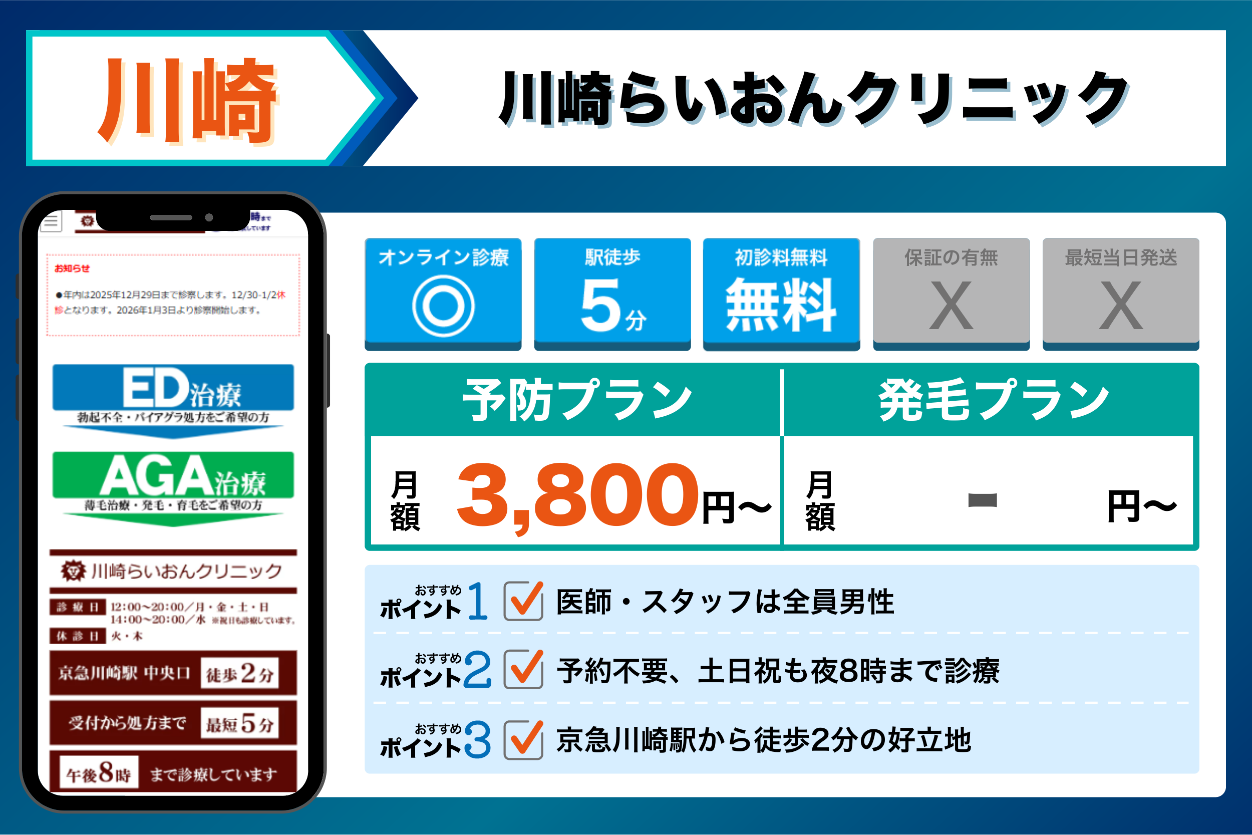 川崎らいおんクリニック | 医師・スタッフは全員男性 | 【予防】:フィナステリド錠1mg:3,800円から |