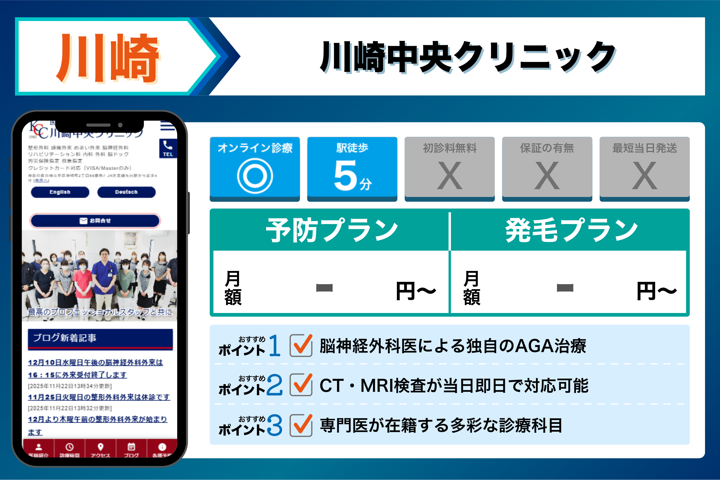 川崎中央クリニック | 脳神経外科医による独自のAGA治療 | クレジットカード(VISA、Master) |