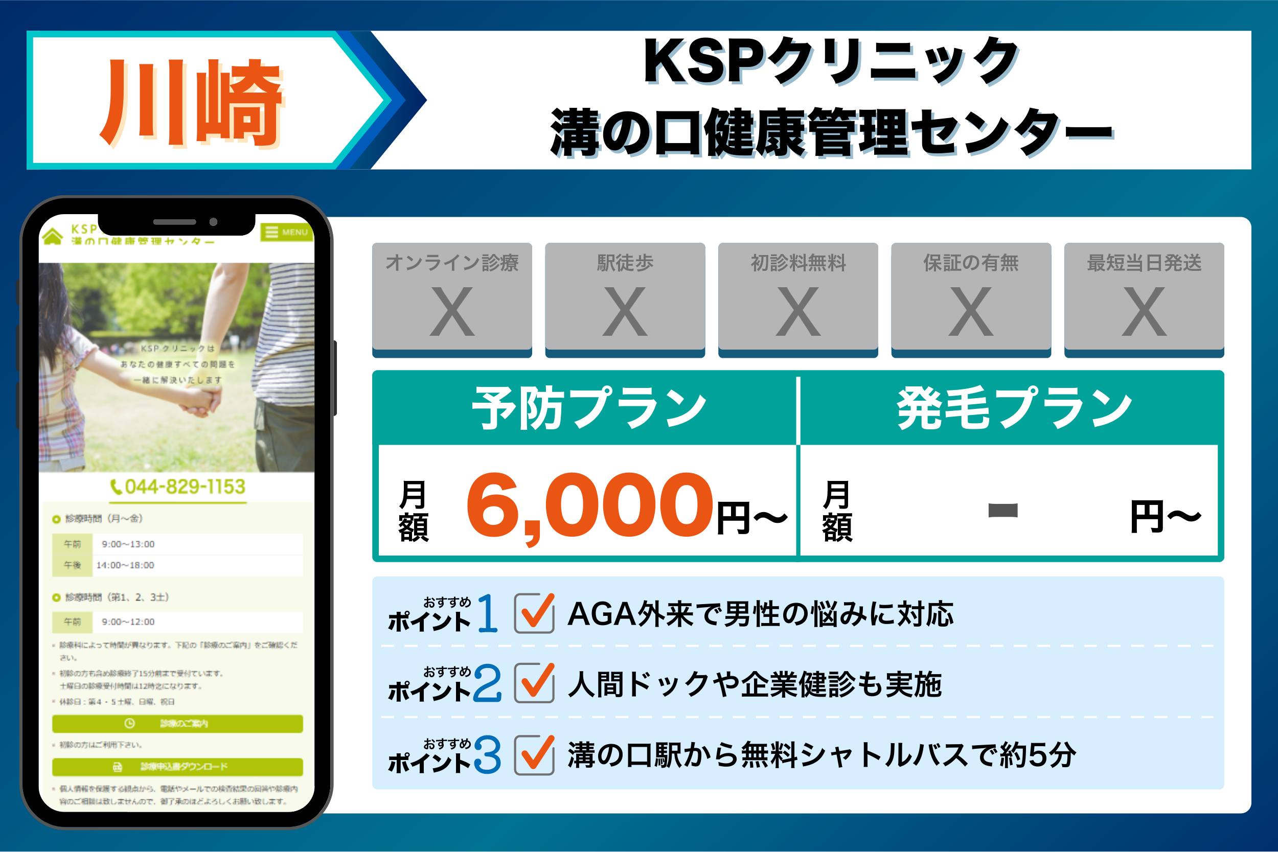 KSPクリニック 溝の口健康管理センター | AGA外来で男性の悩みに対応 | 【予防】:フィナステリド錠1mg:6,000円(税込)から |
