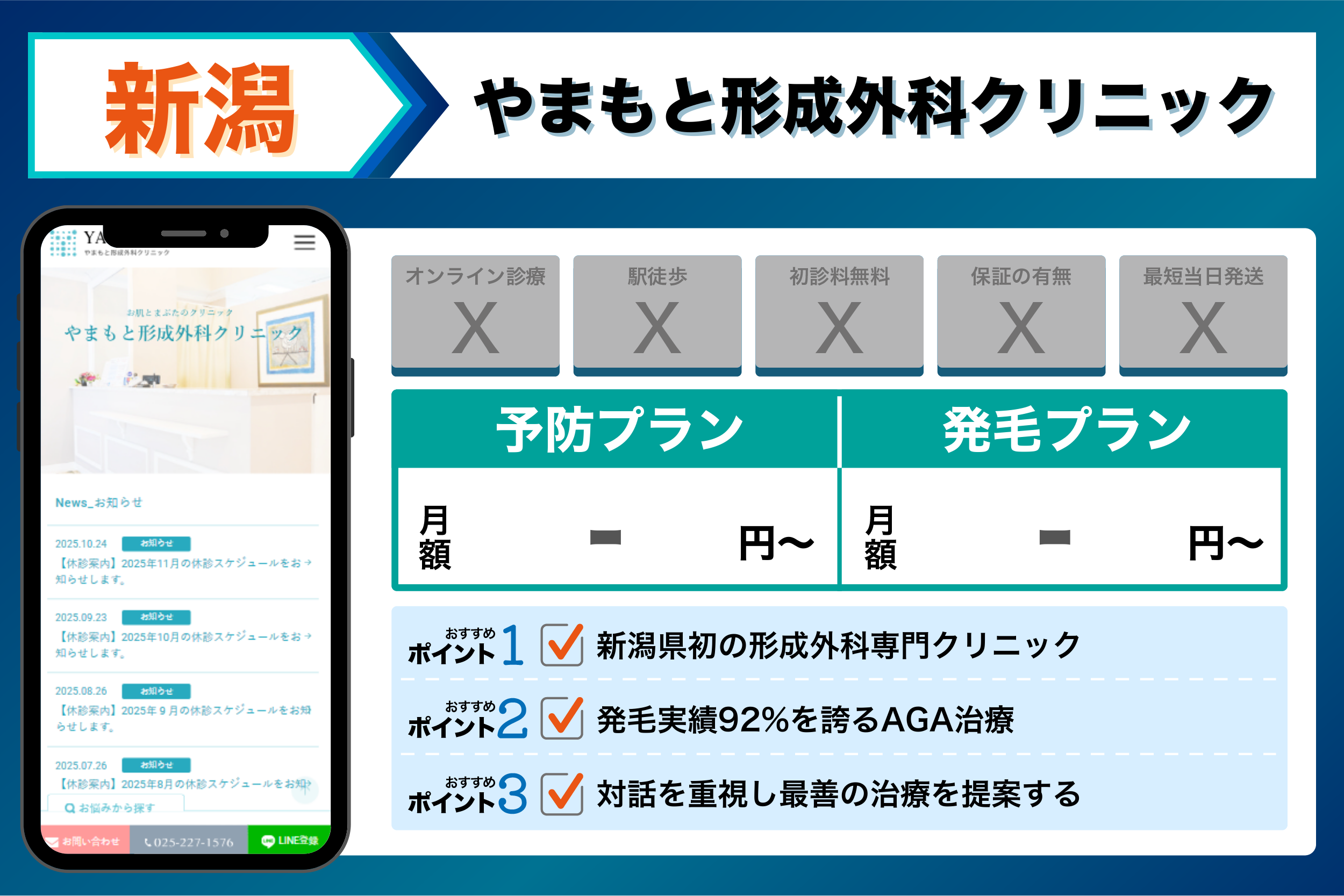 クリニック名詳細ポイント主な治療メニューオンライン診療初診料保証の有無FAGAの対応駅からのアクセス