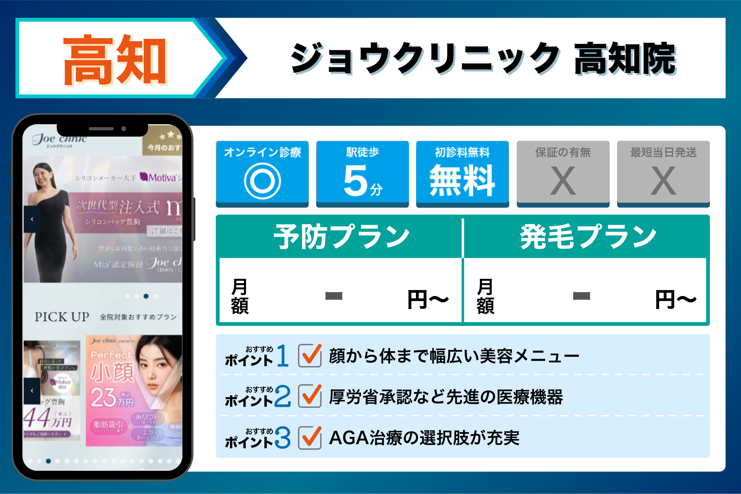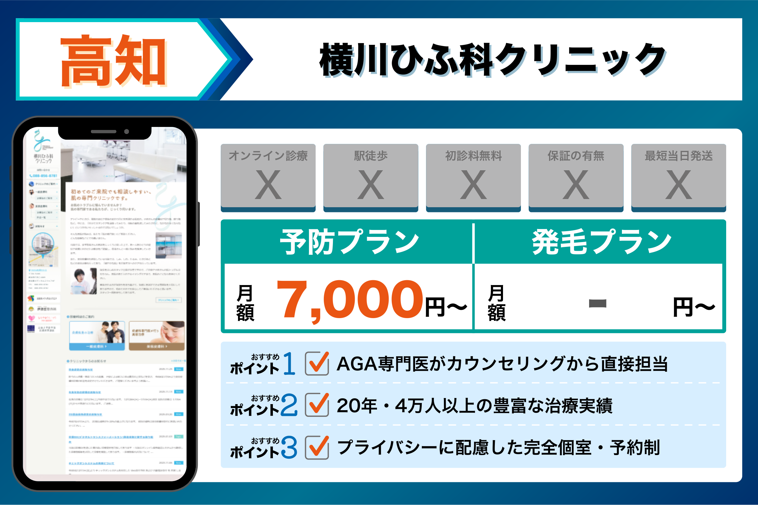 • 高知のAGAクリニック合計9院を調査して、平均相場費用は10,000円以下と比較的安価