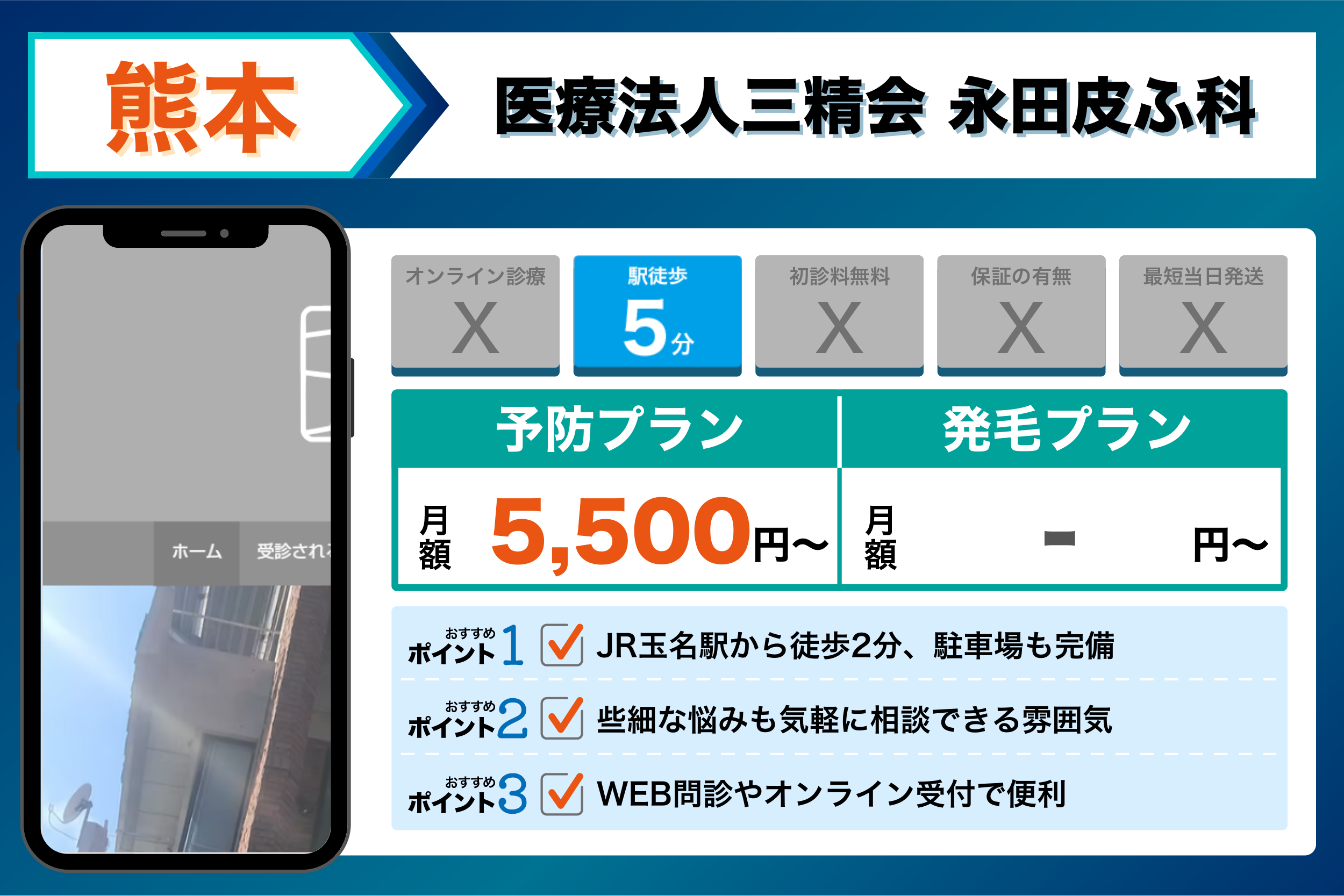医療法人三精会 永田皮ふ科 | JR玉名駅から徒歩2分、駐車場も完備 | 【予防】:デュタステリド:5,500円(税込)から |