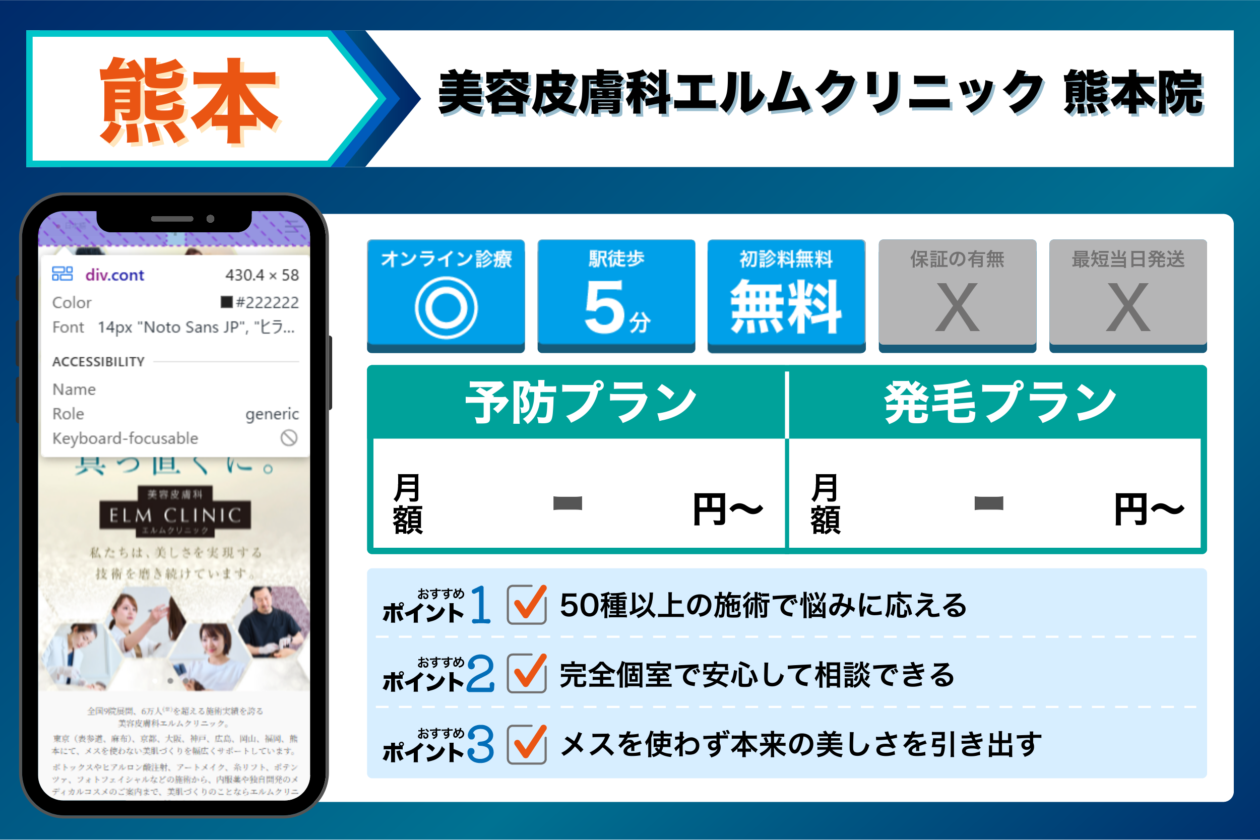 美容皮膚科エルムクリニック 熊本院 | 50種以上の施術で悩みに応える | 公式サイトに記載なし |