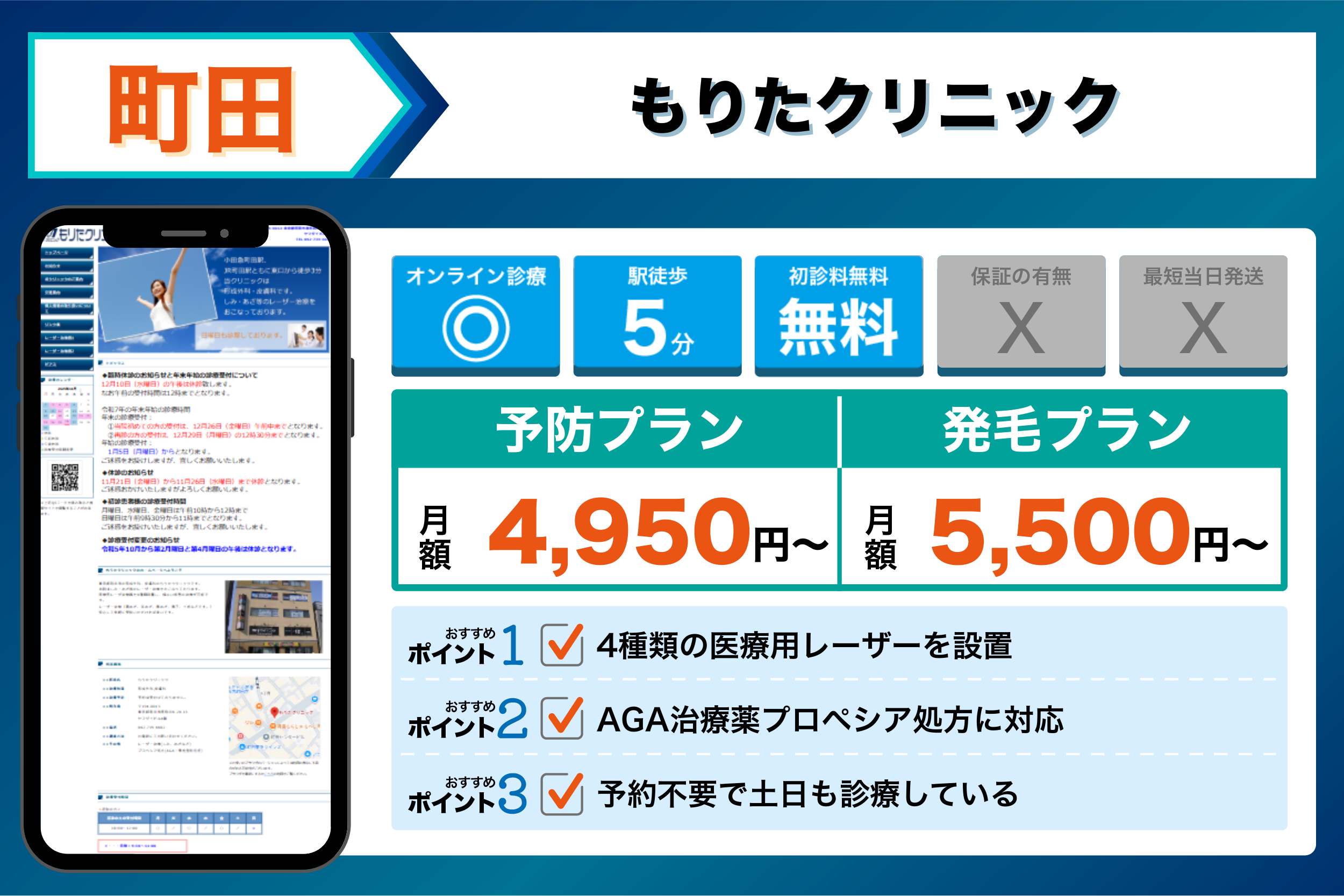 もりたクリニック | 4種類の医療用レーザーを設置 | 【発毛】:ミノキシジル内服薬:5,500円(税込)から| |