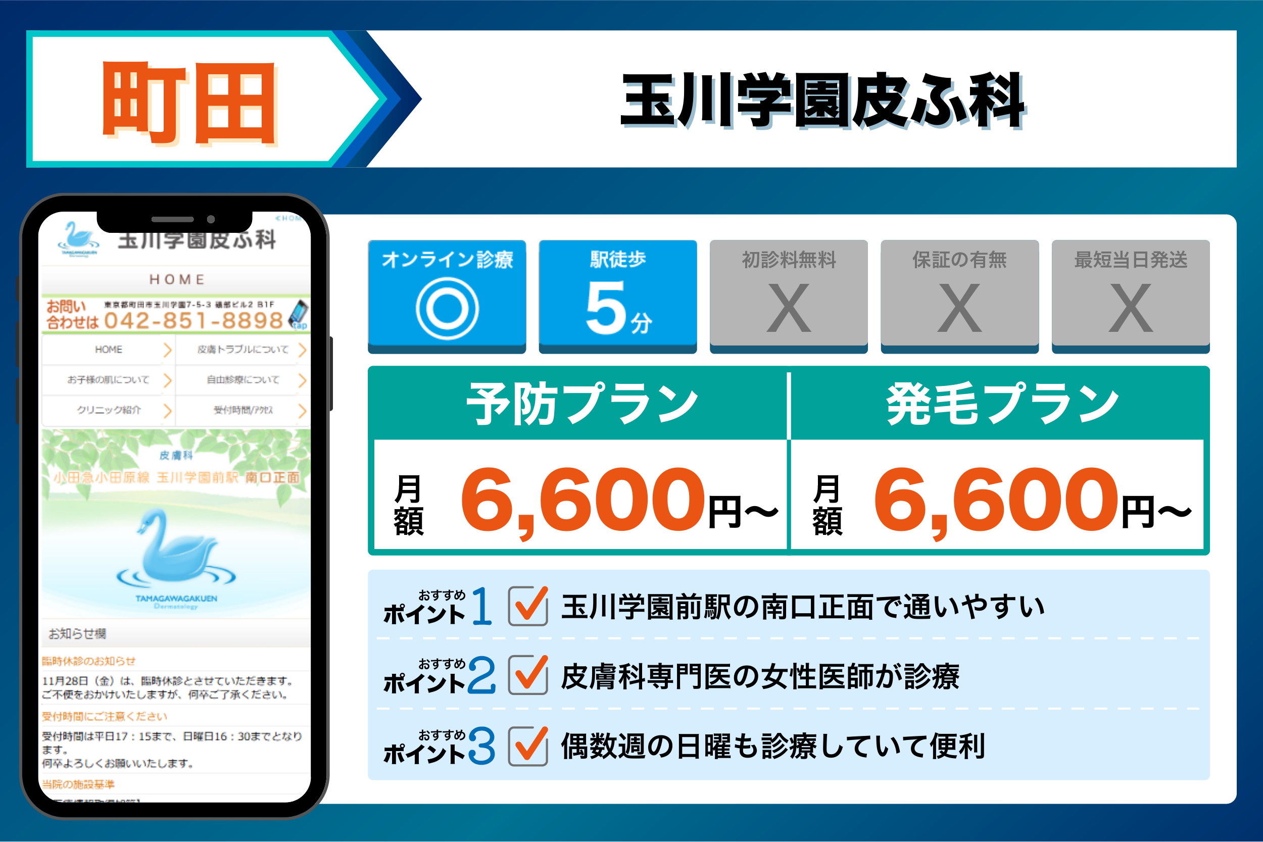 玉川学園皮ふ科 | 玉川学園前駅の南口正面で通いやすい | 【発毛】:ミノキシジル外用液5%:6,600円(税込)から| |
