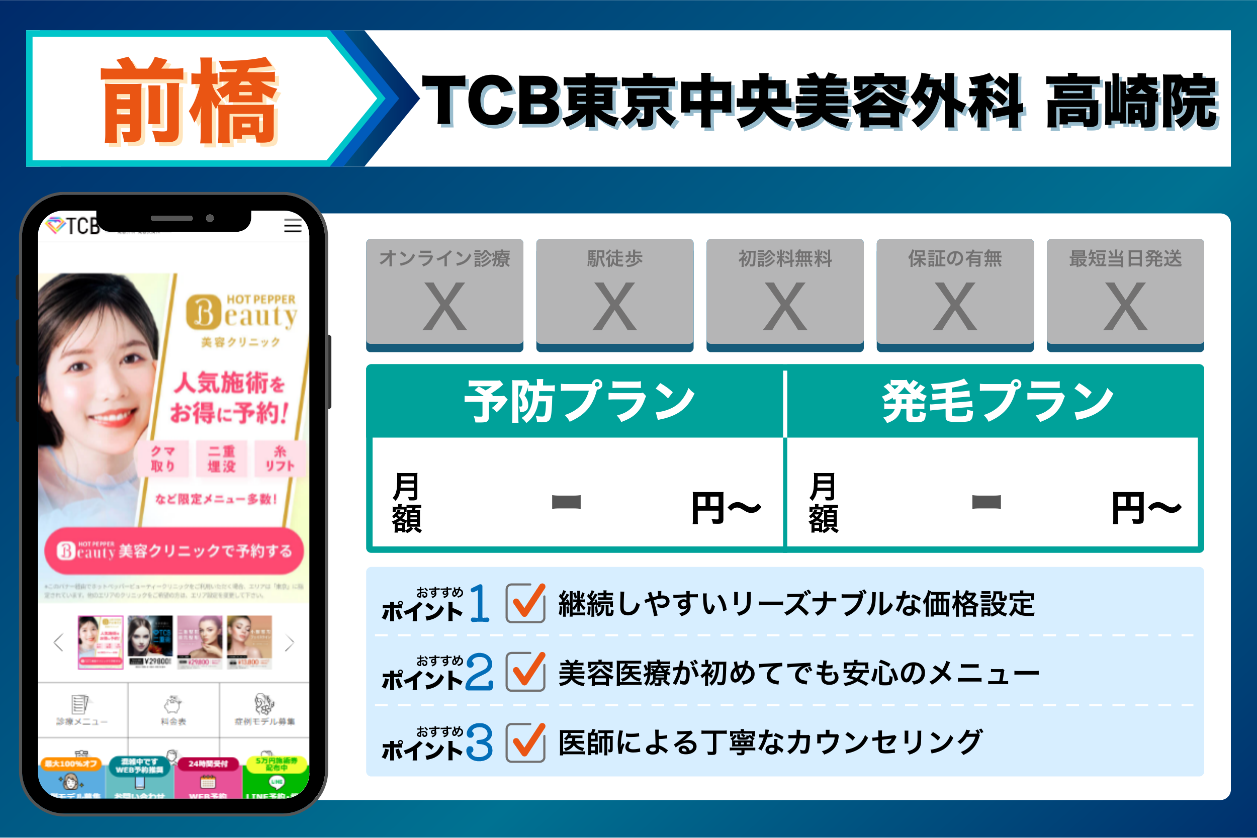 TCB東京中央美容外科 高崎院 | 継続しやすいリーズナブルな価格設定 | 公式サイトに記載なし |