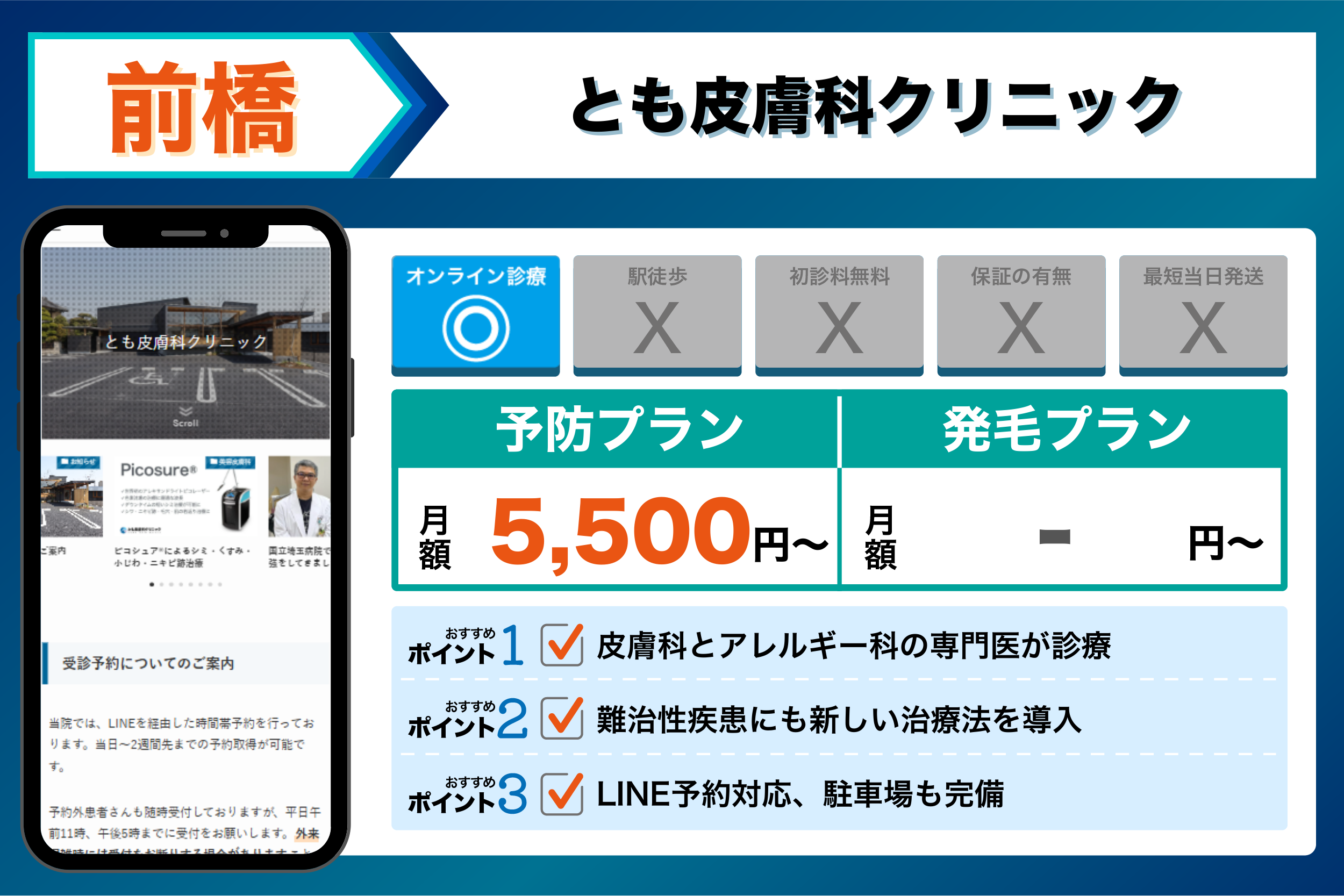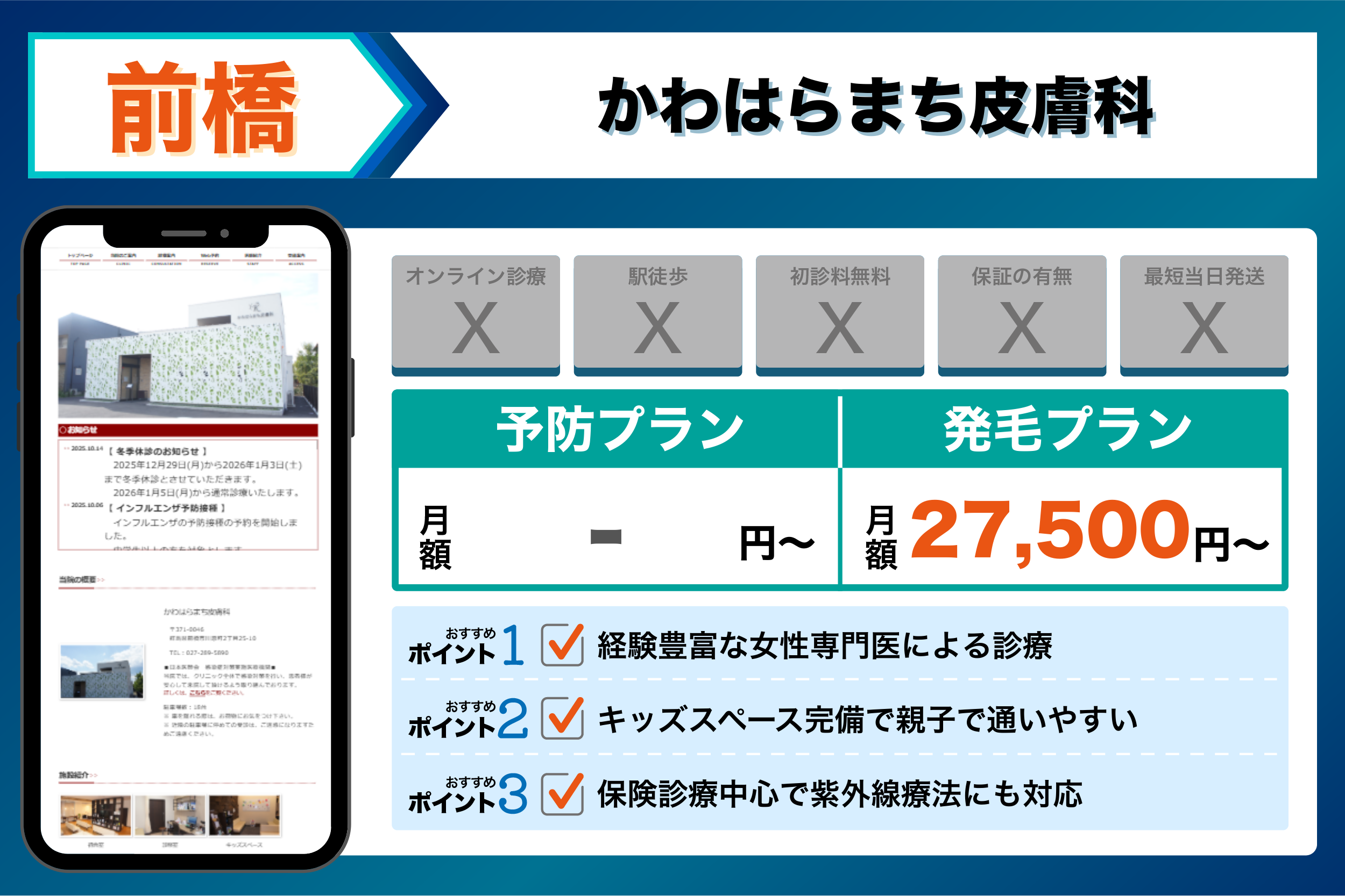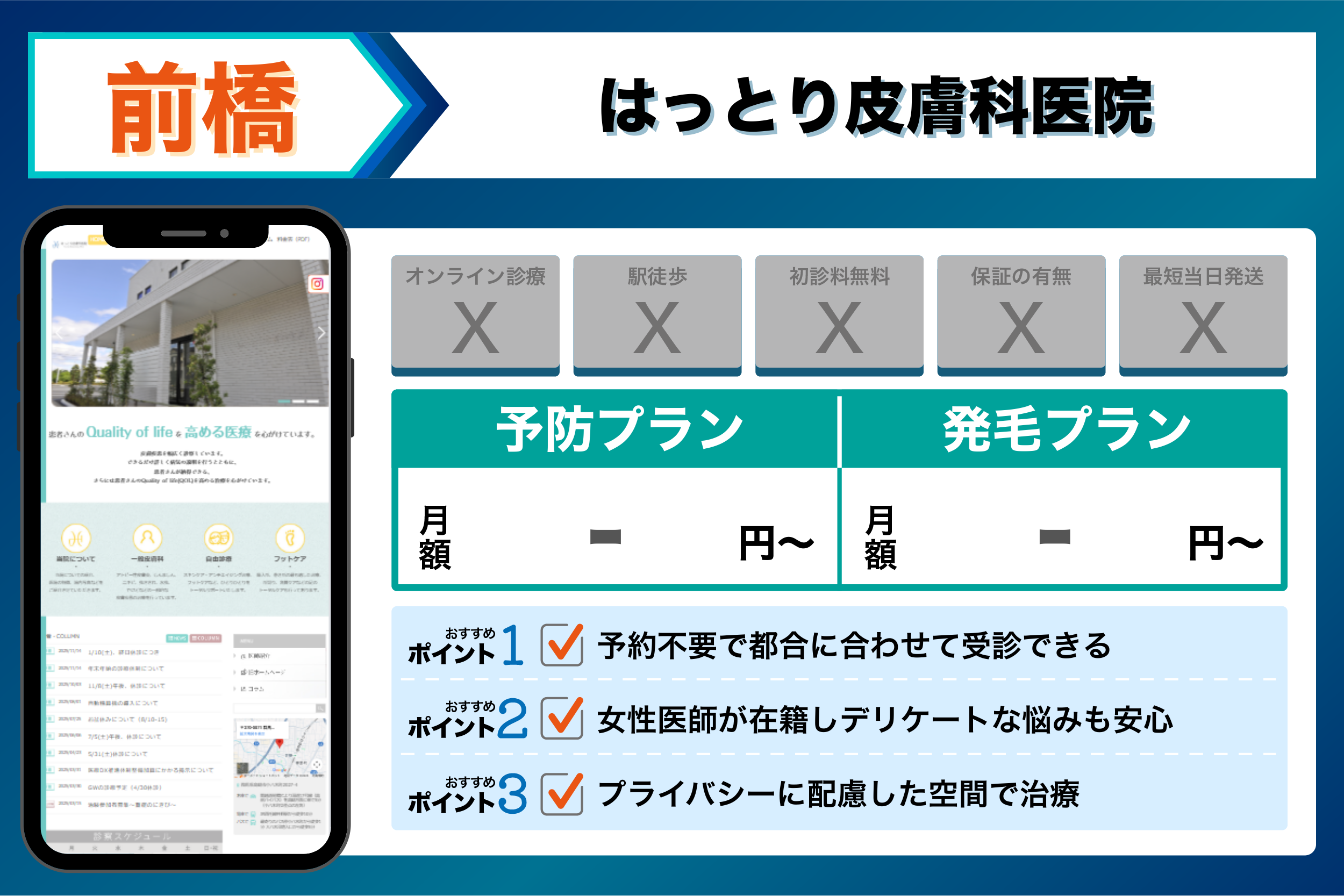 - 実際に通う利便性重視 → 群馬県前橋駅徒歩圏内のシンシアガーデンクリニックメンズ高崎院や、井野駅から近いはっとり皮膚科医院など、現地の駅近クリニック