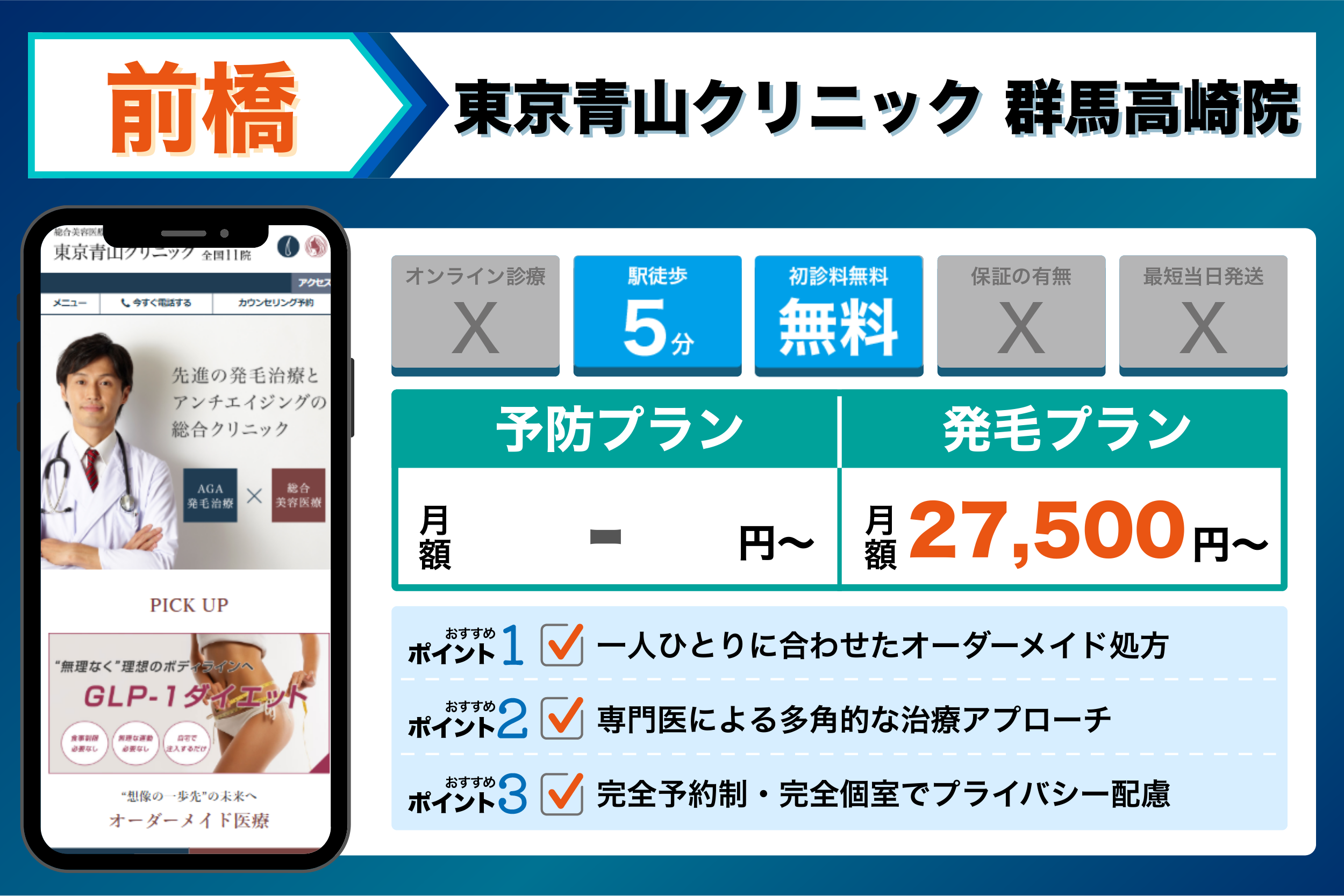 東京青山クリニック高崎院 | 一人ひとりに合わせたオーダーメイド処方 | 【発毛】:オーダーメイドAGA処方薬 (ミノキシジル+フィナステリド+各種ビタミン):25,000円/月 (税込27,500円)から |