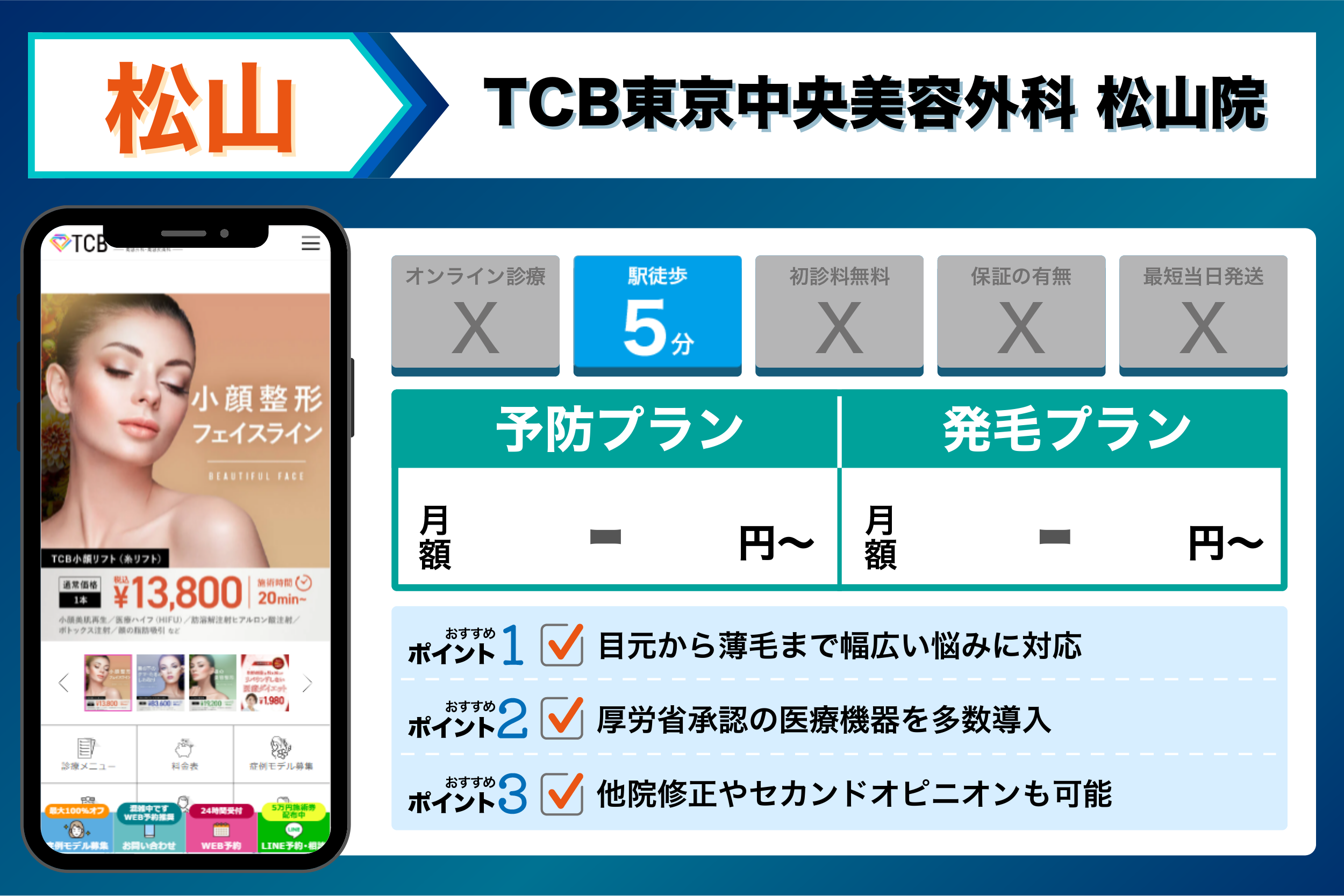 TCB東京中央美容外科 松山院 | 目元から薄毛まで幅広い悩みに対応 | 公式サイトに記載なし |
