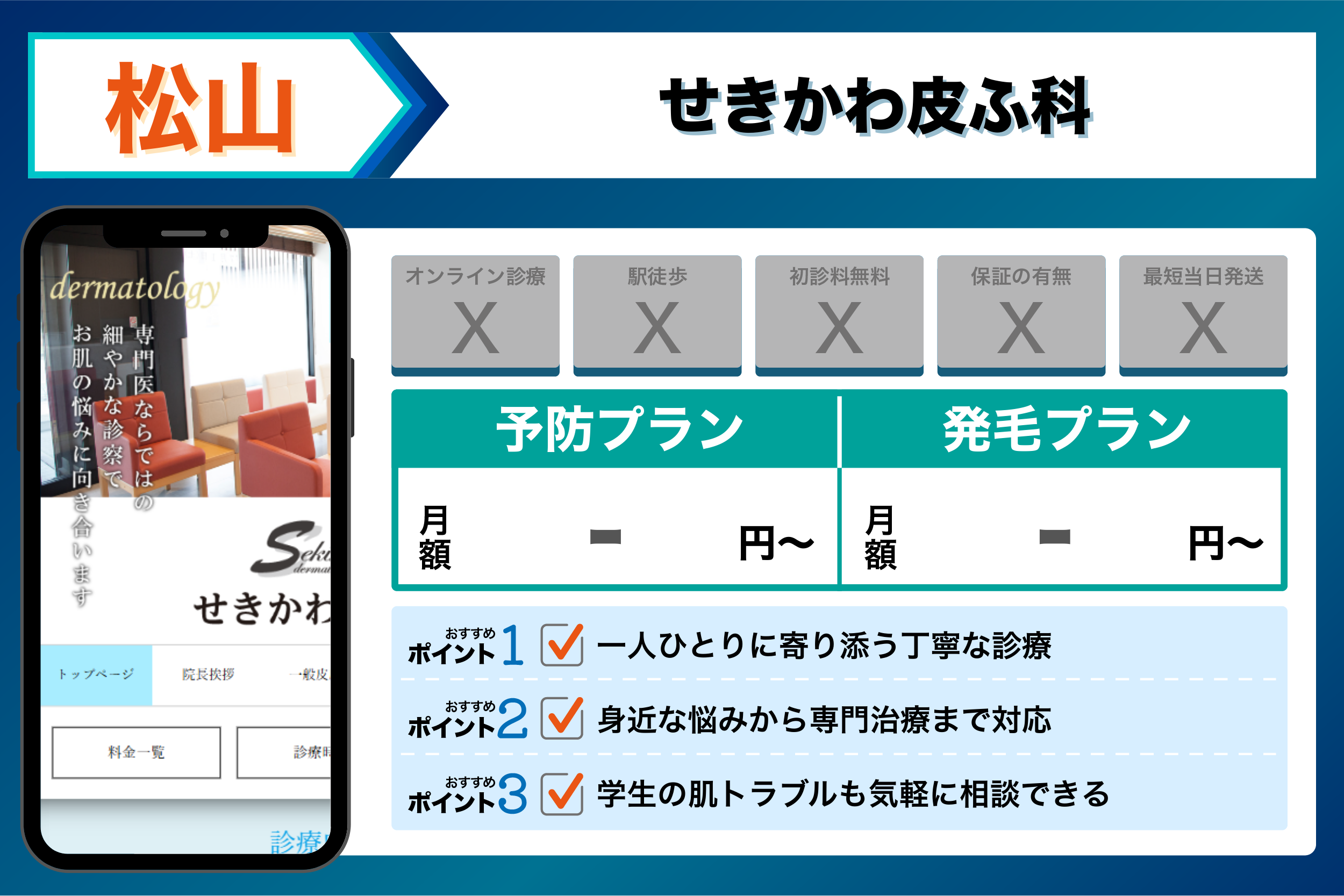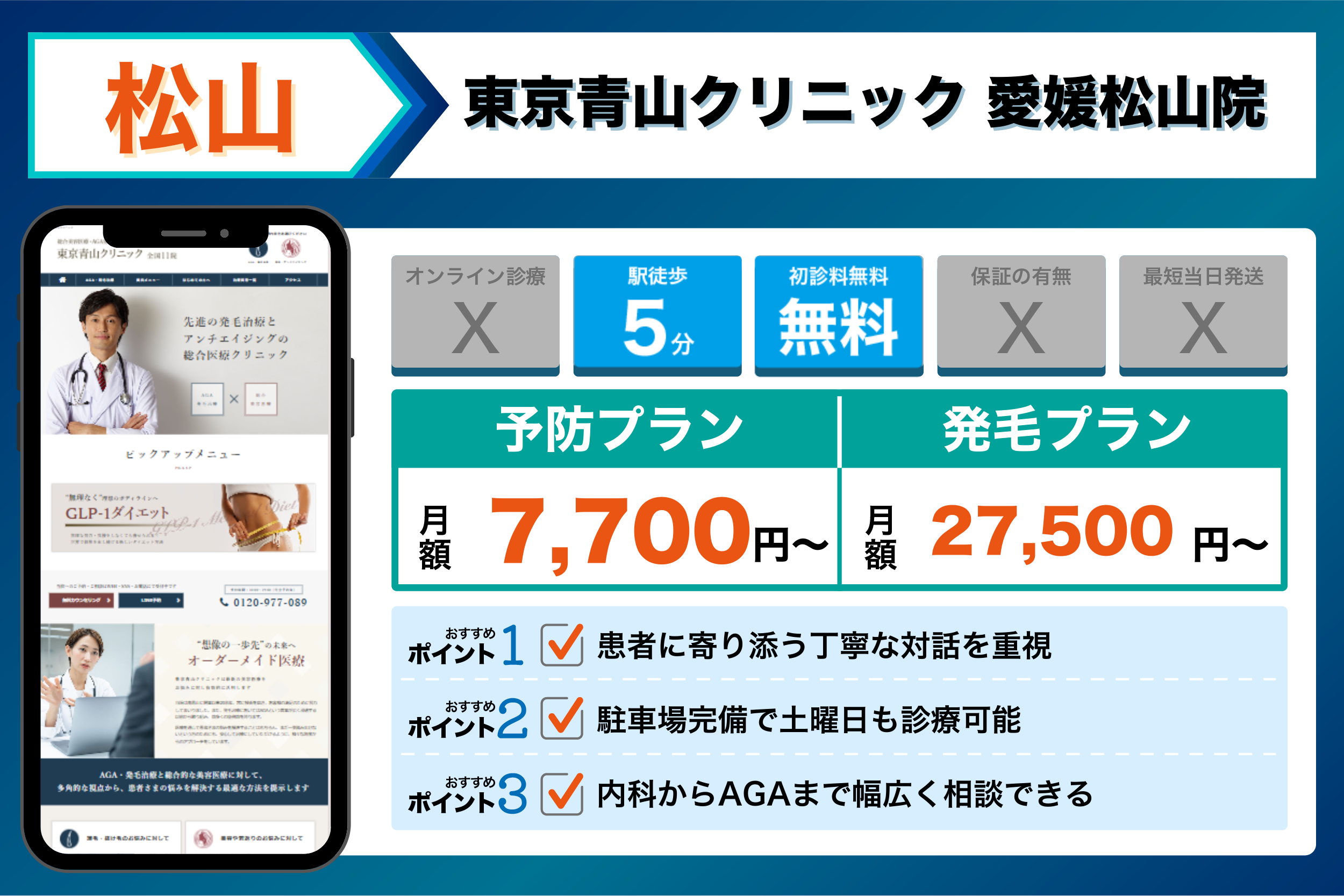 松山のAGAクリニックを調査してことで、AGA治療の平均相場・駅からのアクセス・初心者でも始めやすいサポート体制が整っているクリニックが明らかになりました。