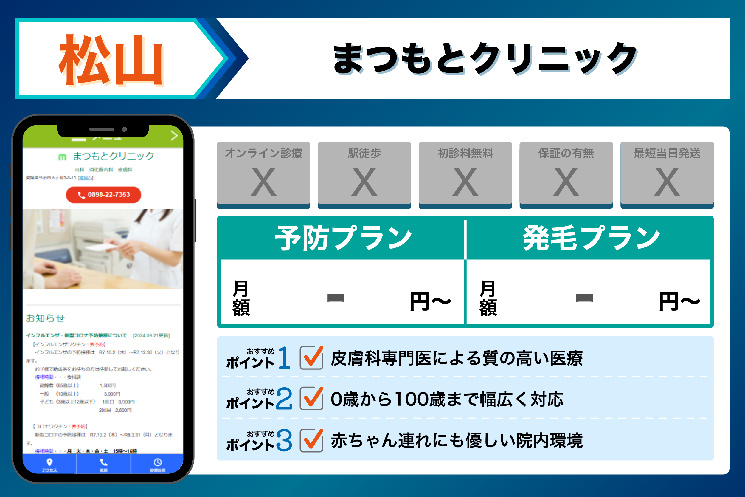 これらを踏まえて、4つの観点から選ぶ松山でおすすめのクリニックは以下のようになりました。