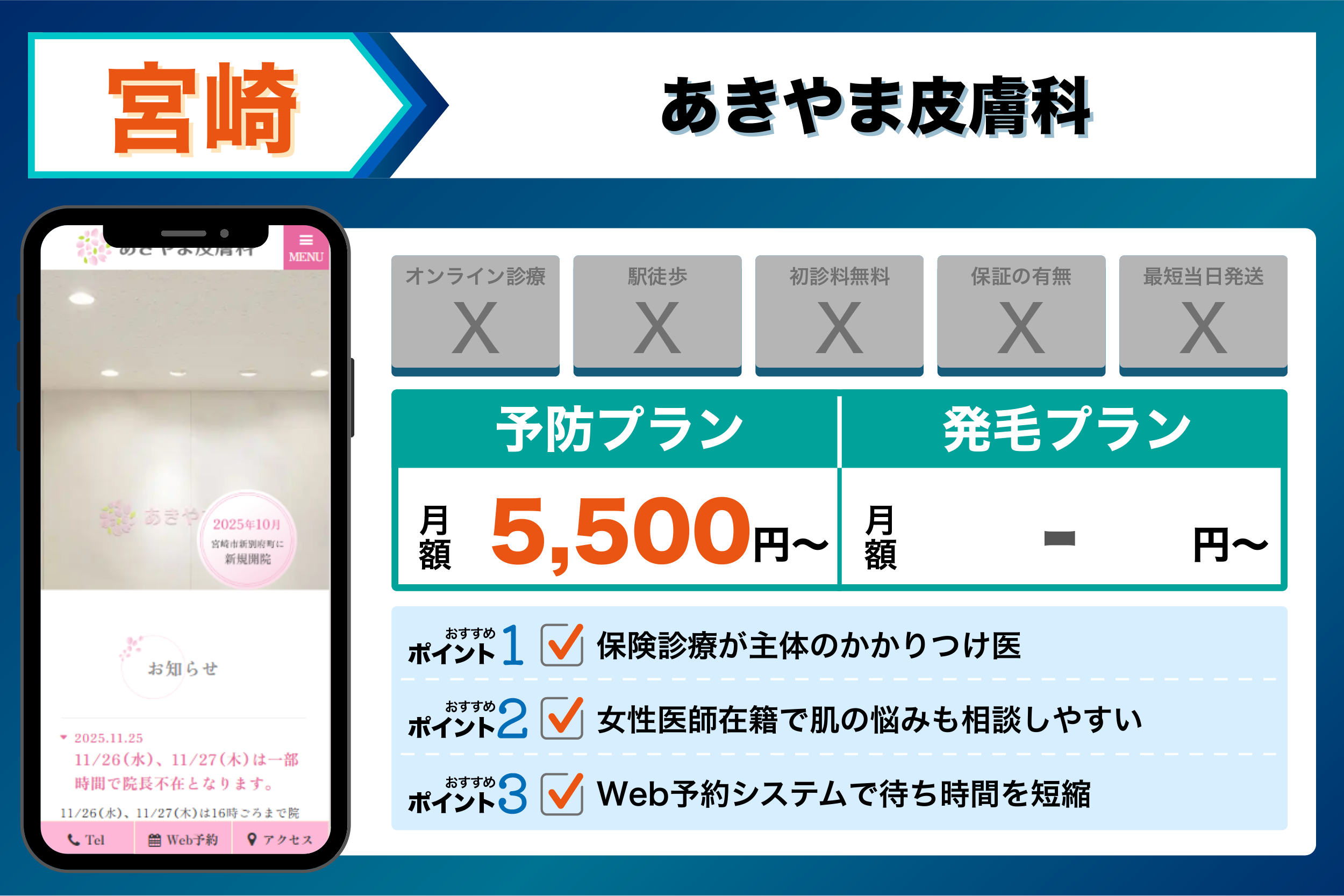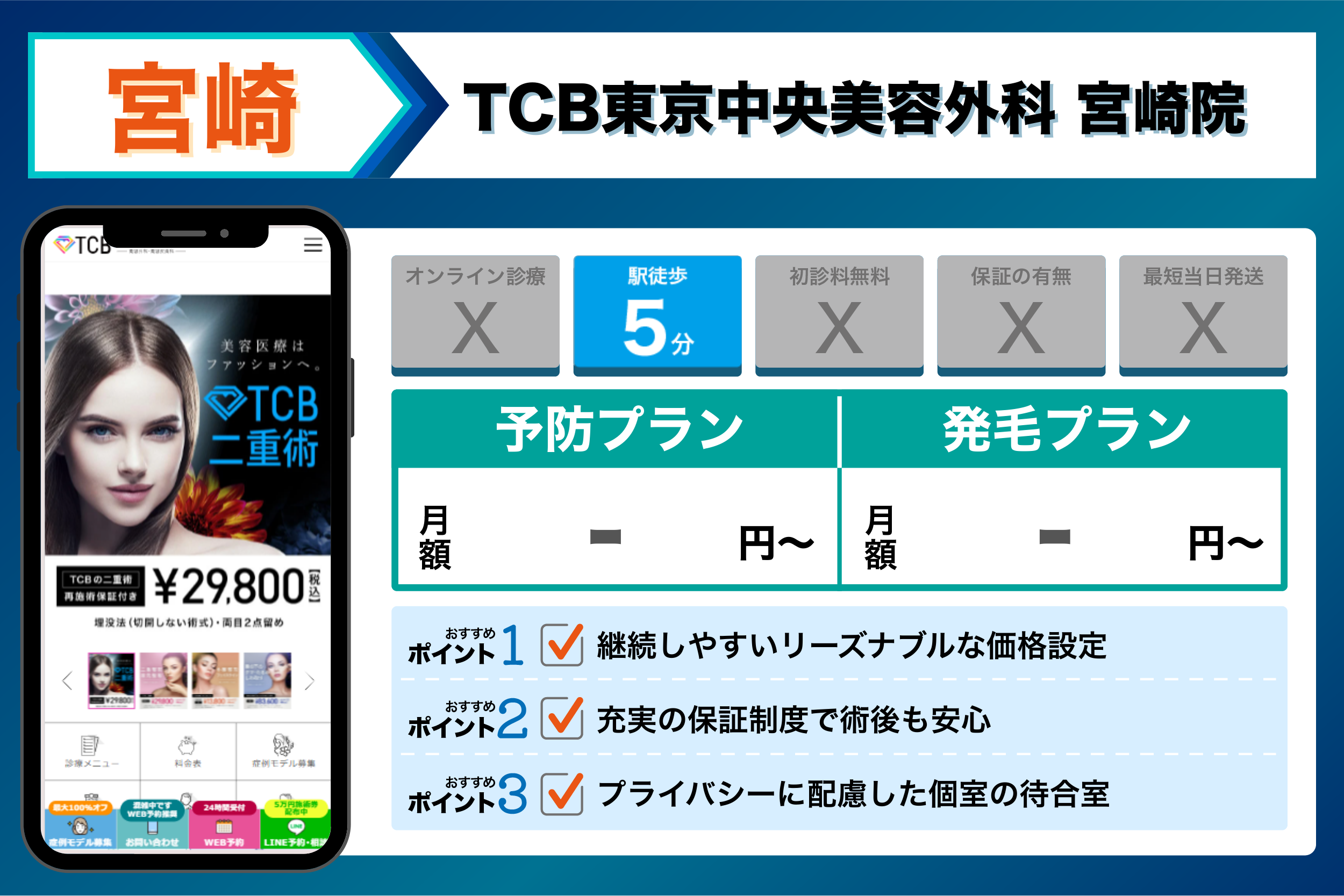 • 実際に通う利便性重視 → 宮崎駅徒歩圏内のTCB東京中央美容外科 宮崎院や、イオンモール宮崎店から近いあきやま皮膚科など、現地の駅近クリニック