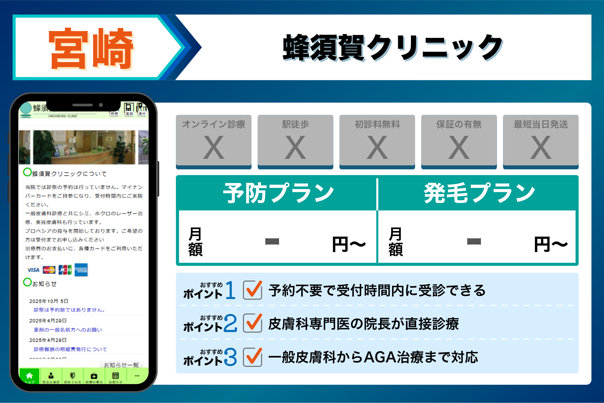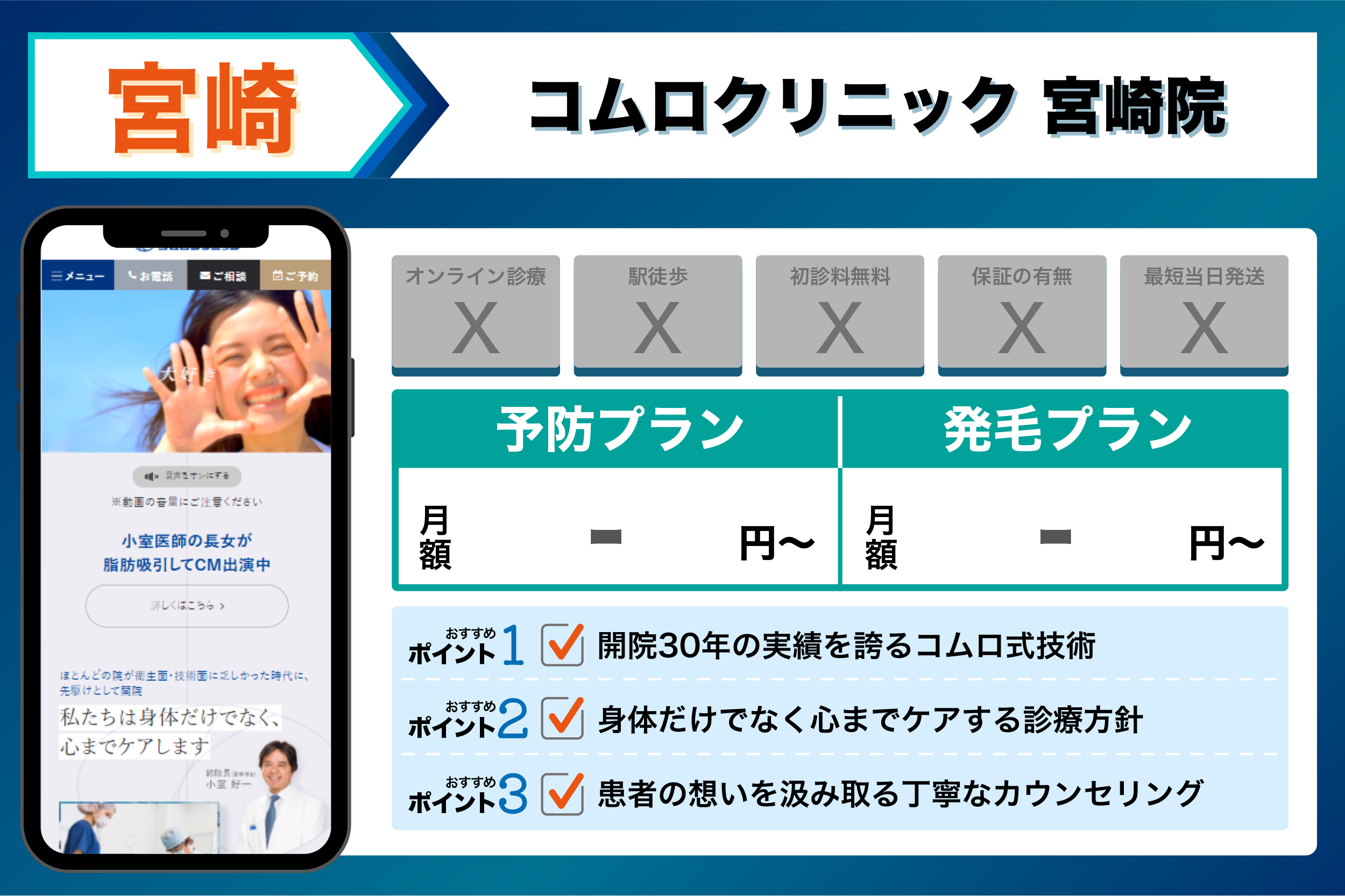 宮崎のAGAクリニックを調査してことで、AGA治療の平均相場・駅からのアクセス・初心者でも始めやすいサポート体制が整っているクリニックが明らかになりました。