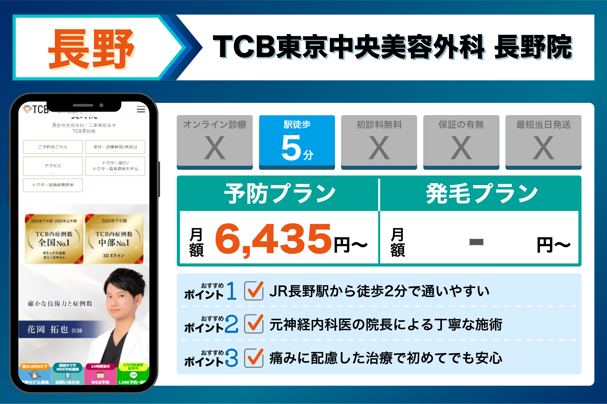 TCB東京中央美容外科 長野院 | 痛みに配慮した治療で初めてでも安心 | 【予防】:フィナステリド:¥6,435から |