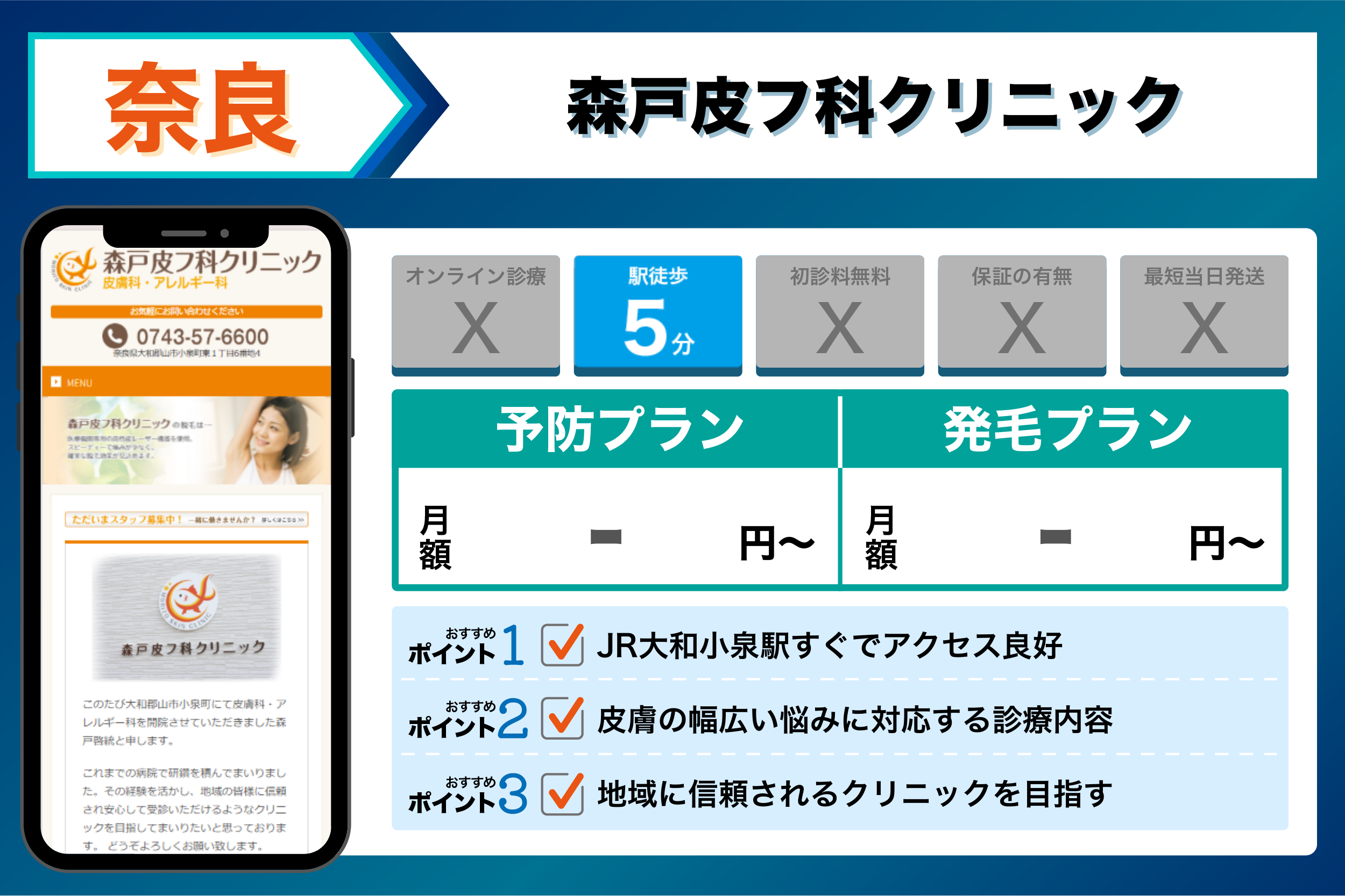 森戸皮フ科クリニック | JR大和小泉駅すぐでアクセス良好 | 公式サイトに記載なし |