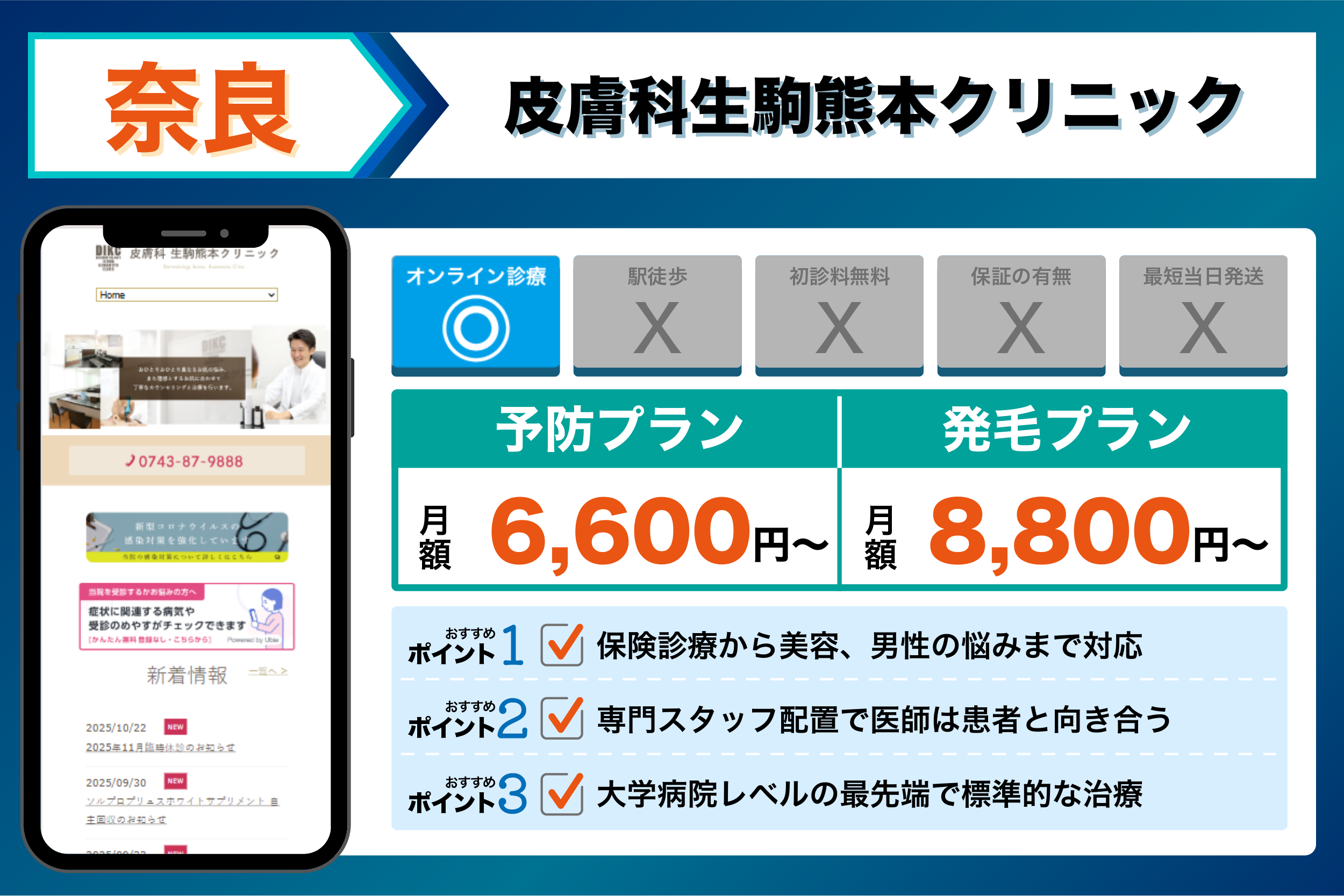 皮膚科生駒熊本クリニック | 保険診療から美容、男性の悩みまで対応 | 【発毛】:ミノキシジル内服5㎎ (初回):初診料3,300円(税別) お薬代 8,800円(税込)から| |