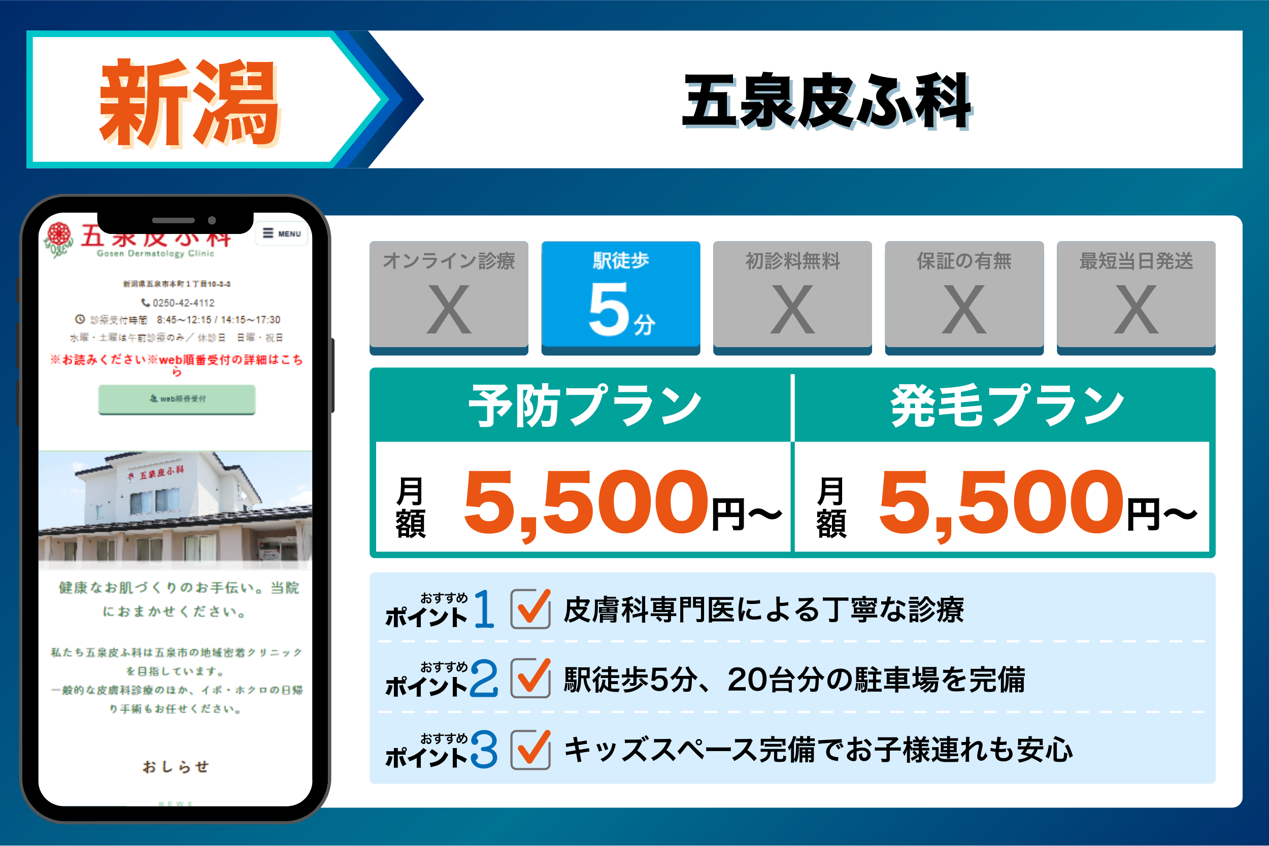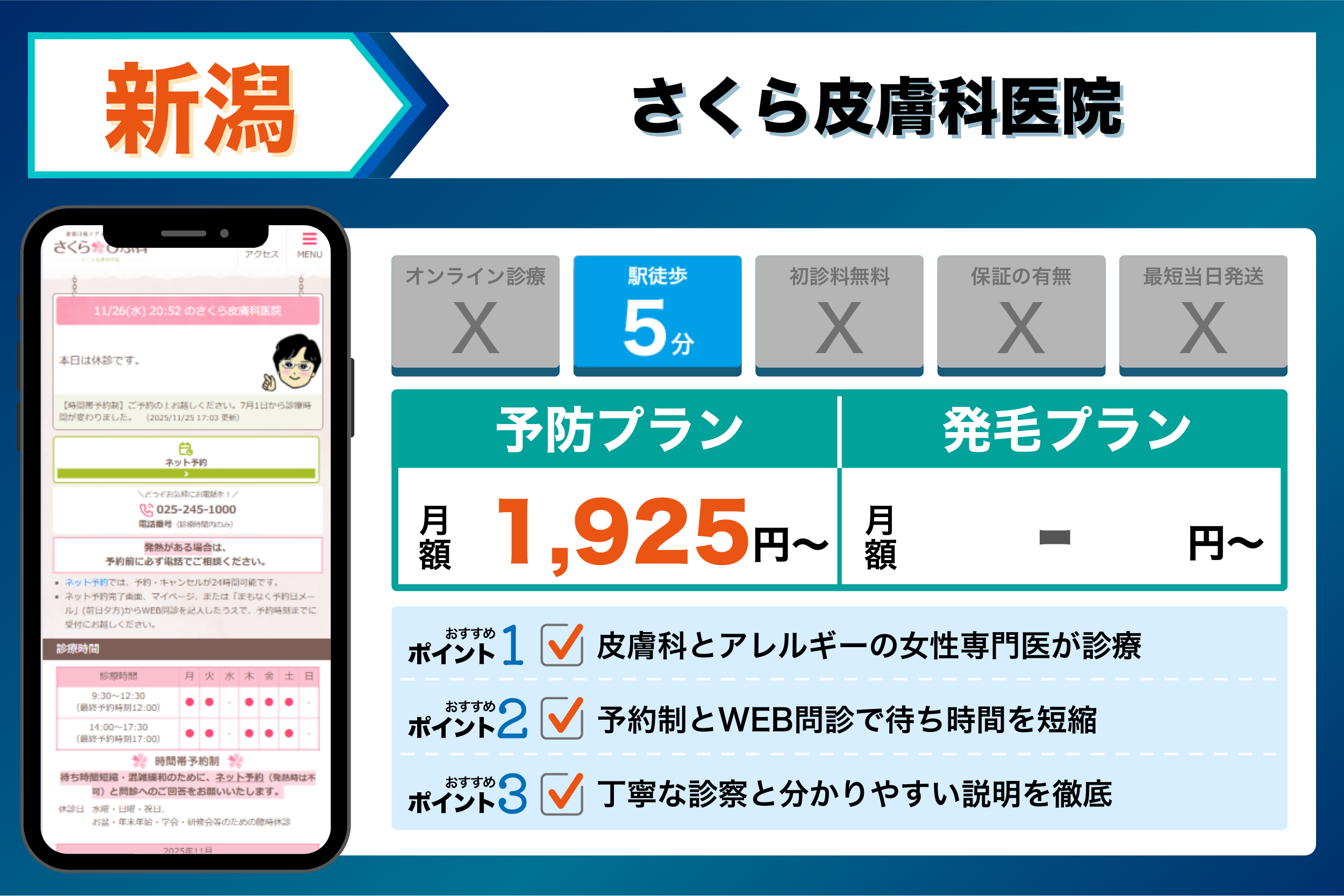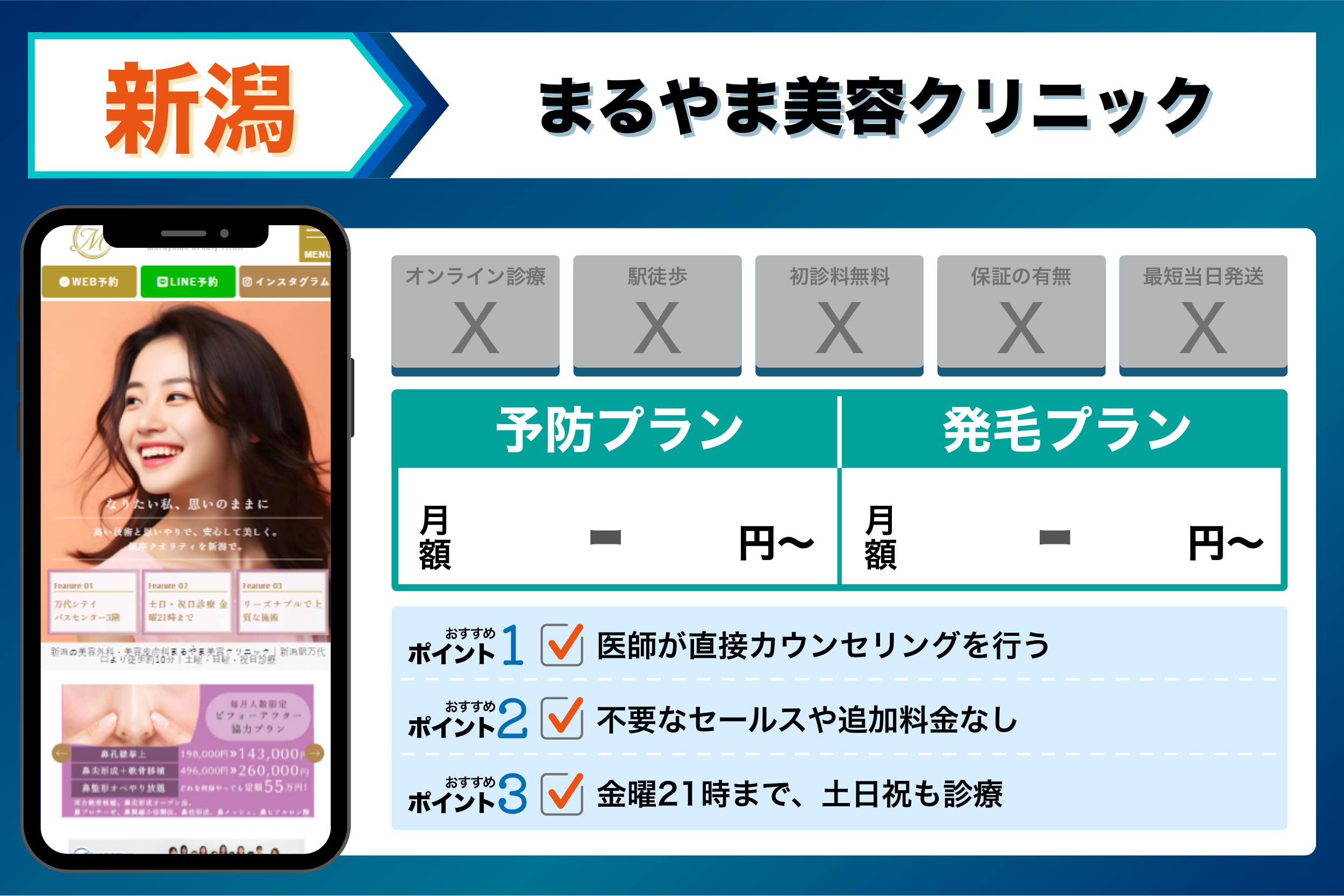 • 実際に通う利便性重視 → 新潟駅徒歩圏内のまるやま美容クリニックや、五泉駅から近い五泉皮ふ科など、現地の駅近クリニック