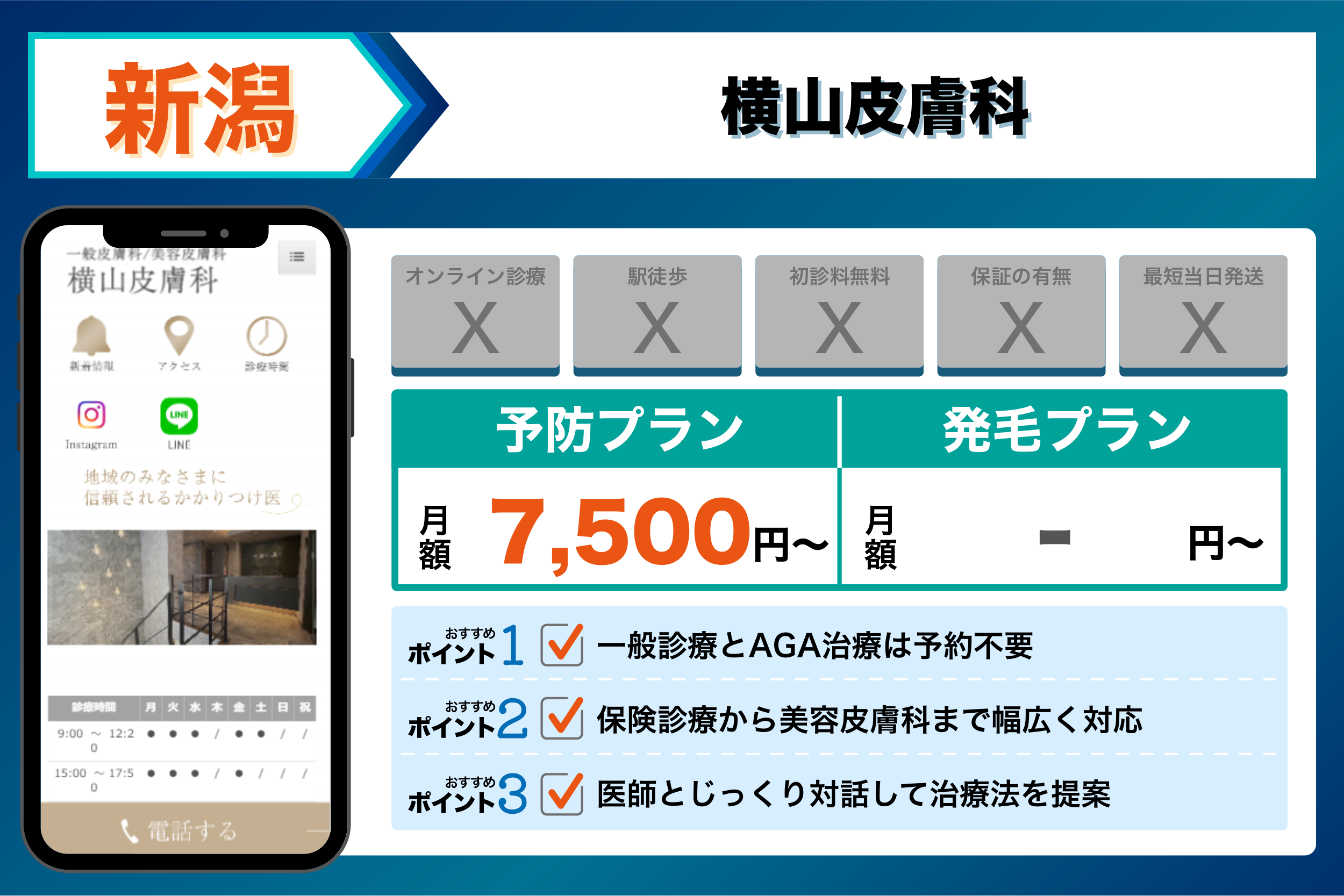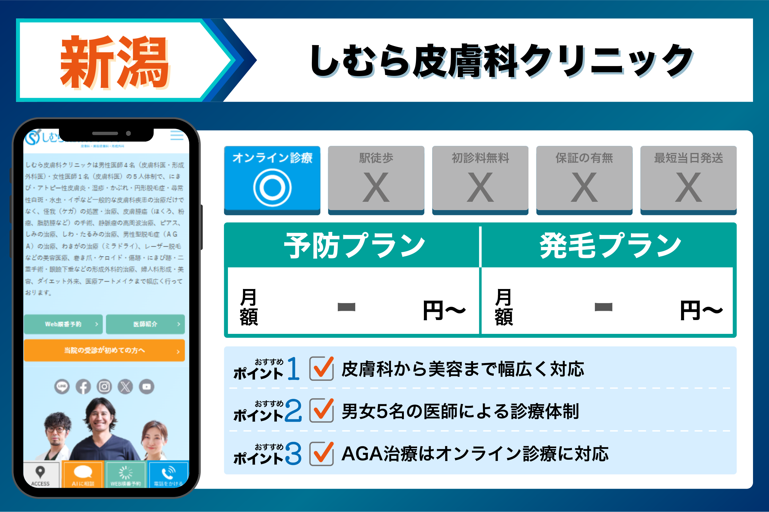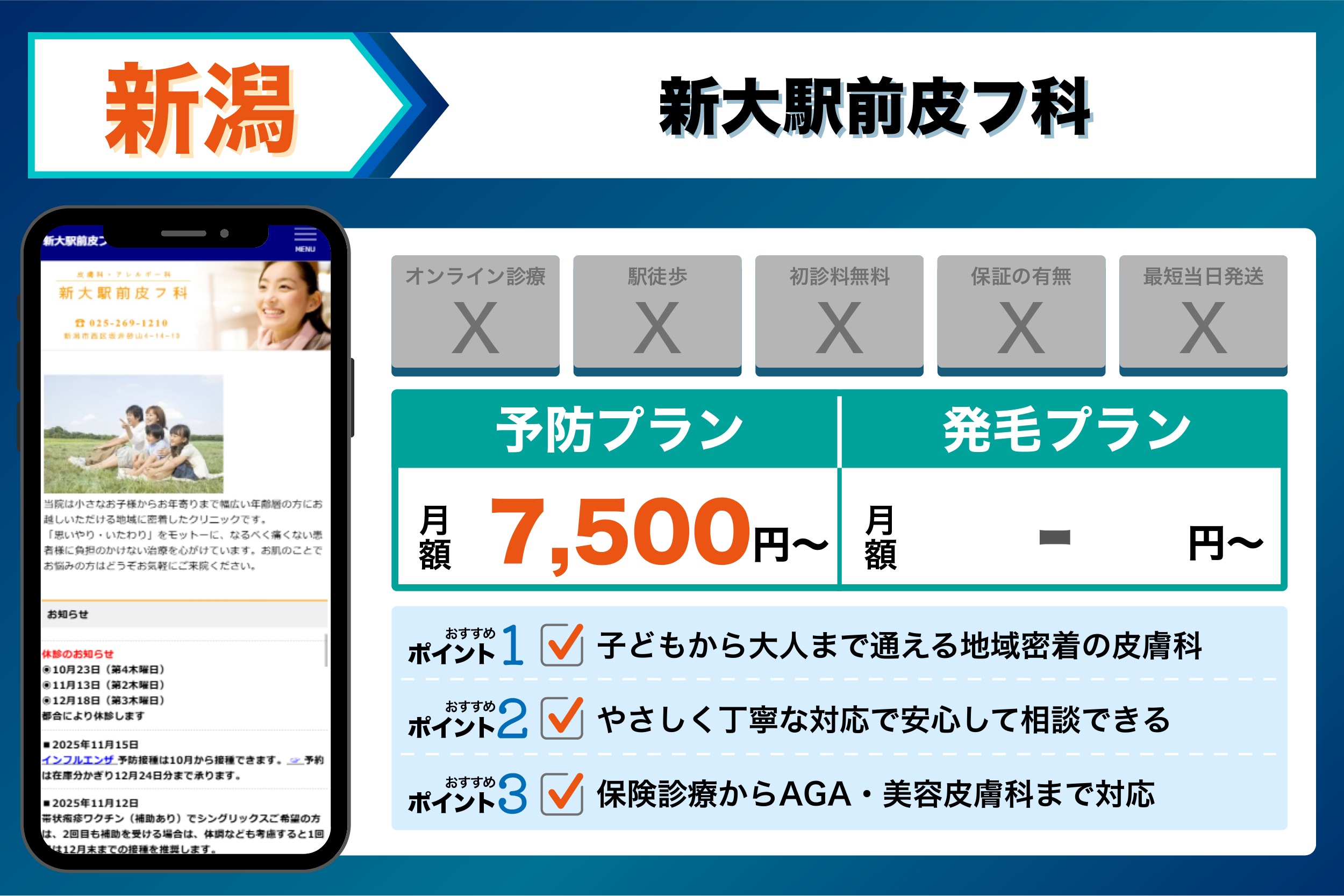 新潟のAGAクリニックを調査してことで、AGA治療の平均相場・駅からのアクセス・初心者でも始めやすいサポート体制が整っているクリニックが明らかになりました。