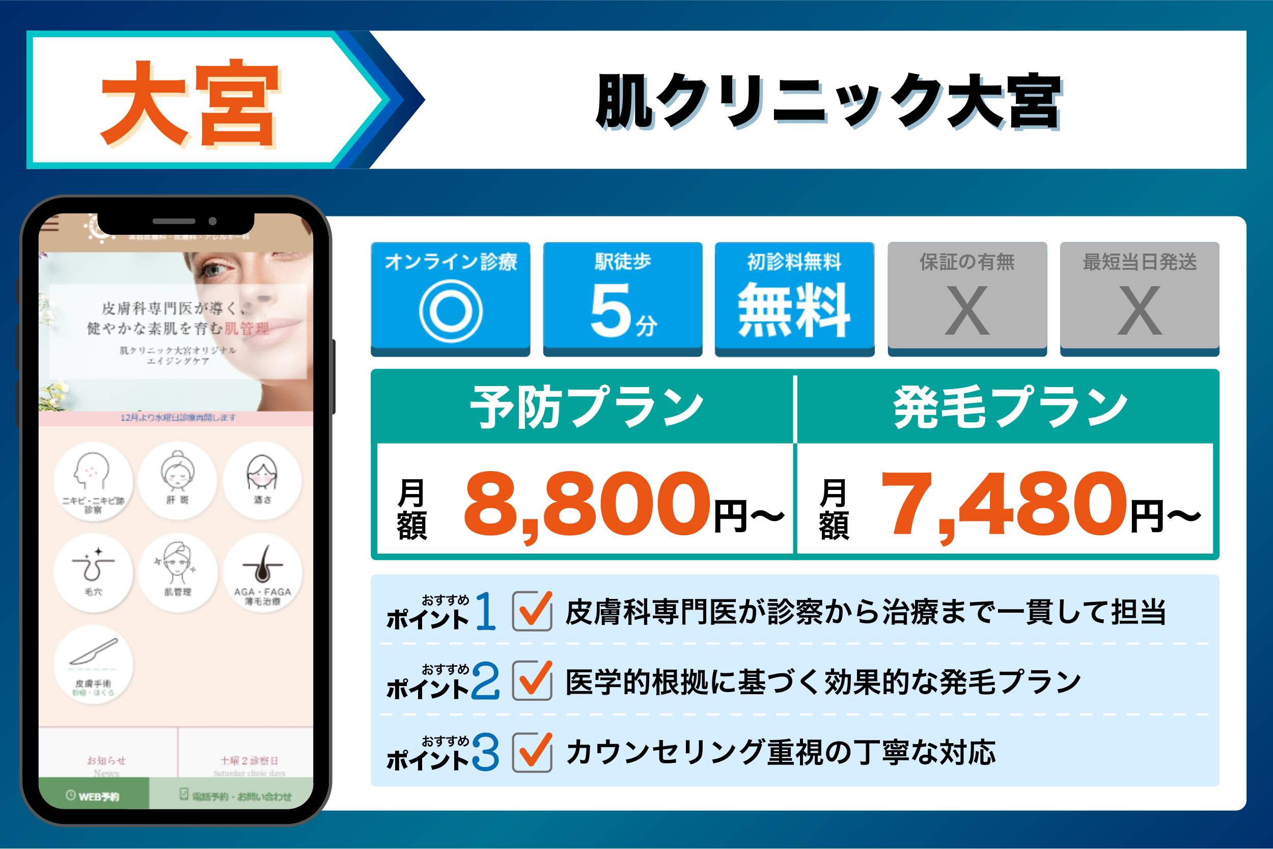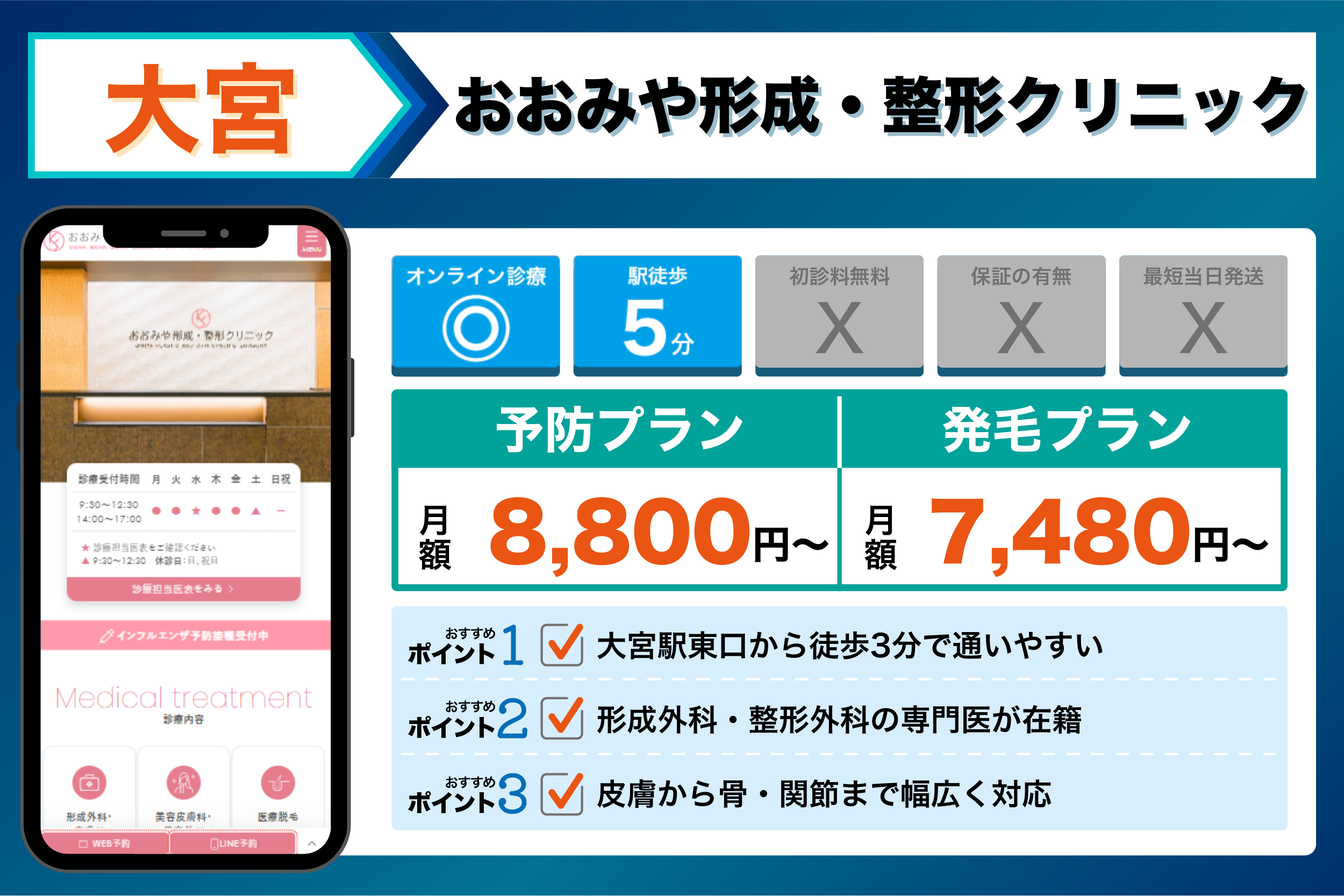 当編集部が大宮の主要クリニックを調査した結果、重視するポイントごとに以下のような傾向が見られました。
