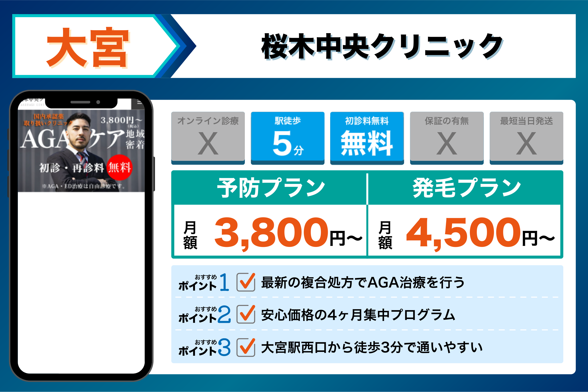 今回大宮のAGAクリニックを厳選するにあたり重視した選定基準は以下の4点になっています。大宮にあるAGAクリニック合計10院を調査しました。