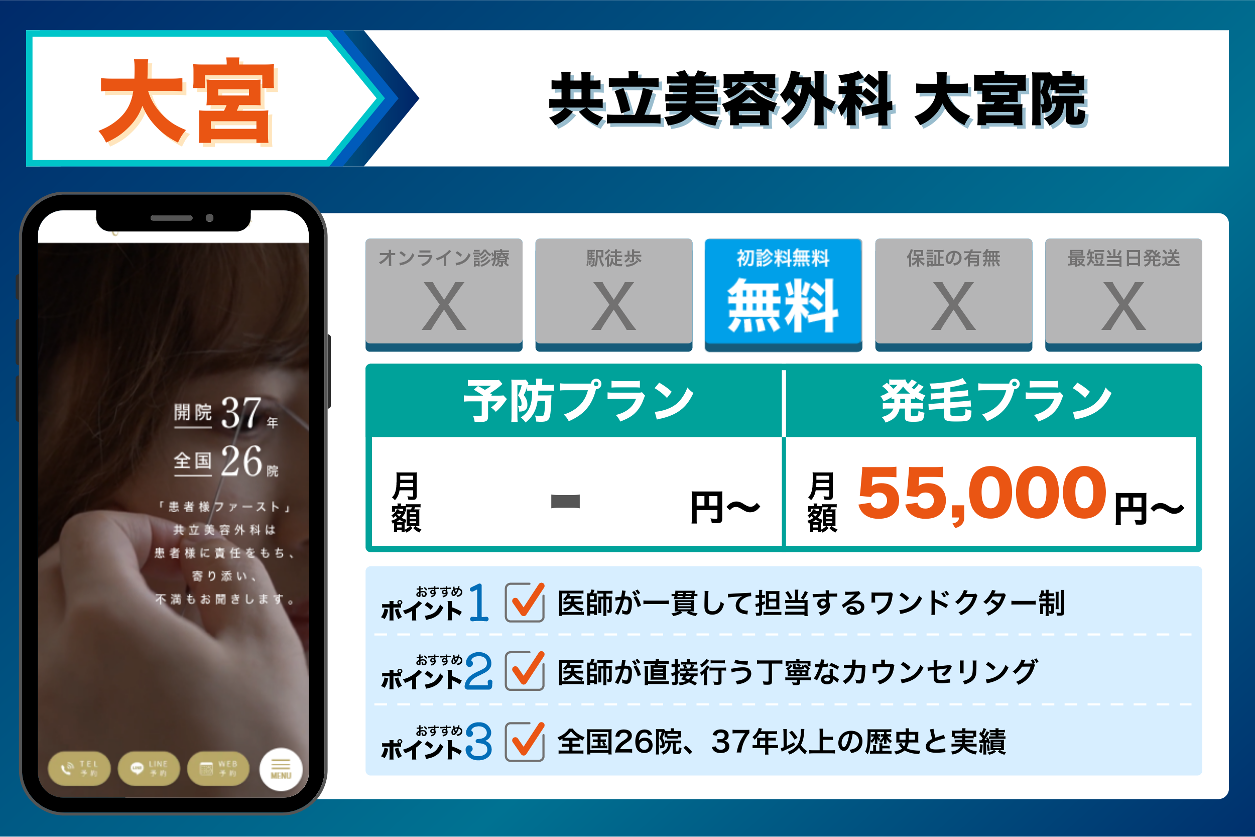 当編集部が大宮の主要クリニックを調査した結果、重視するポイントごとに以下のような傾向が見られました。